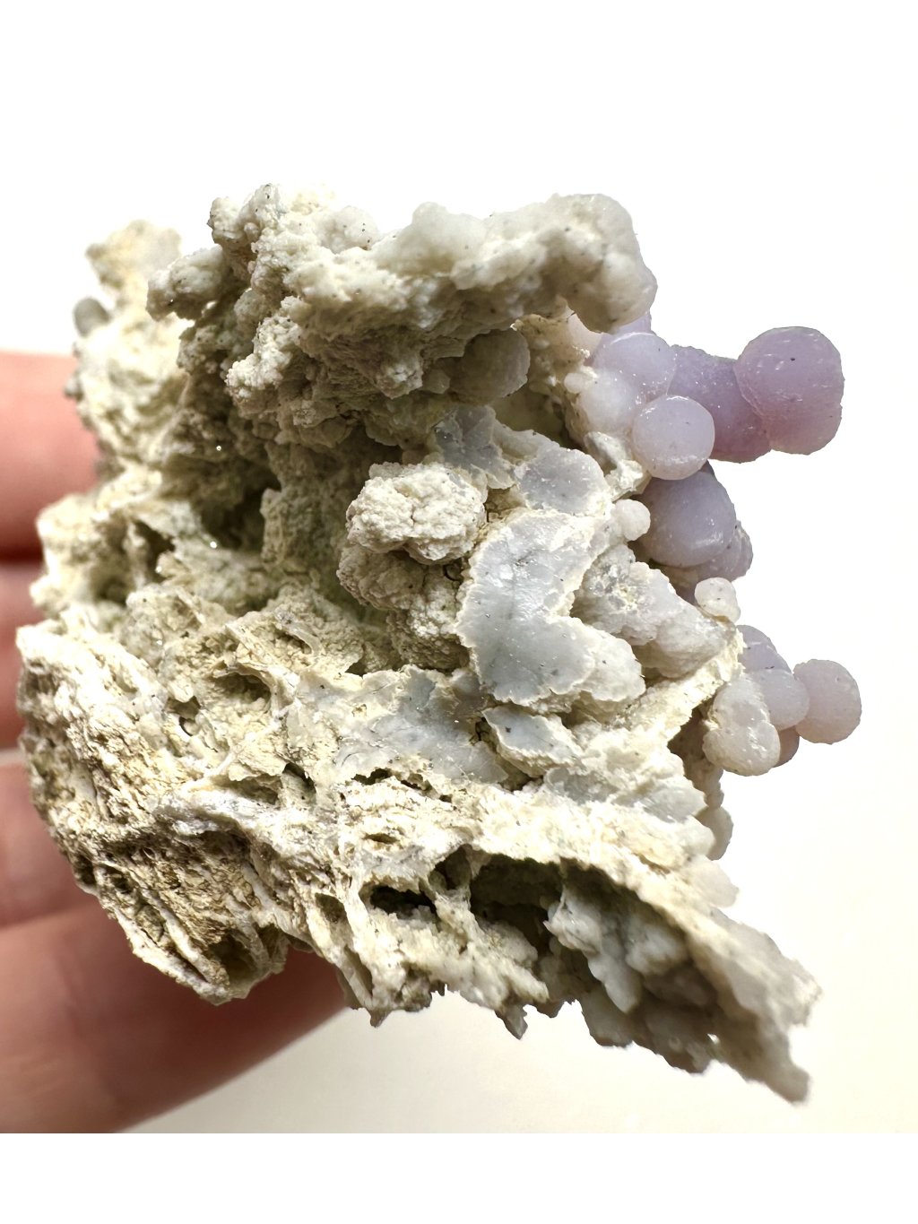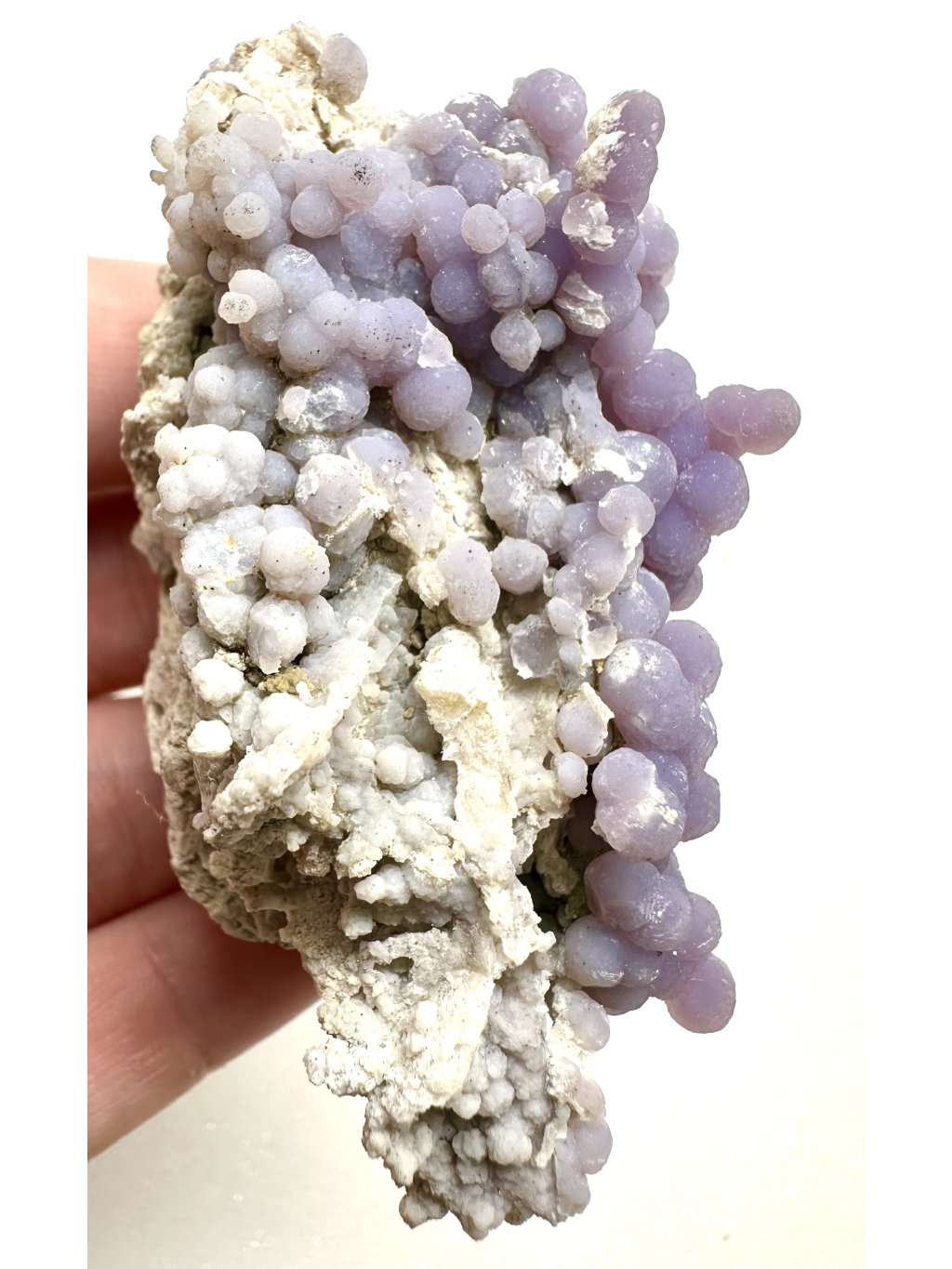 Traubenchalcedone sind bekannt für ihre zarten bis intensiven Farben, insbesondere Violett und Grün. Die violette Farbe wird durch das Vorhandensein von Manganverursacht, während die selteneren grünen Exemplare ihre Farbe durch andere Verunreinigungen im Gestein erhalten. Die Proben können auch mit winzigen Quarzkristallen bedeckt sein, die ihnen ein glänzendes Aussehen verleihen.