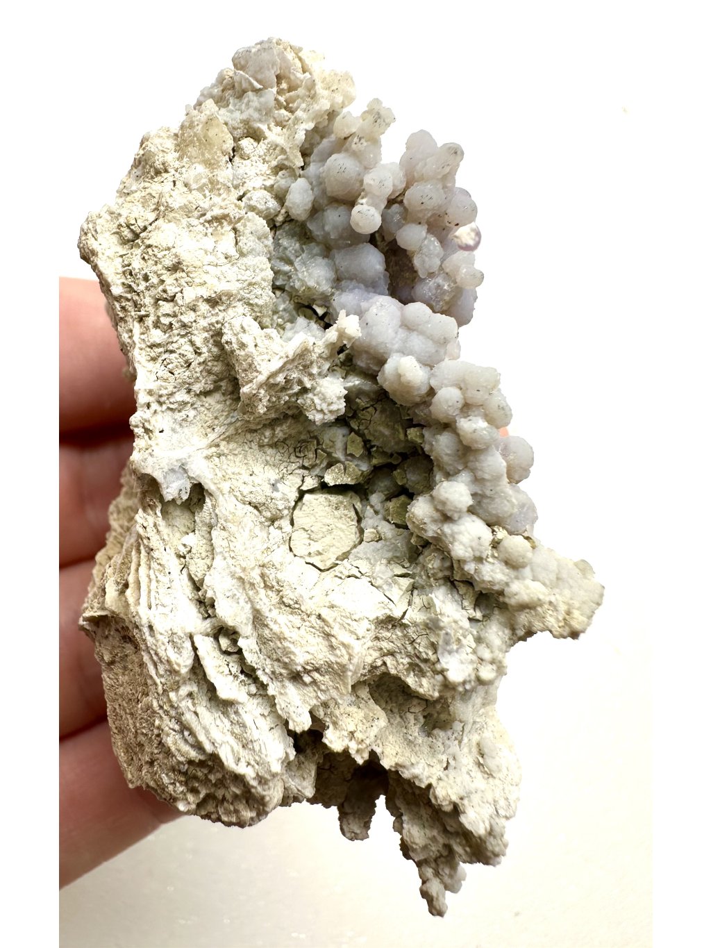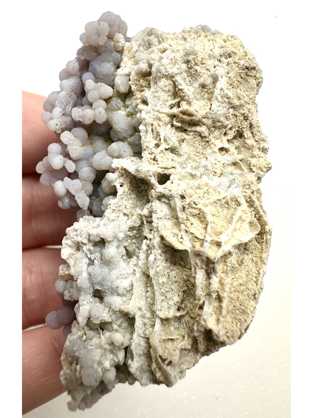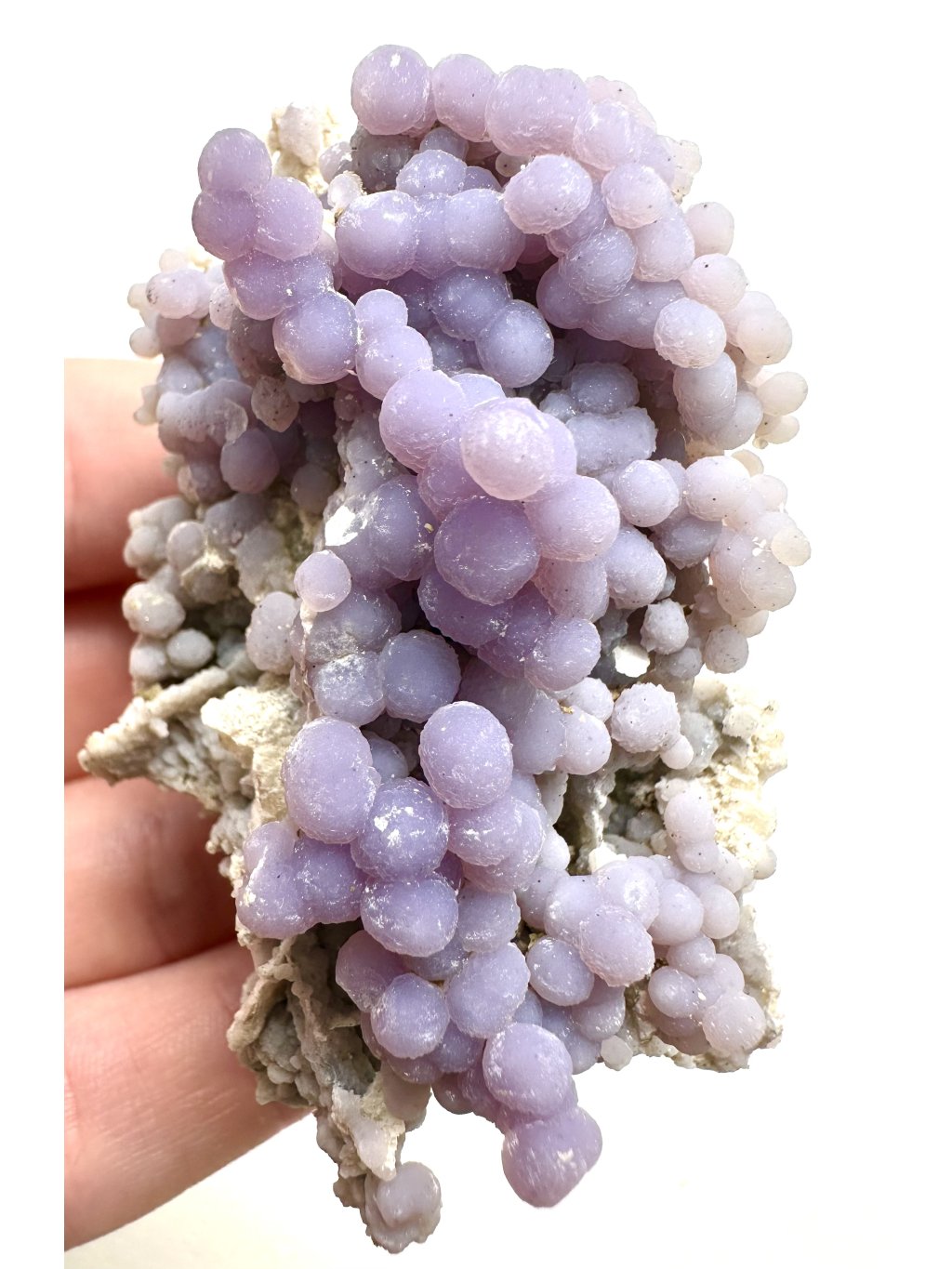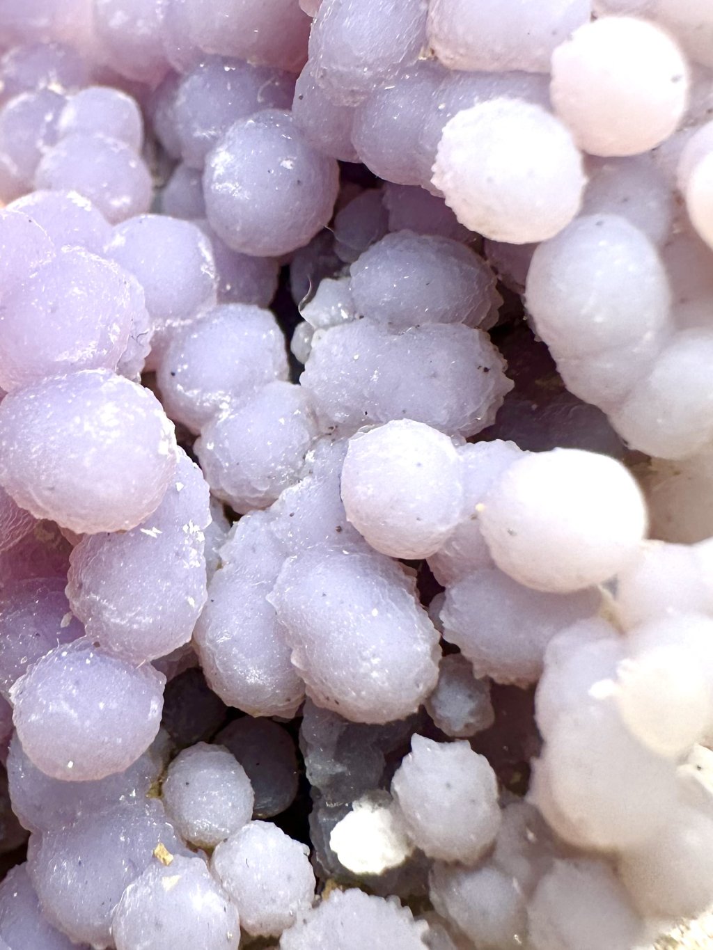 Traubenchalcedon ist eine relativ neue Entdeckung auf dem Mineralienmarkt. Die ersten Proben wurden 2016 auf der indonesischen Insel Sulawesi gefunden, und zwar im Gebiet von Manakarra. Traubenchalcedon ist eine Varietät von Quarz und zeichnet sich durch charakteristische kugelförmige Aggregate aus, die als Sphärolithen bezeichnet werden und durch Ausfällung aus kieselsäurereichen (SiO₂) geleeartigen Lösungen entstehen. Diese kugelförmigen Strukturen, die oft bis zu 1 cm groß sind, bestehen aus feinen Fäden gleicher Länge, die dicht aneinander gepackt sind. Die einzelnen Kugeln sind oft miteinander oder mit dem darunter liegenden Gestein verschmolzen und bilden eine Form, die an eine Weintraube erinnert, daher auch der Name.