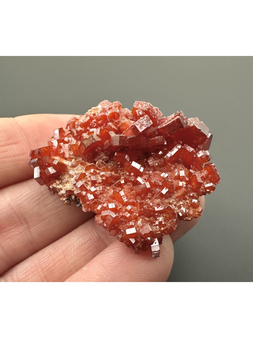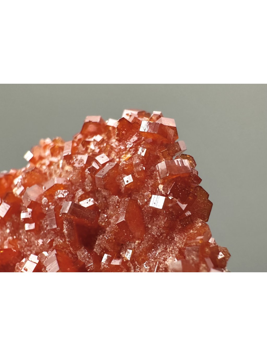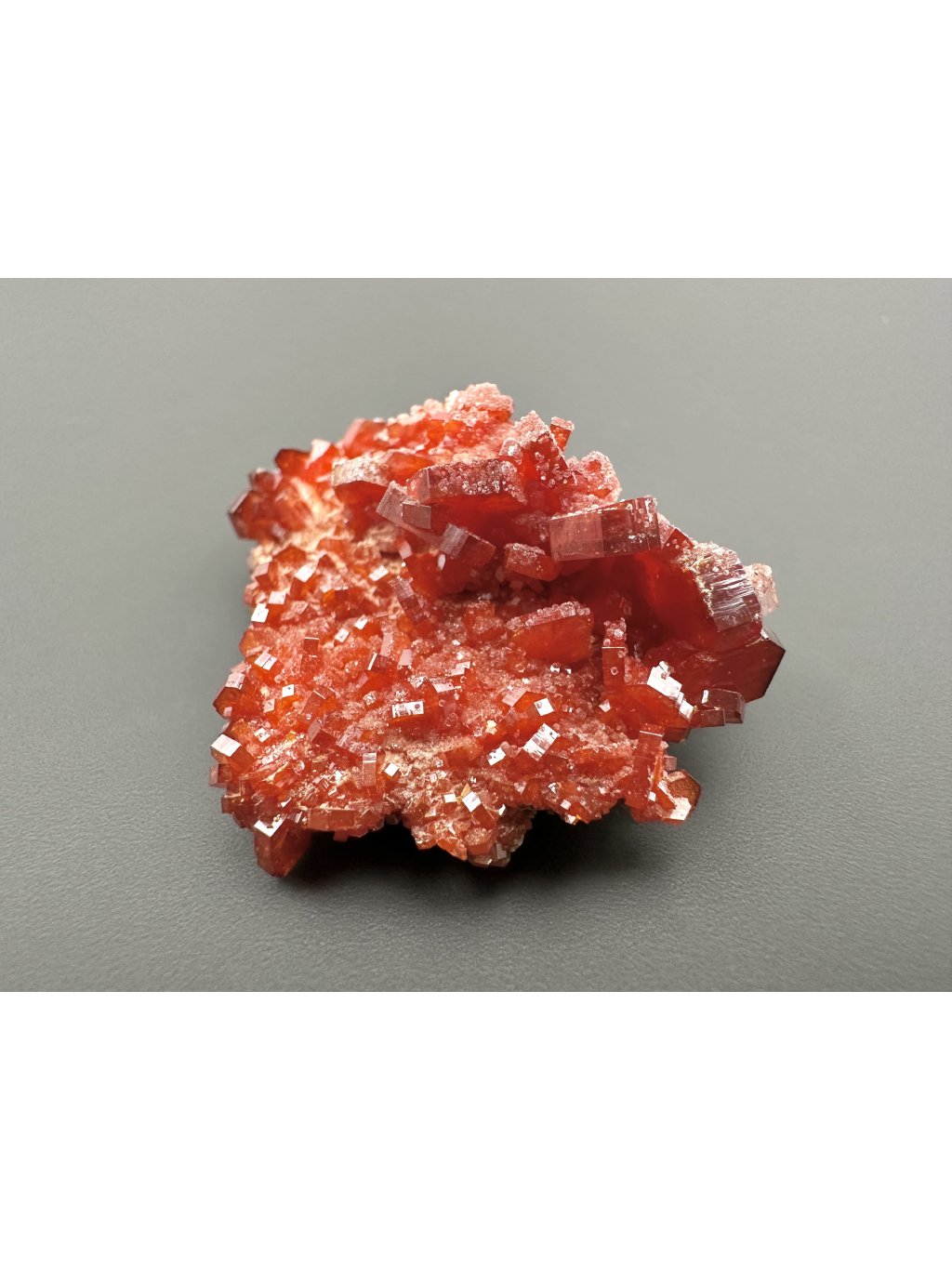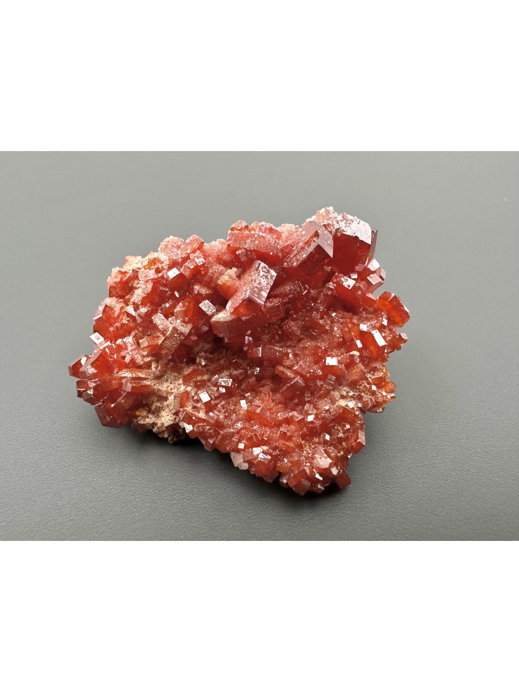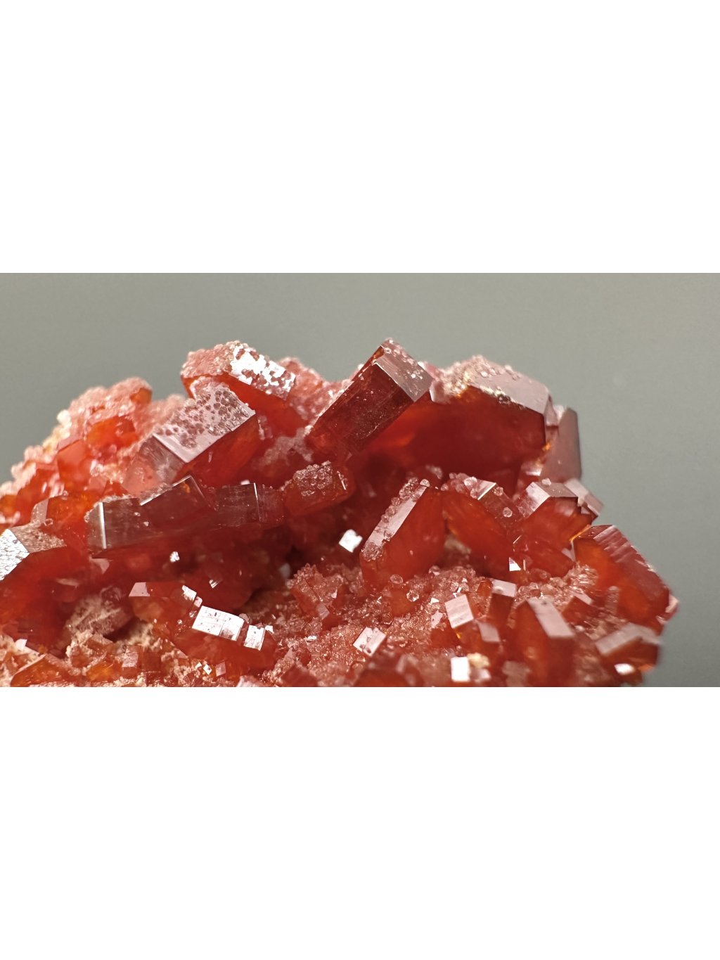 Vanadinit hat die chemische Formel Pb₅(VO₄)₃Cl, und seine Hauptbestandteile sind Blei, Vanadium und Chlor. Es enthält auch geringe Mengen an Phosphor und Arsen, das das Vanadium in seiner Struktur teilweise ersetzen kann. Es kommt typischerweise in Rot-, Orange-, Braun- und manchmal Gelbtönen vor. Die Farbe hängt vom Vanadium- und Spurenelementgehalt des Minerals ab. Vanadinit bildet hexagonale (sechseckige) Kristalle, die oft perfekt ausgebildet sind. Er kann auch sternförmige, körnige oder massive Aggregate bilden. Vanadinitkristalle haben einen hohen glasigen bis diamantartigen Glanz, der zu ihrem attraktiven Aussehen und ihrer Beliebtheit bei Mineraliensammlern beiträgt.