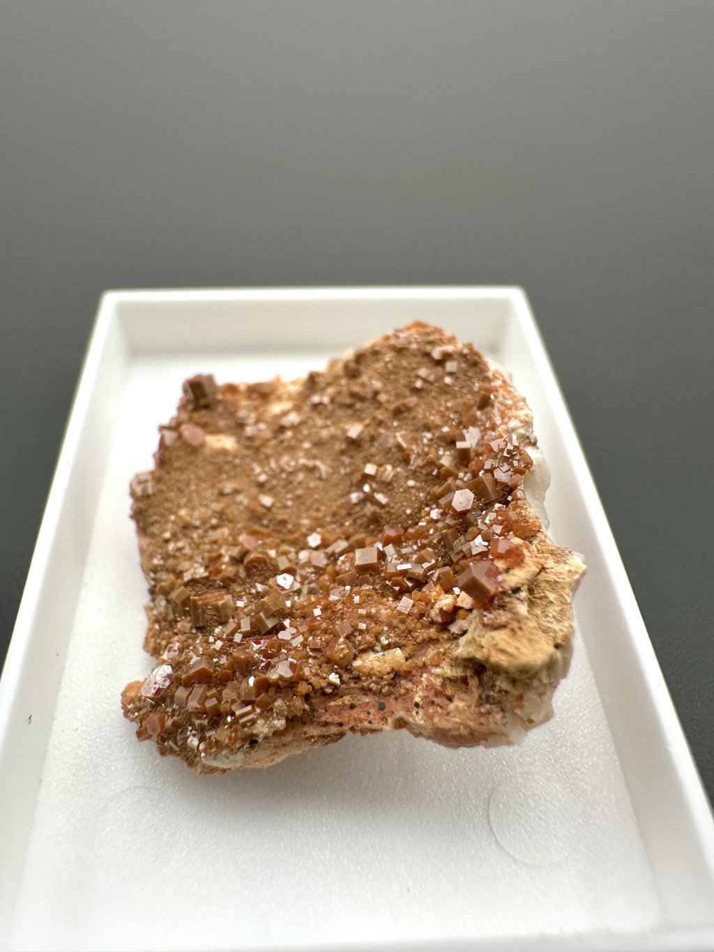 Vanadinit hat die chemische Formel Pb₅(VO₄)₃Cl, und seine Hauptbestandteile sind Blei, Vanadium und Chlor. Es enthält auch geringe Mengen an Phosphor und Arsen, das das Vanadium in seiner Struktur teilweise ersetzen kann. Es kommt typischerweise in Rot-, Orange-, Braun- und manchmal Gelbtönen vor. Die Farbe hängt vom Vanadium- und Spurenelementgehalt des Minerals ab. Vanadinit bildet hexagonale (sechseckige) Kristalle, die oft perfekt ausgebildet sind. Er kann auch sternförmige, körnige oder massive Aggregate bilden. Vanadinitkristalle haben einen hohen glasigen bis diamantartigen Glanz, der zu ihrem attraktiven Aussehen und ihrer Beliebtheit bei Mineraliensammlern beiträgt.