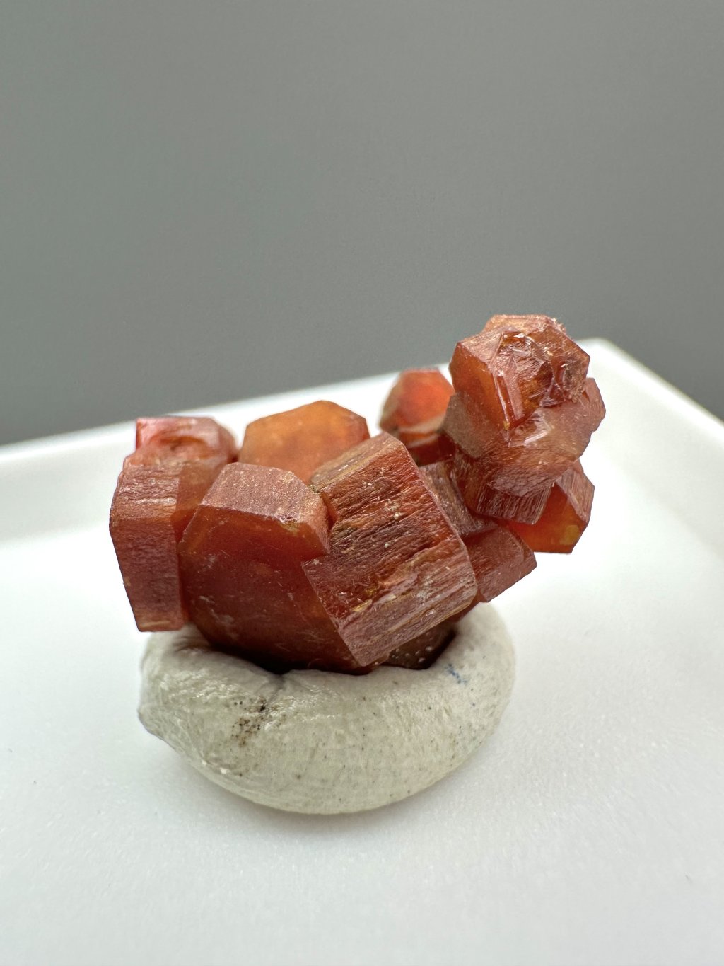 Vanadinit hat die chemische Formel Pb₅(VO₄)₃Cl, und seine Hauptbestandteile sind Blei, Vanadium und Chlor. Es enthält auch geringe Mengen an Phosphor und Arsen, das das Vanadium in seiner Struktur teilweise ersetzen kann. Es kommt typischerweise in Rot-, Orange-, Braun- und manchmal Gelbtönen vor. Die Farbe hängt vom Vanadium- und Spurenelementgehalt des Minerals ab. Vanadinit bildet hexagonale (sechseckige) Kristalle, die oft perfekt ausgebildet sind. Er kann auch sternförmige, körnige oder massive Aggregate bilden. Vanadinitkristalle haben einen hohen glasigen bis diamantartigen Glanz, der zu ihrem attraktiven Aussehen und ihrer Beliebtheit bei Mineraliensammlern beiträgt.