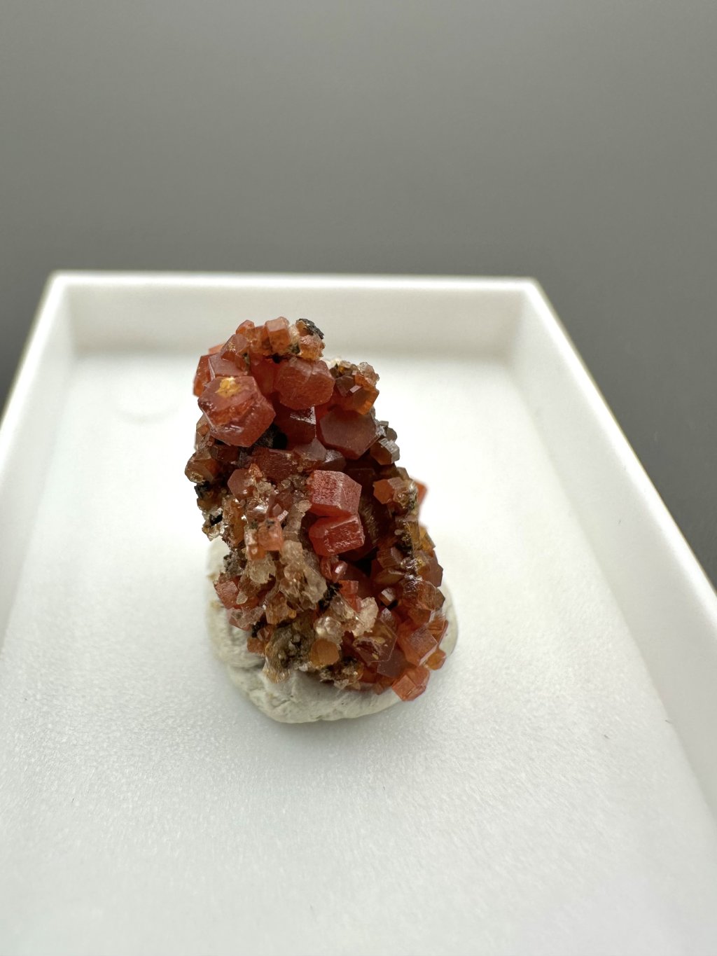 Vanadinit hat die chemische Formel Pb₅(VO₄)₃Cl, und seine Hauptbestandteile sind Blei, Vanadium und Chlor. Es enthält auch geringe Mengen an Phosphor und Arsen, das das Vanadium in seiner Struktur teilweise ersetzen kann. Es kommt typischerweise in Rot-, Orange-, Braun- und manchmal Gelbtönen vor. Die Farbe hängt vom Vanadium- und Spurenelementgehalt des Minerals ab. Vanadinit bildet hexagonale (sechseckige) Kristalle, die oft perfekt ausgebildet sind. Er kann auch sternförmige, körnige oder massive Aggregate bilden. Vanadinitkristalle haben einen hohen glasigen bis diamantartigen Glanz, der zu ihrem attraktiven Aussehen und ihrer Beliebtheit bei Mineraliensammlern beiträgt.