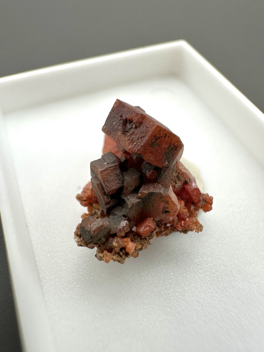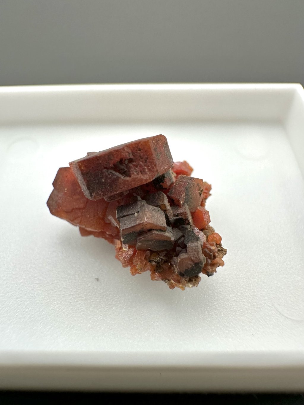 Vanadinit bildet oft schöne Kompositionen mit Baryt, wodurch sehr ästhetische Sammlerstücke entstehen. In einigen Fällen kann der Baryt, der normalerweise weiß oder gelblich ist, mit Mangansalzen bedeckt sein. Die Mangansalze verleihen dem Baryt dunkelbraune bis schwarze Farbtöne, die einen Kontrast zu den Vanadinitkristallen bilden. Diese Kristalle kommen typischerweise in leuchtendem Rot oder Orange vor und bilden eine optisch attraktive Kombination aus