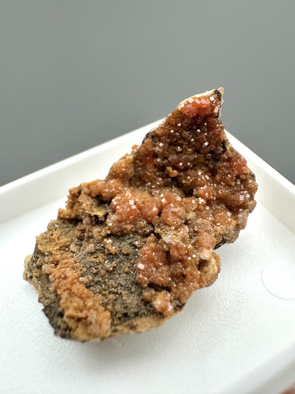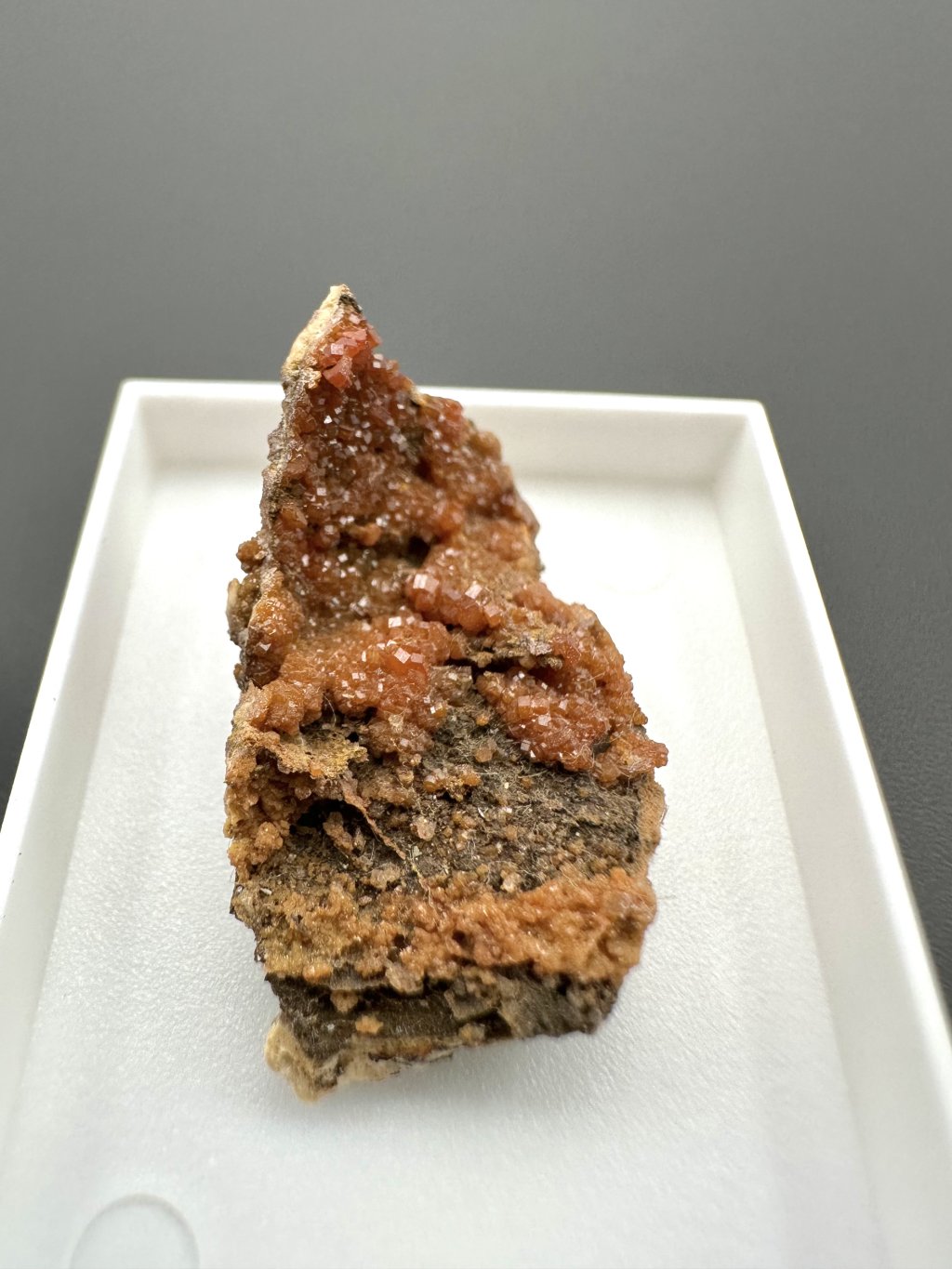Vanadinit hat die chemische Formel Pb₅(VO₄)₃Cl, und seine Hauptbestandteile sind Blei, Vanadium und Chlor. Es enthält auch geringe Mengen an Phosphor und Arsen, das das Vanadium in seiner Struktur teilweise ersetzen kann. Es kommt typischerweise in Rot-, Orange-, Braun- und manchmal Gelbtönen vor. Die Farbe hängt vom Vanadium- und Spurenelementgehalt des Minerals ab. Vanadinit bildet hexagonale (sechseckige) Kristalle, die oft perfekt ausgebildet sind. Er kann auch sternförmige, körnige oder massive Aggregate bilden. Vanadinitkristalle haben einen hohen glasigen bis diamantartigen Glanz, der zu ihrem attraktiven Aussehen und ihrer Beliebtheit bei Mineraliensammlern beiträgt.