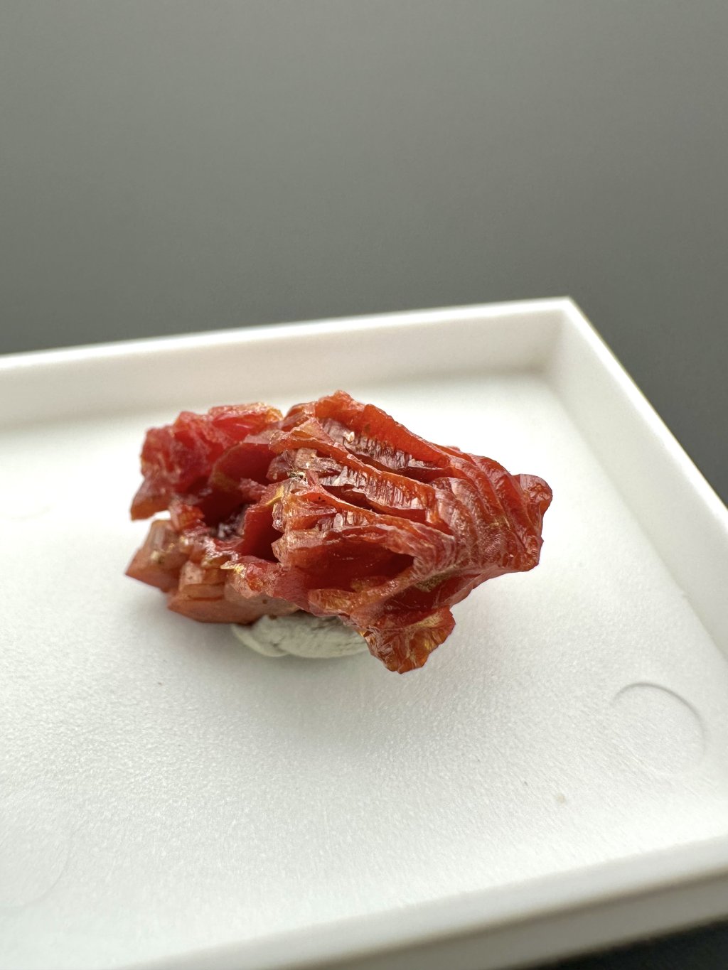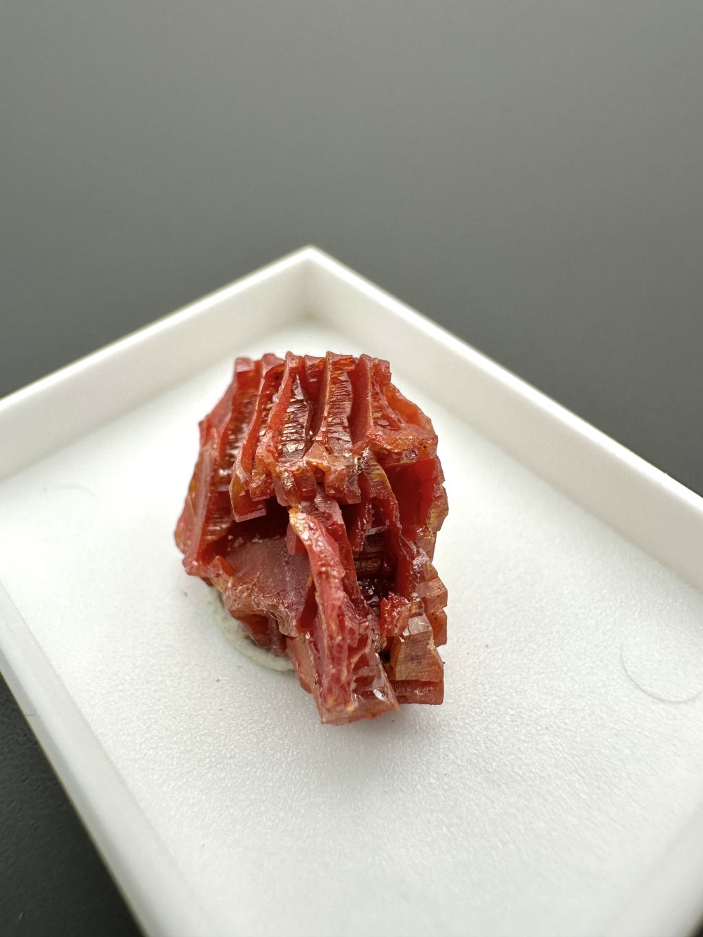 Vanadinit hat die chemische Formel Pb₅(VO₄)₃Cl, und seine Hauptbestandteile sind Blei, Vanadium und Chlor. Es enthält auch geringe Mengen an Phosphor und Arsen, das das Vanadium in seiner Struktur teilweise ersetzen kann. Es kommt typischerweise in Rot-, Orange-, Braun- und manchmal Gelbtönen vor. Die Farbe hängt vom Vanadium- und Spurenelementgehalt des Minerals ab. Vanadinit bildet hexagonale (sechseckige) Kristalle, die oft perfekt ausgebildet sind. Er kann auch sternförmige, körnige oder massive Aggregate bilden. Vanadinitkristalle haben einen hohen glasigen bis diamantartigen Glanz, der zu ihrem attraktiven Aussehen und ihrer Beliebtheit bei Mineraliensammlern beiträgt.