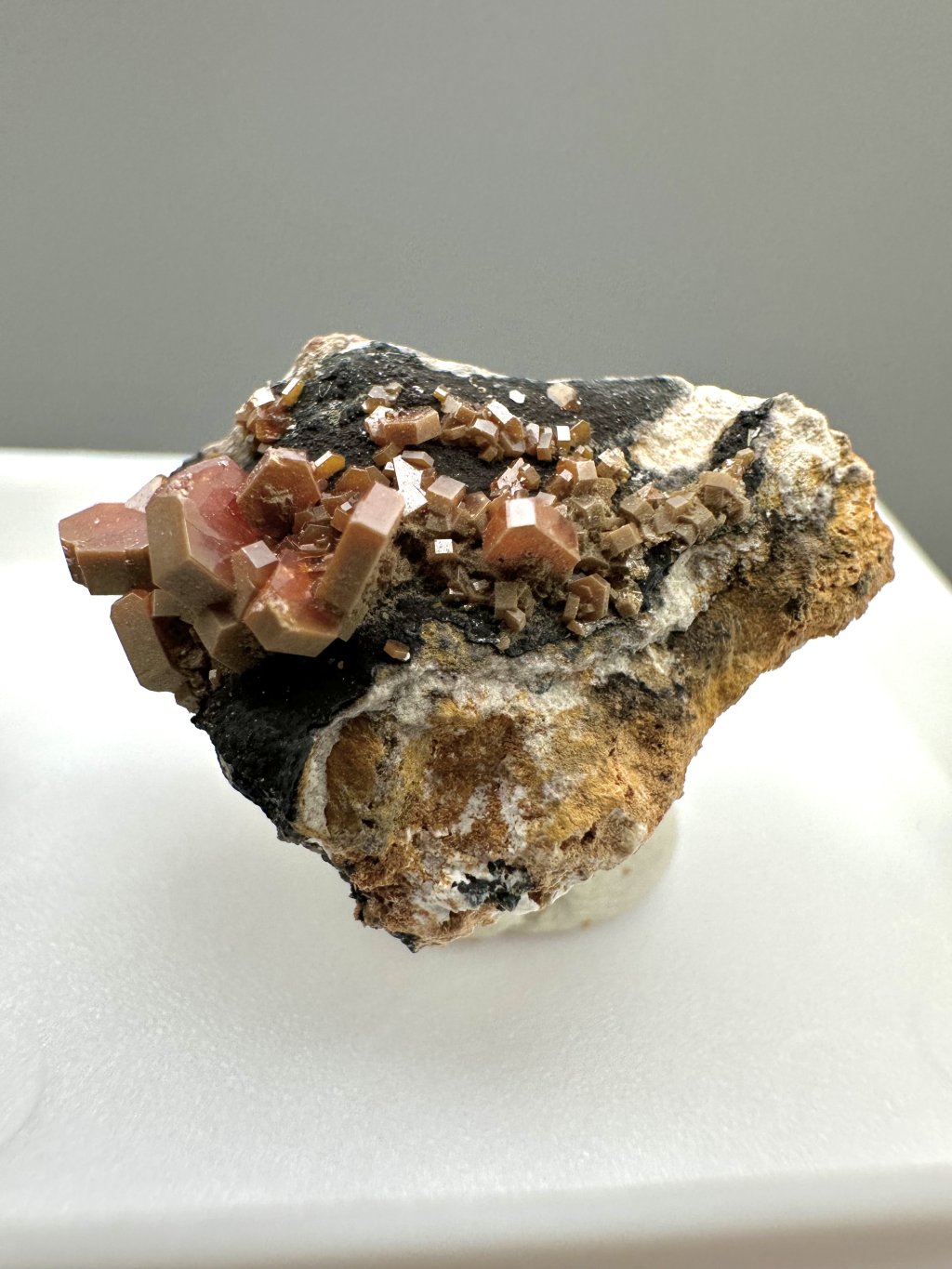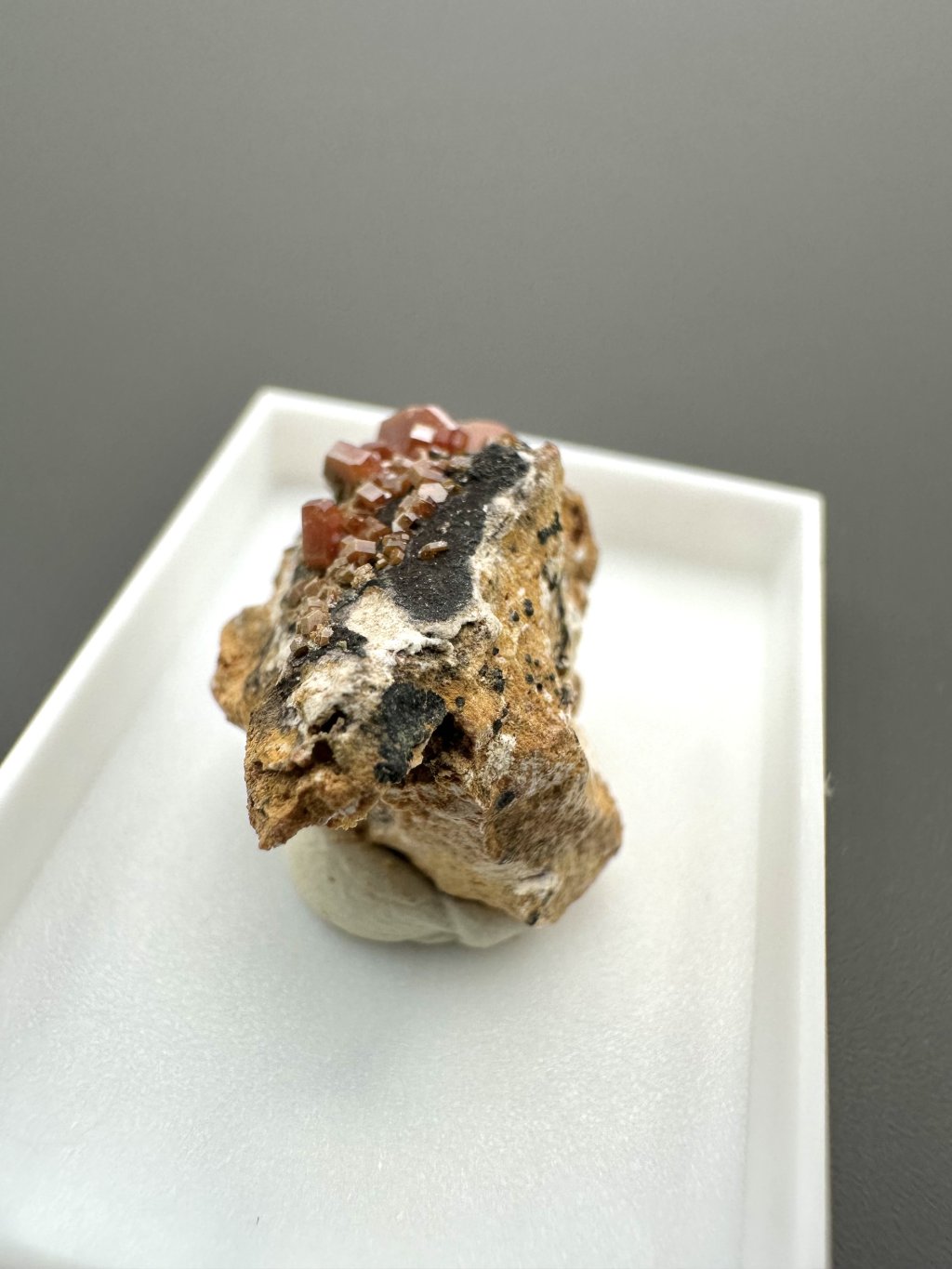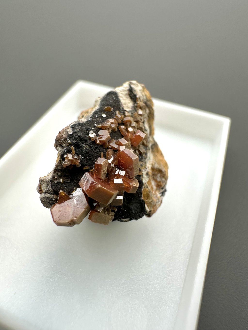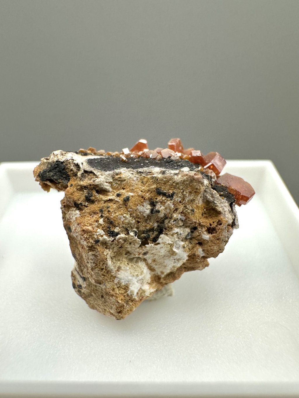 Vanadinit bildet oft schöne Kompositionen mit Baryt, wodurch sehr ästhetische Sammlerstücke entstehen. In einigen Fällen kann der Baryt, der normalerweise weiß oder gelblich ist, mit Mangansalzen bedeckt sein. Die Mangansalze verleihen dem Baryt dunkelbraune bis schwarze Farbtöne, die einen Kontrast zu den Vanadinitkristallen bilden. Diese Kristalle kommen typischerweise in leuchtendem Rot oder Orange vor und bilden eine optisch attraktive Kombination aus