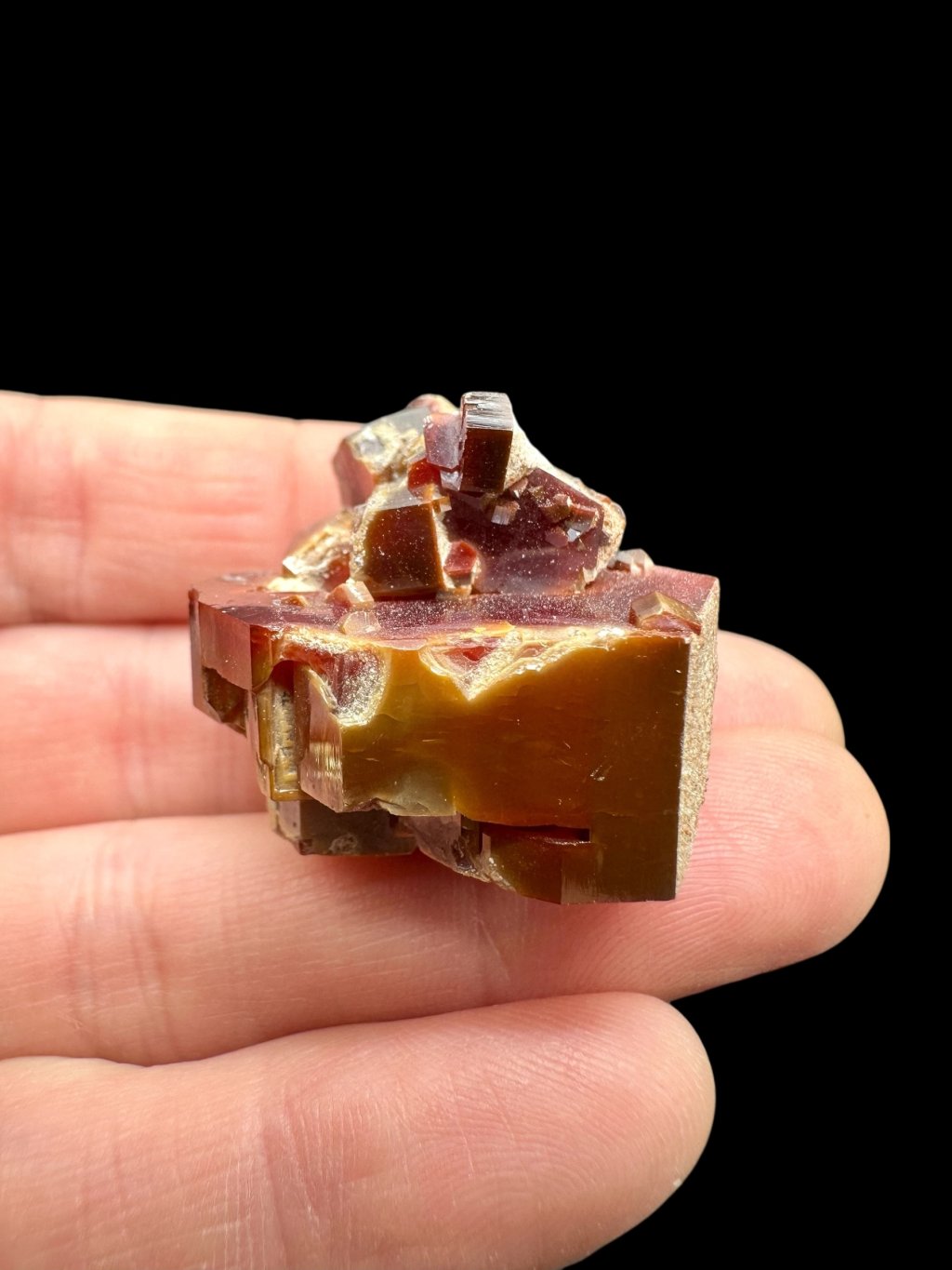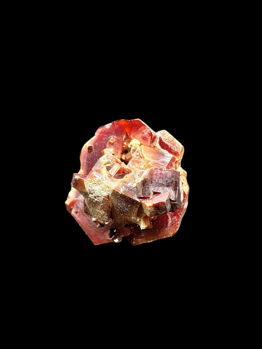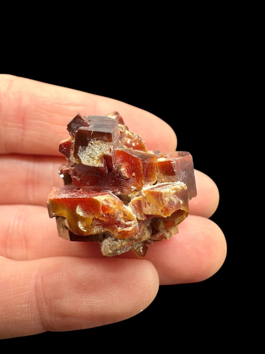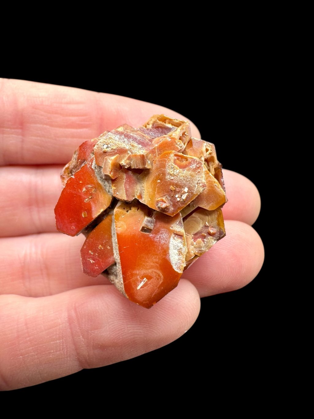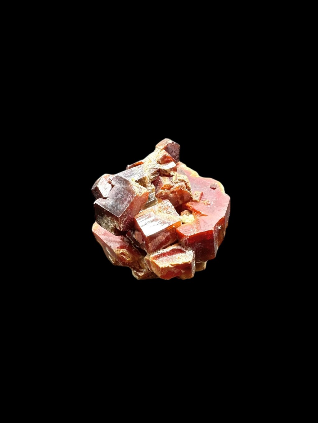 Vanadinit hat die chemische Formel Pb₅(VO₄)₃Cl, und seine Hauptbestandteile sind Blei, Vanadium und Chlor. Es enthält auch geringe Mengen an Phosphor und Arsen, das das Vanadium in seiner Struktur teilweise ersetzen kann. Es kommt typischerweise in Rot-, Orange-, Braun- und manchmal Gelbtönen vor. Die Farbe hängt vom Vanadium- und Spurenelementgehalt des Minerals ab. Vanadinit bildet hexagonale (sechseckige) Kristalle, die oft perfekt ausgebildet sind. Er kann auch sternförmige, körnige oder massive Aggregate bilden. Vanadinitkristalle haben einen hohen glasigen bis diamantartigen Glanz, der zu ihrem attraktiven Aussehen und ihrer Beliebtheit bei Mineraliensammlern beiträgt.