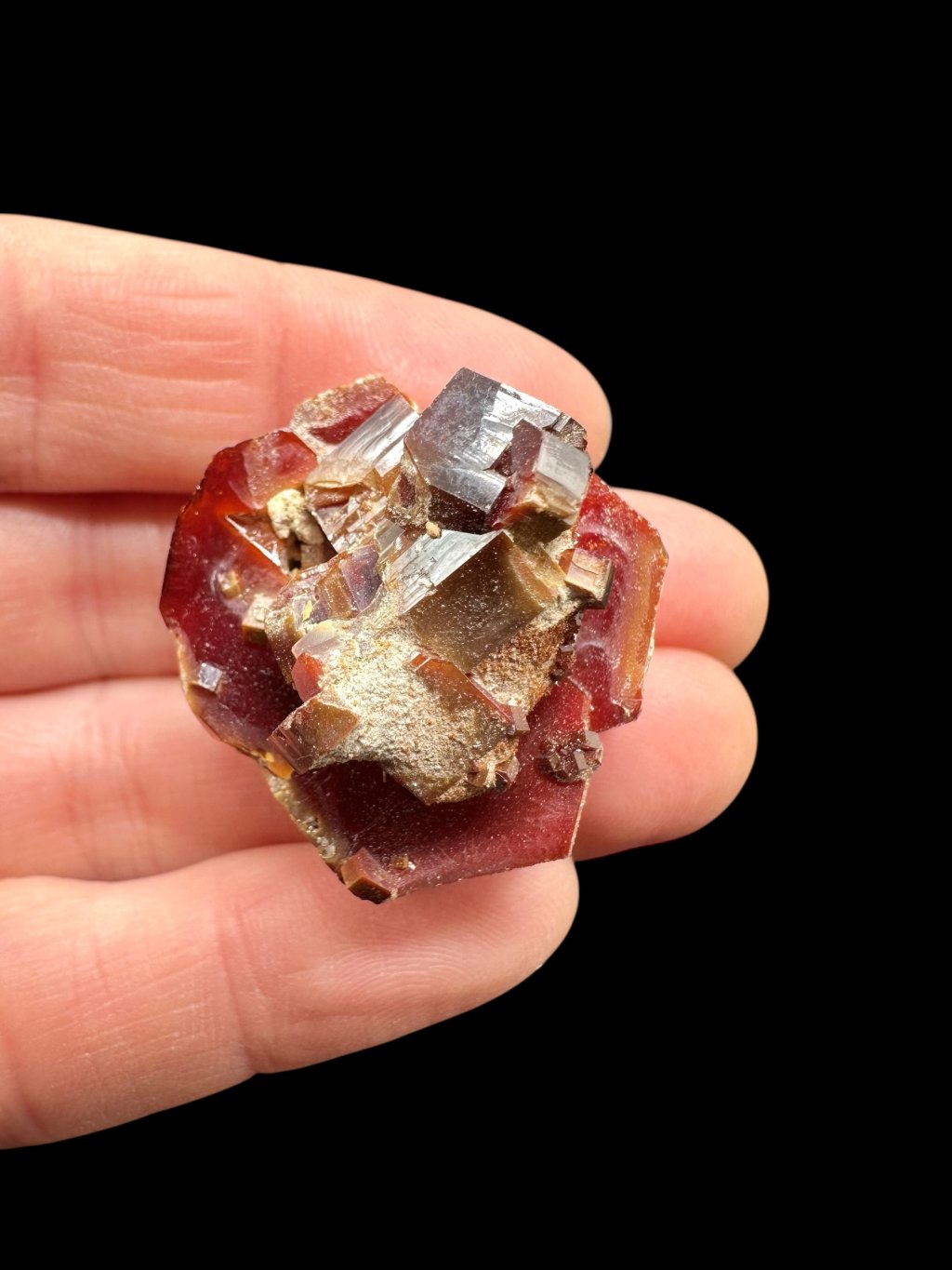Vanadinit bildet oft schöne Kompositionen mit Baryt, wodurch sehr ästhetische Sammlerstücke entstehen. In einigen Fällen kann der Baryt, der normalerweise weiß oder gelblich ist, mit Mangansalzen bedeckt sein. Die Mangansalze verleihen dem Baryt dunkelbraune bis schwarze Farbtöne, die einen Kontrast zu den Vanadinitkristallen bilden. Diese Kristalle kommen typischerweise in leuchtendem Rot oder Orange vor und bilden eine optisch attraktive Kombination aus