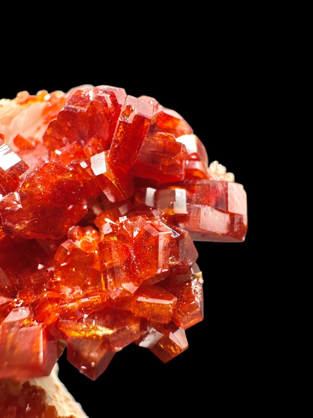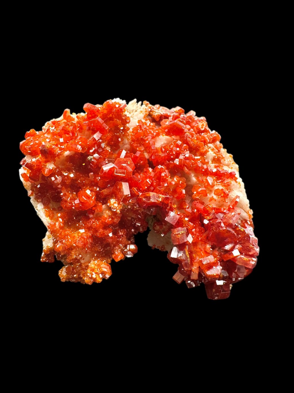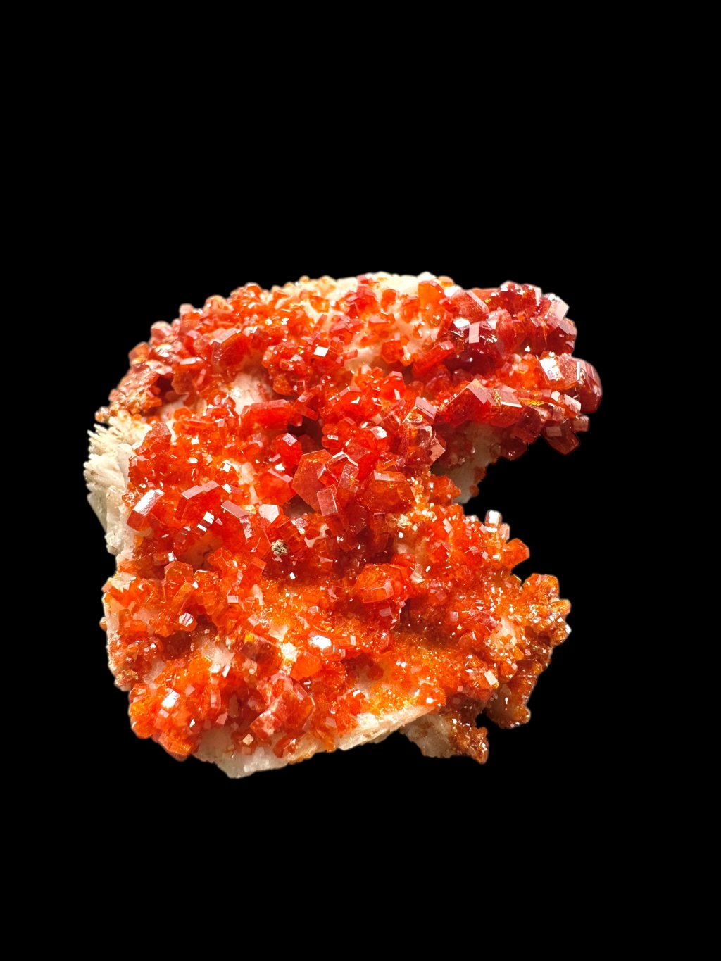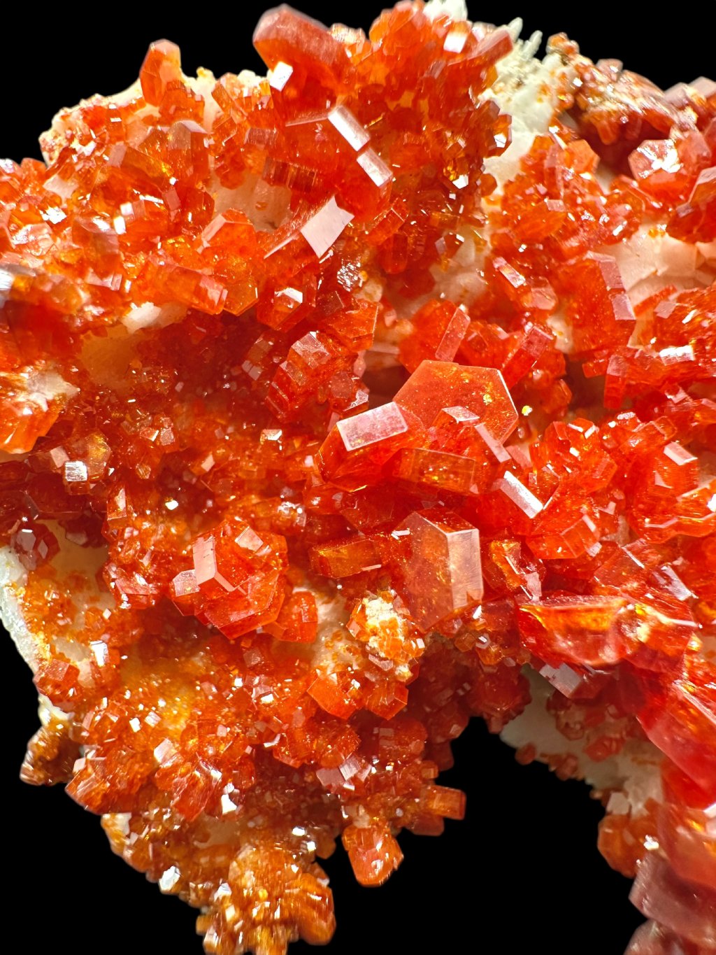 Vanadinit hat die chemische Formel Pb₅(VO₄)₃Cl, und seine Hauptbestandteile sind Blei, Vanadium und Chlor. Es enthält auch geringe Mengen an Phosphor und Arsen, das das Vanadium in seiner Struktur teilweise ersetzen kann. Es kommt typischerweise in Rot-, Orange-, Braun- und manchmal Gelbtönen vor. Die Farbe hängt vom Vanadium- und Spurenelementgehalt des Minerals ab. Vanadinit bildet hexagonale (sechseckige) Kristalle, die oft perfekt ausgebildet sind. Er kann auch sternförmige, körnige oder massive Aggregate bilden. Vanadinitkristalle haben einen hohen glasigen bis diamantartigen Glanz, der zu ihrem attraktiven Aussehen und ihrer Beliebtheit bei Mineraliensammlern beiträgt.