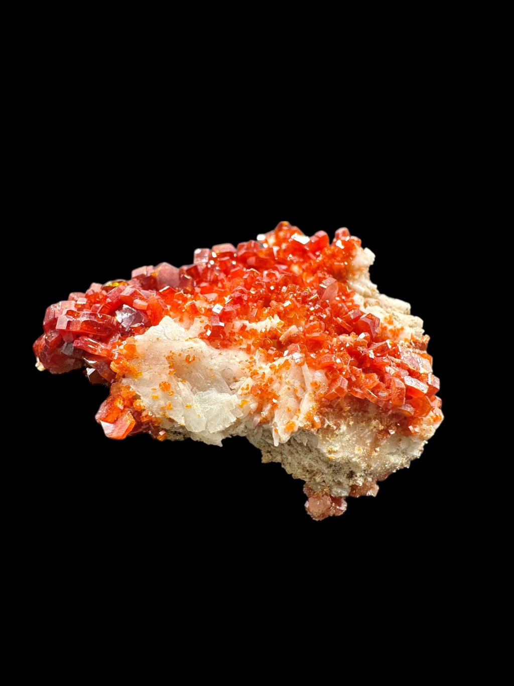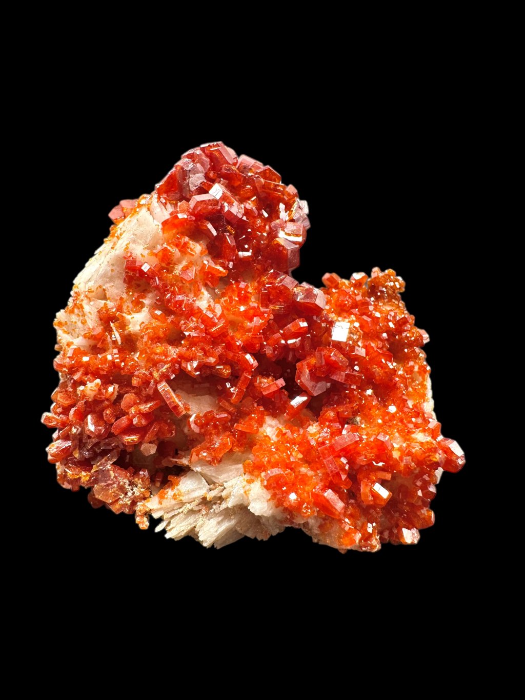 Vanadinit bildet oft schöne Kompositionen mit Baryt, wodurch sehr ästhetische Sammlerstücke entstehen. In einigen Fällen kann der Baryt, der normalerweise weiß oder gelblich ist, mit Mangansalzen bedeckt sein. Die Mangansalze verleihen dem Baryt dunkelbraune bis schwarze Farbtöne, die einen Kontrast zu den Vanadinitkristallen bilden. Diese Kristalle kommen typischerweise in leuchtendem Rot oder Orange vor und bilden eine optisch attraktive Kombination aus