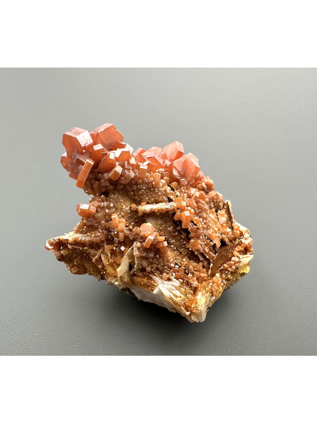 Vanadinit hat die chemische Formel Pb₅(VO₄)₃Cl, und seine Hauptbestandteile sind Blei, Vanadium und Chlor. Es enthält auch geringe Mengen an Phosphor und Arsen, das das Vanadium in seiner Struktur teilweise ersetzen kann. Es kommt typischerweise in Rot-, Orange-, Braun- und manchmal Gelbtönen vor. Die Farbe hängt vom Vanadium- und Spurenelementgehalt des Minerals ab. Vanadinit bildet hexagonale (sechseckige) Kristalle, die oft perfekt ausgebildet sind. Er kann auch sternförmige, körnige oder massive Aggregate bilden. Vanadinitkristalle haben einen hohen glasigen bis diamantartigen Glanz, der zu ihrem attraktiven Aussehen und ihrer Beliebtheit bei Mineraliensammlern beiträgt.