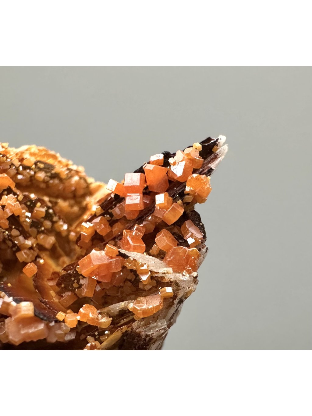 Vanadinit bildet oft schöne Kompositionen mit Baryt, wodurch sehr ästhetische Sammlerstücke entstehen. In einigen Fällen kann der Baryt, der normalerweise weiß oder gelblich ist, mit Mangansalzen bedeckt sein. Die Mangansalze verleihen dem Baryt dunkelbraune bis schwarze Farbtöne, die einen Kontrast zu den Vanadinitkristallen bilden. Diese Kristalle kommen typischerweise in leuchtendem Rot oder Orange vor und bilden eine optisch attraktive Kombination aus