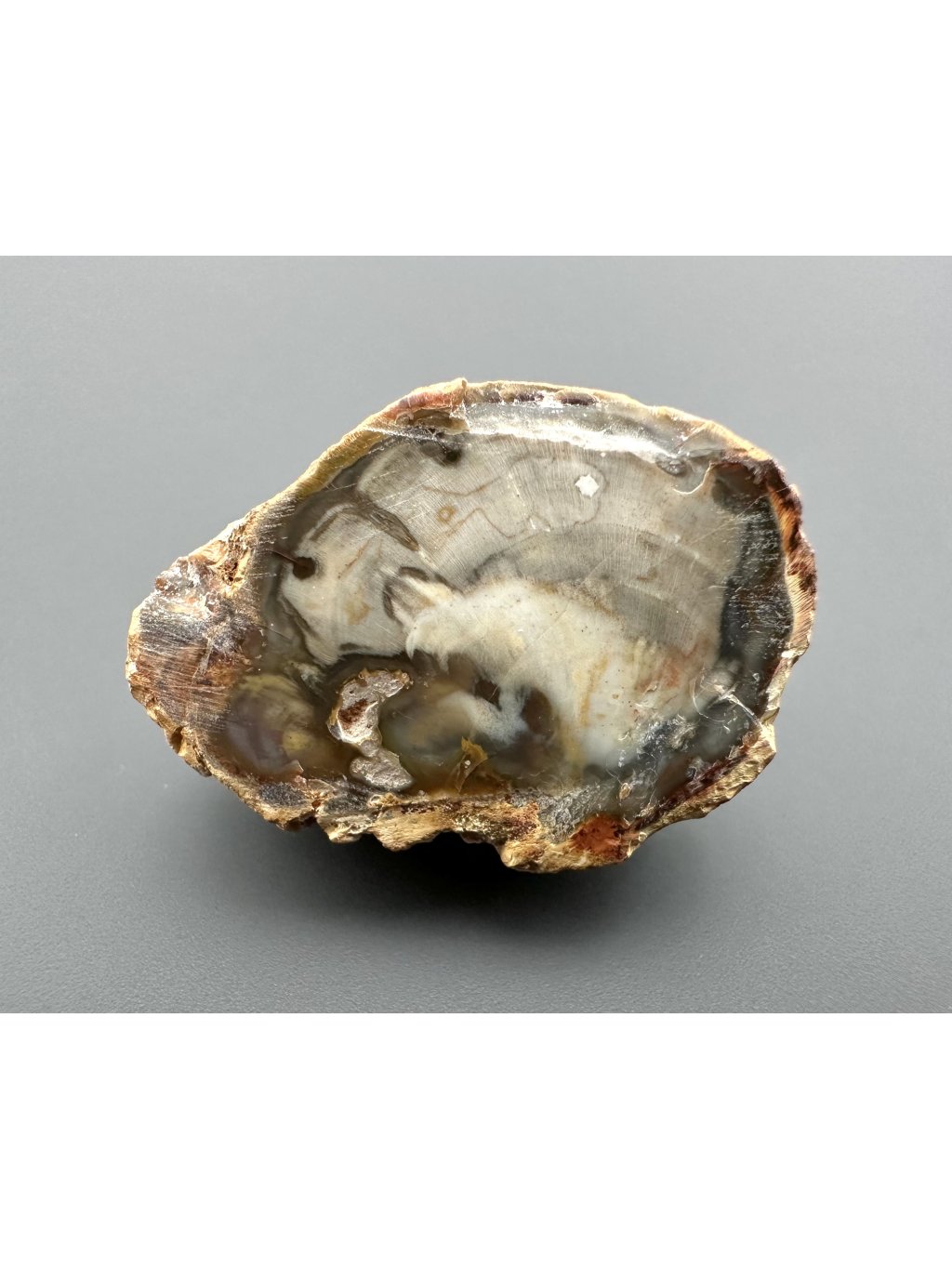 Fossilisierung: Der Prozess beginnt, wenn ein Baum fällt und schnell unter Sedimenten begraben wird, die ihn vor Zersetzung schützen. Mineralreiches Wasser sickert durch das Holz und Silikatminerale (wie Quarz, Chalcedon oder Opal) ersetzen allmählich das organische Material. Dieser Prozess wird als Permineralisierung bezeichnet.