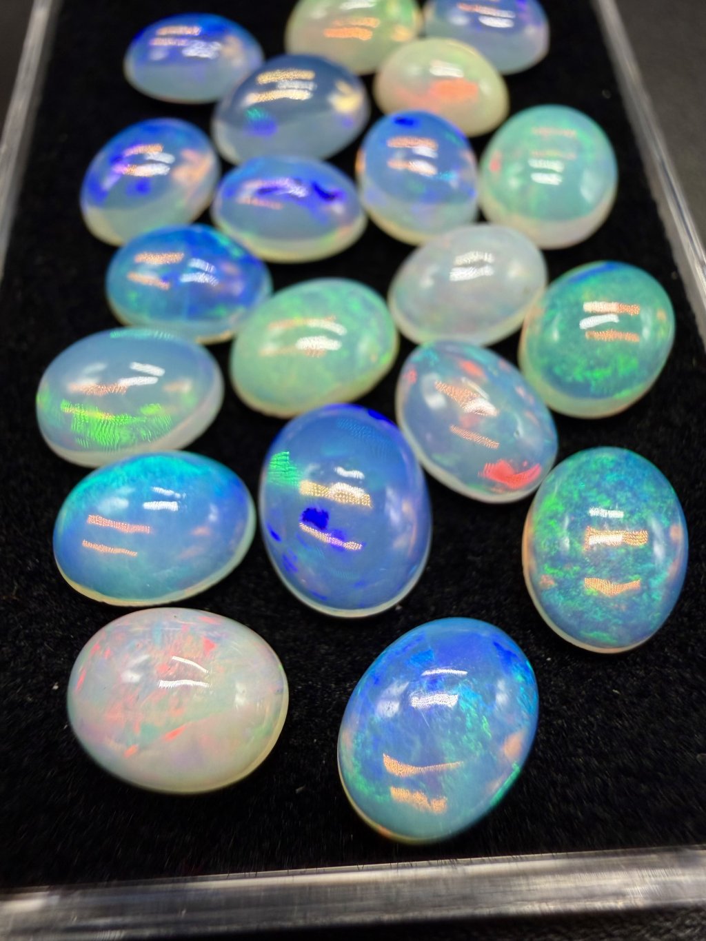 Etiopské opálové kabošony se vyznačují širokou škálou barev, od světlých mléčně bílých odstínů přes žluté a oranžové tóny až po výrazné červené a zelené odlesky. U některých kusů se objevuje i vzácná modrá nebo fialová hra barev, která se díky kabošonovému brusu plynule přelévá po vypouklém povrchu kamene.
