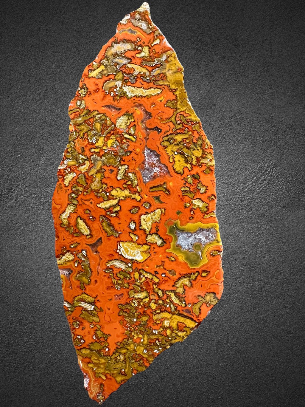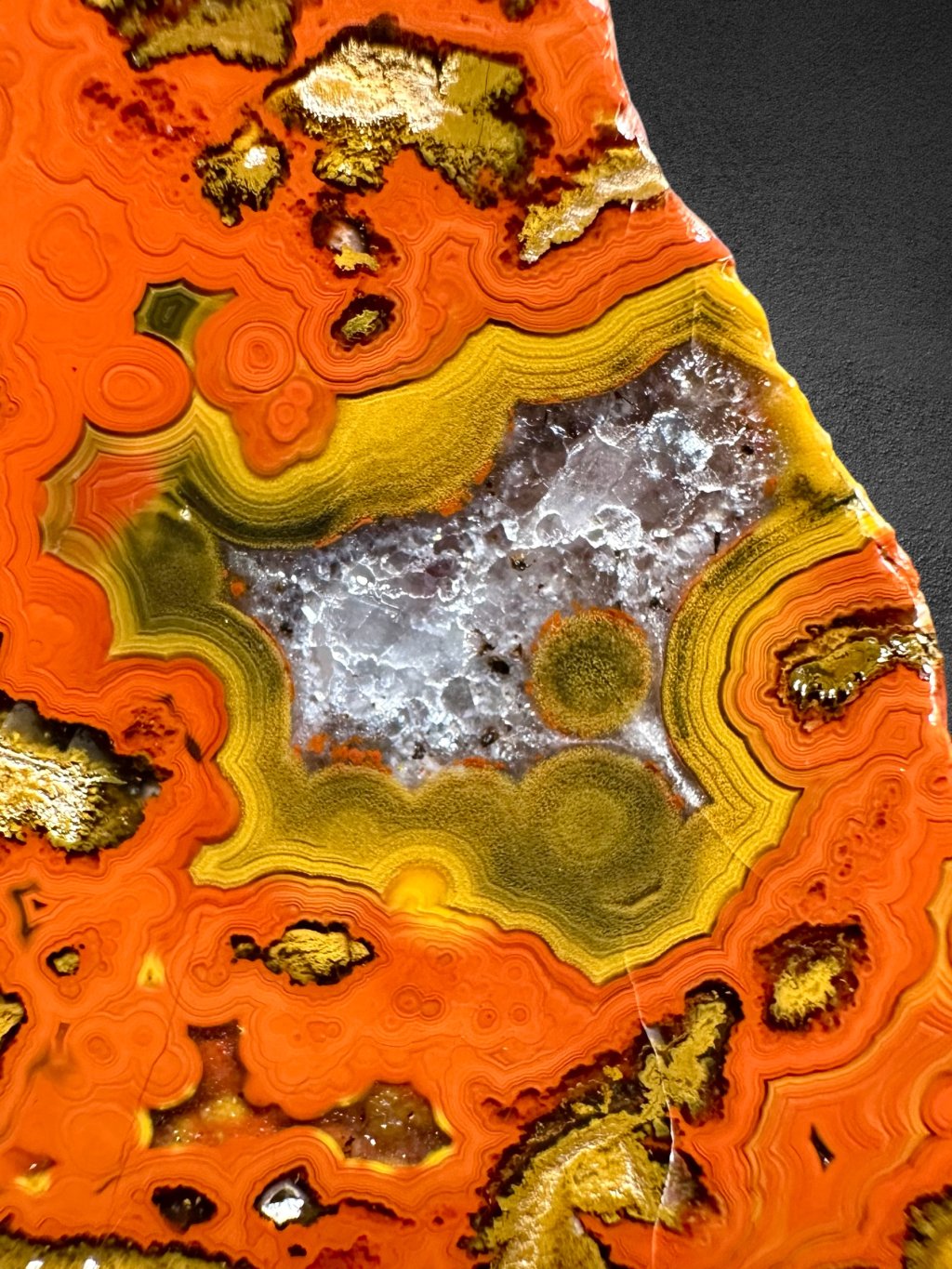 Moroccan agates are characterised by a remarkable spectrum of colours, often dominated by warm tones ranging from deep red to brownish to orange. Thin whitish or grey lines may appear between the layers, creating elegant striations and sometimes so-called 'ochre' structures. Some pieces have tiny cavities filled with quartz or amethyst crystals, which increase the attractiveness of the stone when cut and polished.