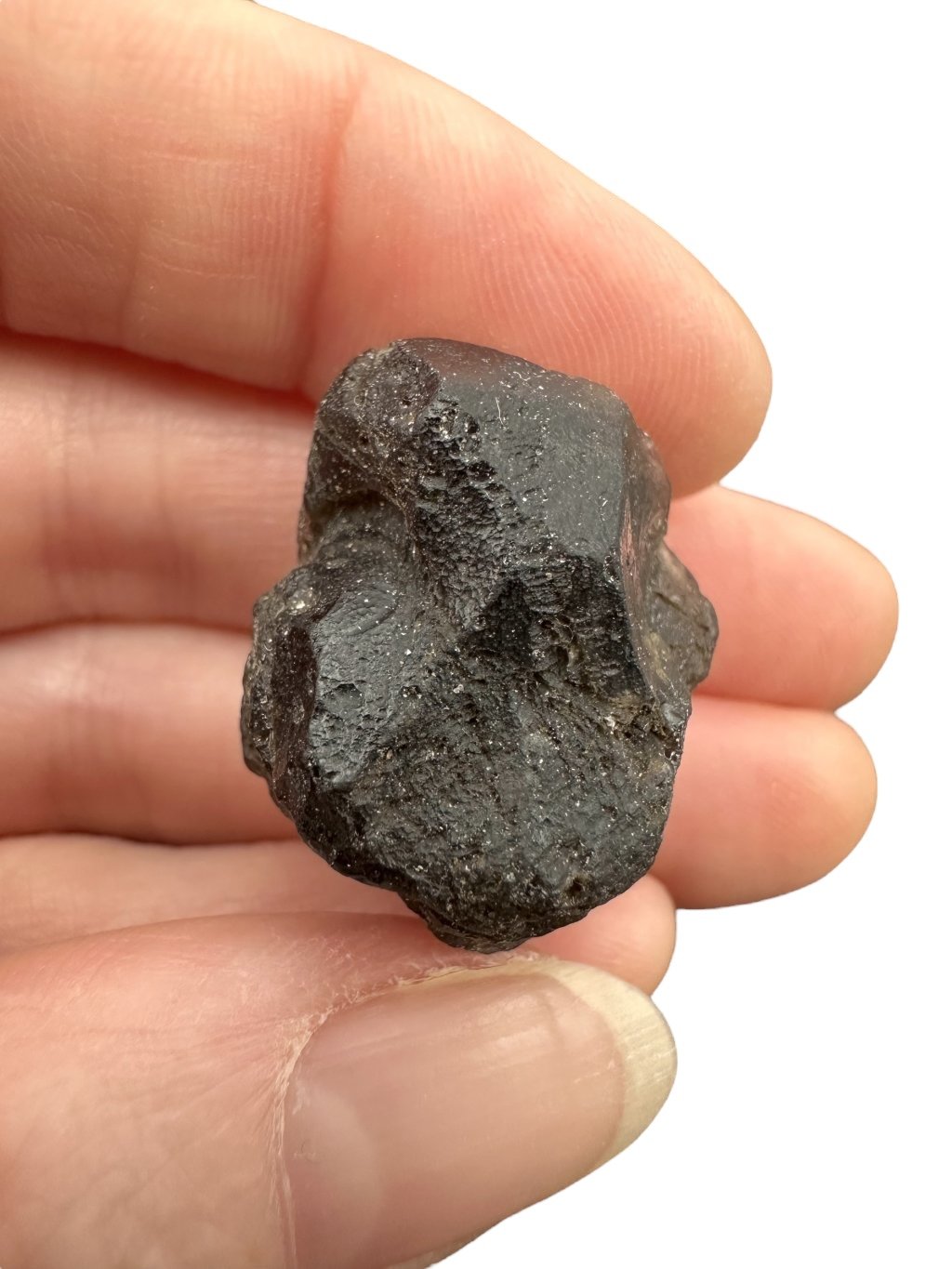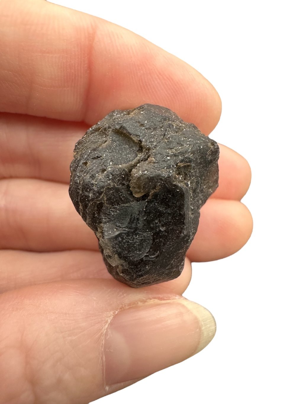 This stone has a dark, almost opaque color that ranges from gray to black. The surface can be glassy and textured, sometimes with tiny bubbles, which is typical of tektites.