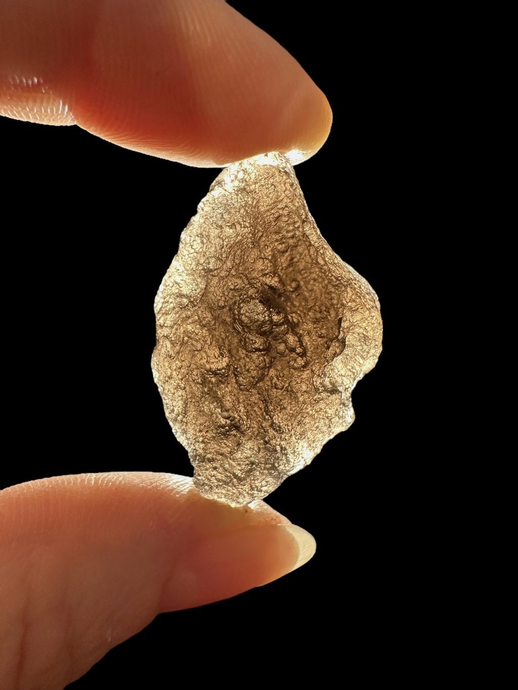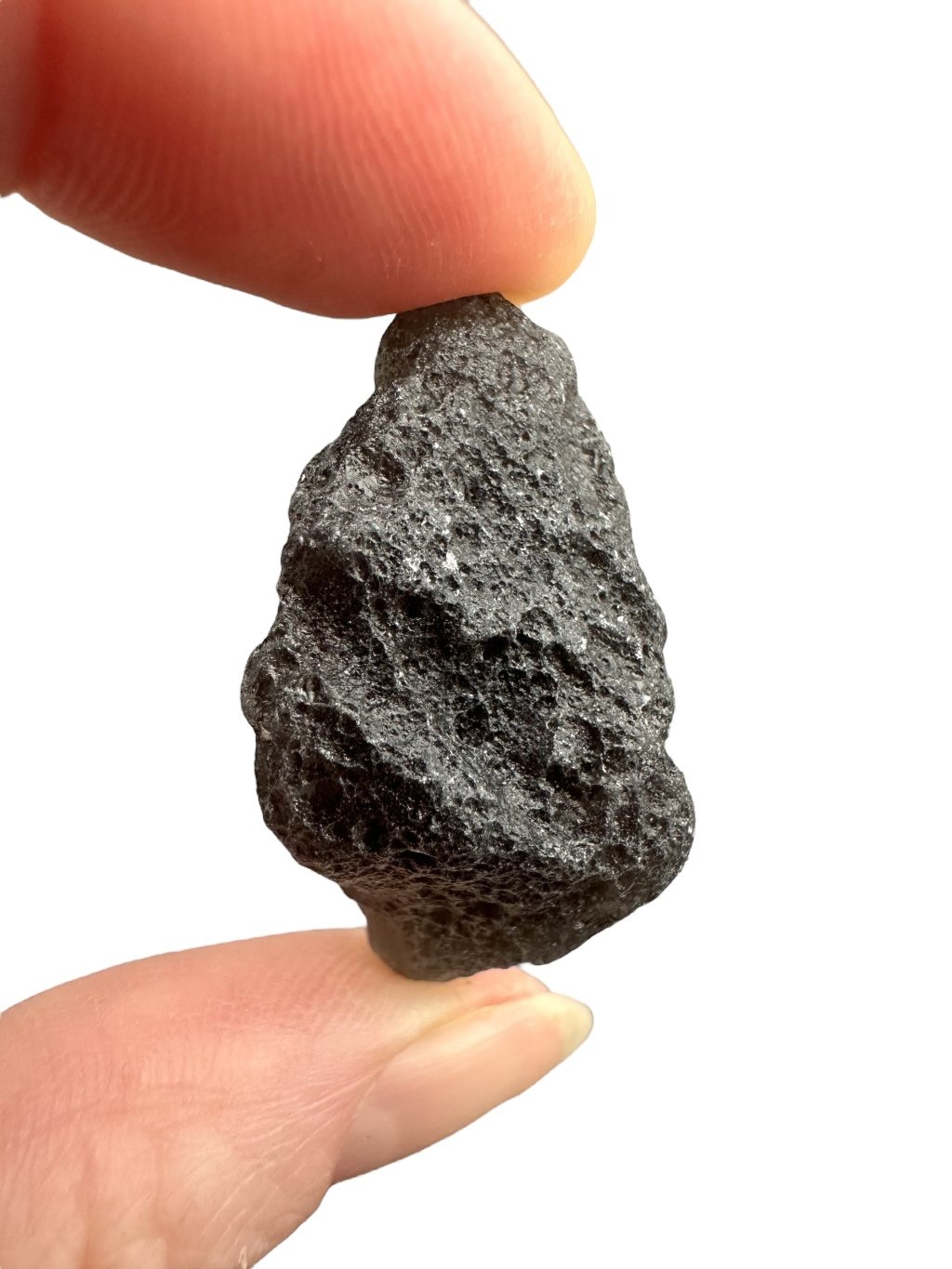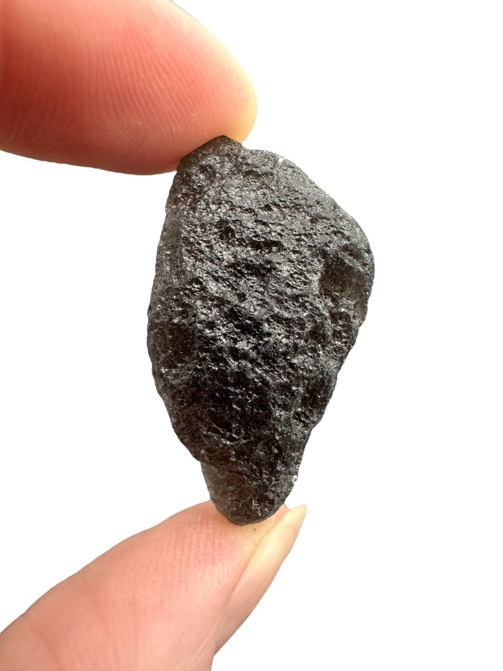 This stone has a dark, almost opaque color that ranges from gray to black. The surface can be glassy and textured, sometimes with tiny bubbles, which is typical of tektites.