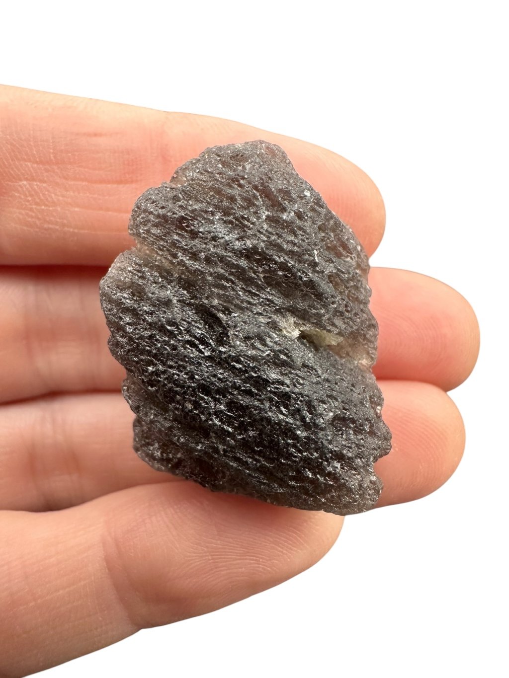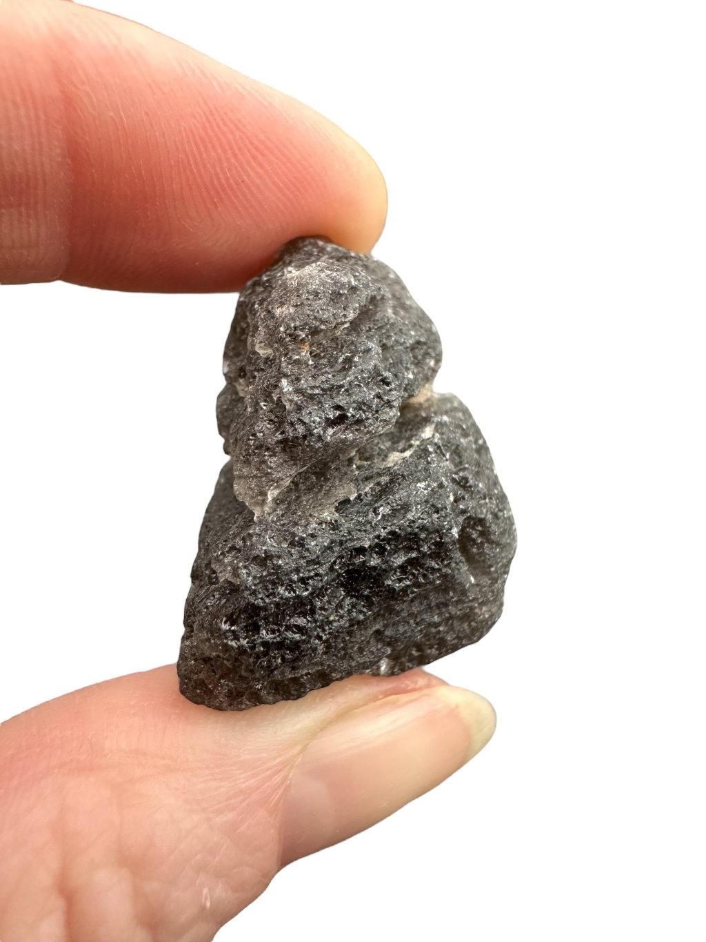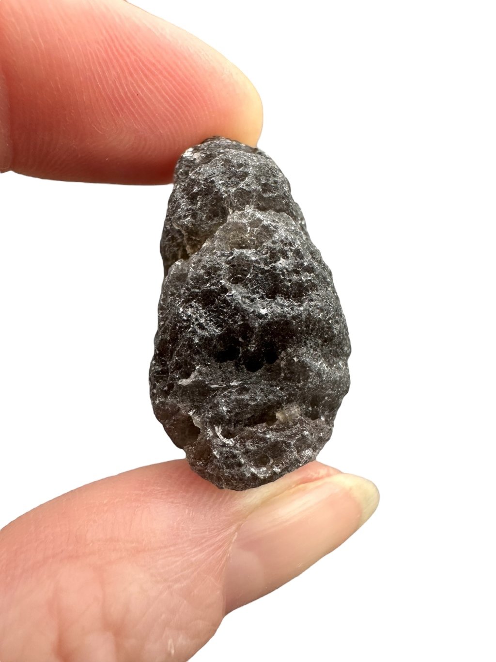 This stone has a dark, almost opaque color that ranges from gray to black. The surface can be glassy and textured, sometimes with tiny bubbles, which is typical of tektites.