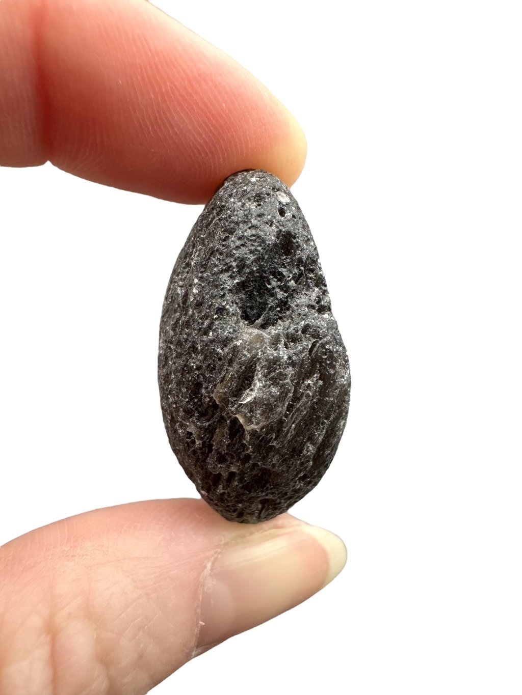 This stone has a dark, almost opaque color that ranges from gray to black. The surface can be glassy and textured, sometimes with tiny bubbles, which is typical of tektites.