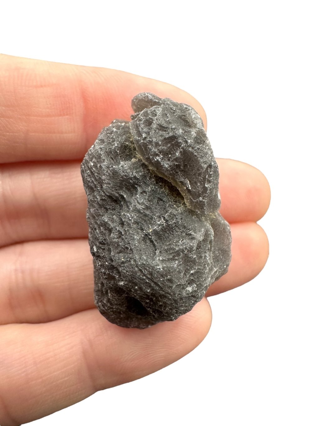 This stone has a dark, almost opaque color that ranges from gray to black. The surface can be glassy and textured, sometimes with tiny bubbles, which is typical of tektites.