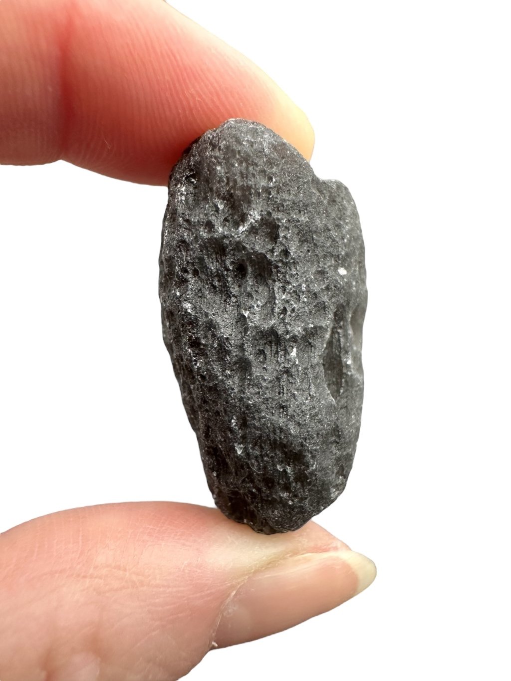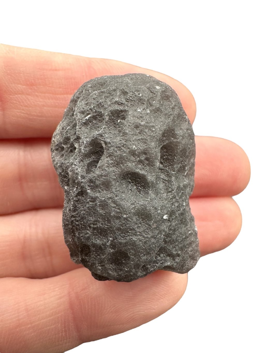 This stone has a dark, almost opaque color that ranges from gray to black. The surface can be glassy and textured, sometimes with tiny bubbles, which is typical of tektites.