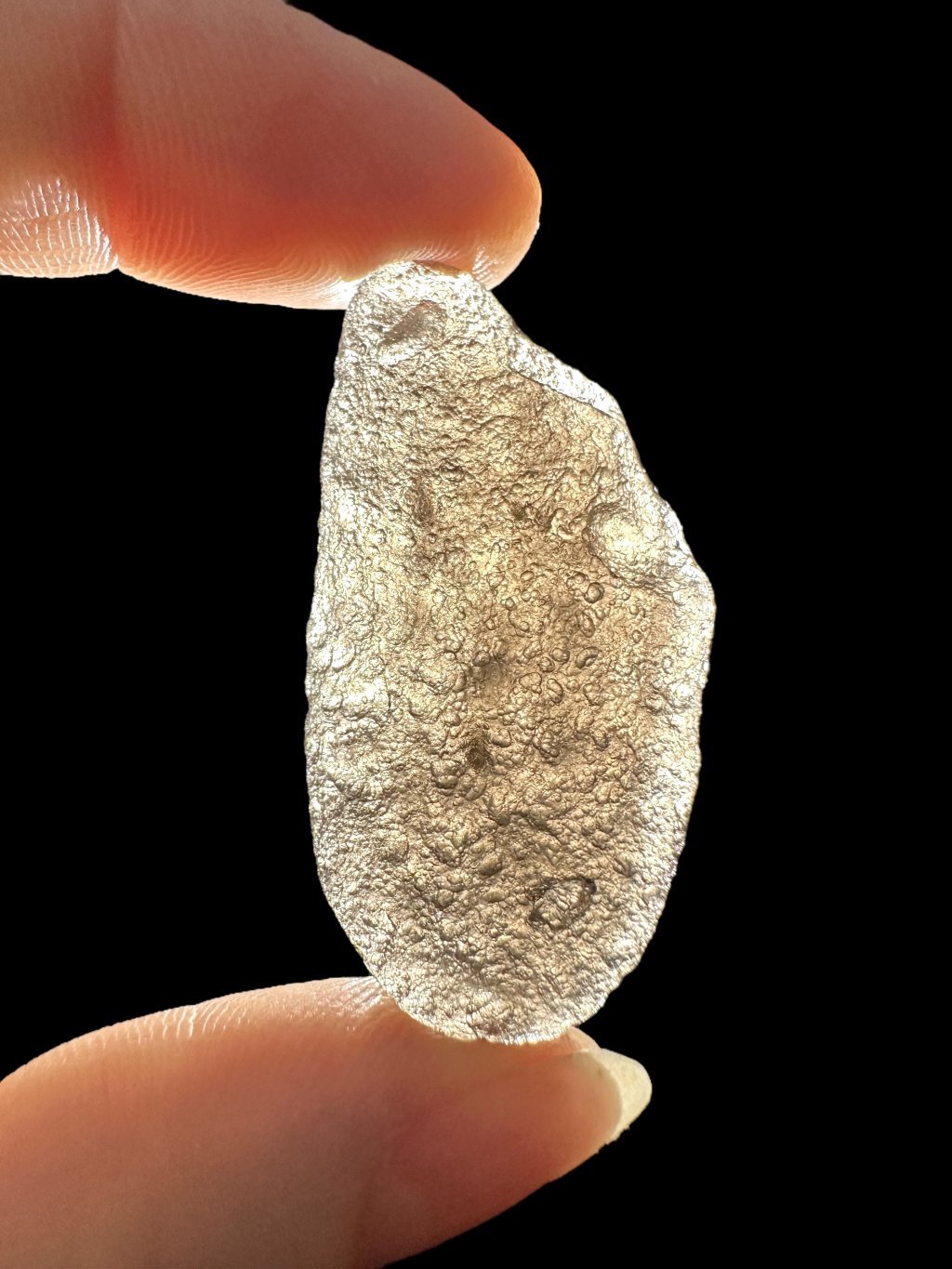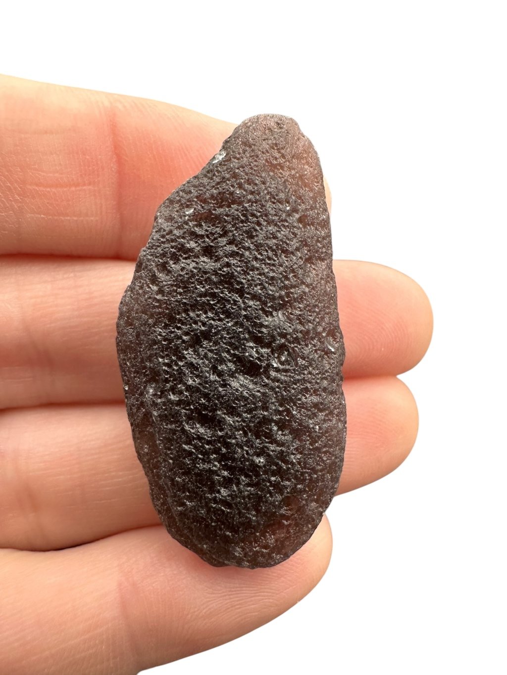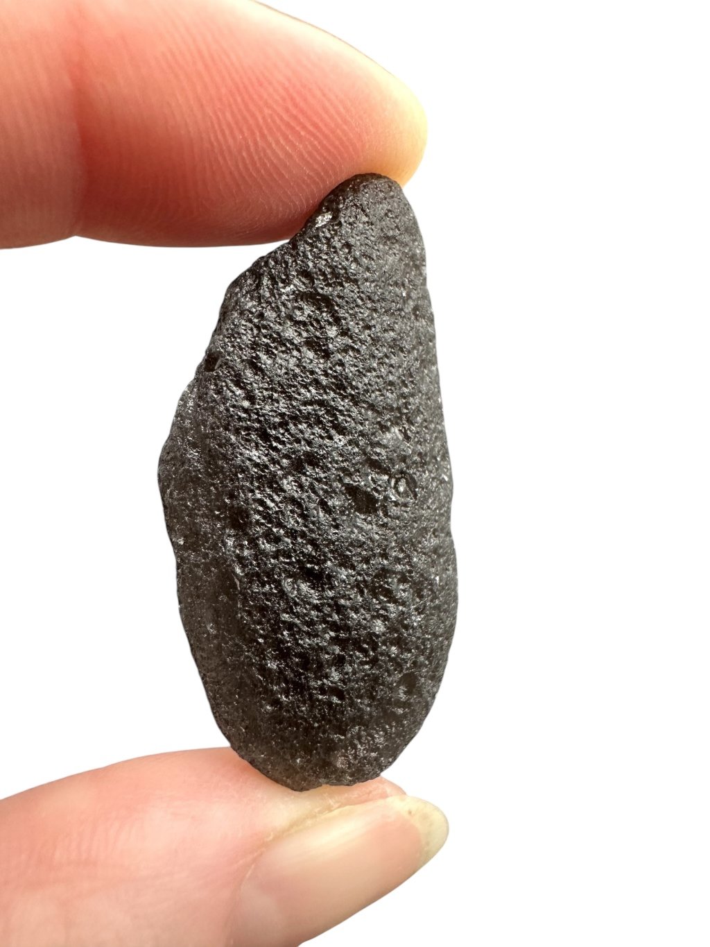 This stone has a dark, almost opaque color that ranges from gray to black. The surface can be glassy and textured, sometimes with tiny bubbles, which is typical of tektites.