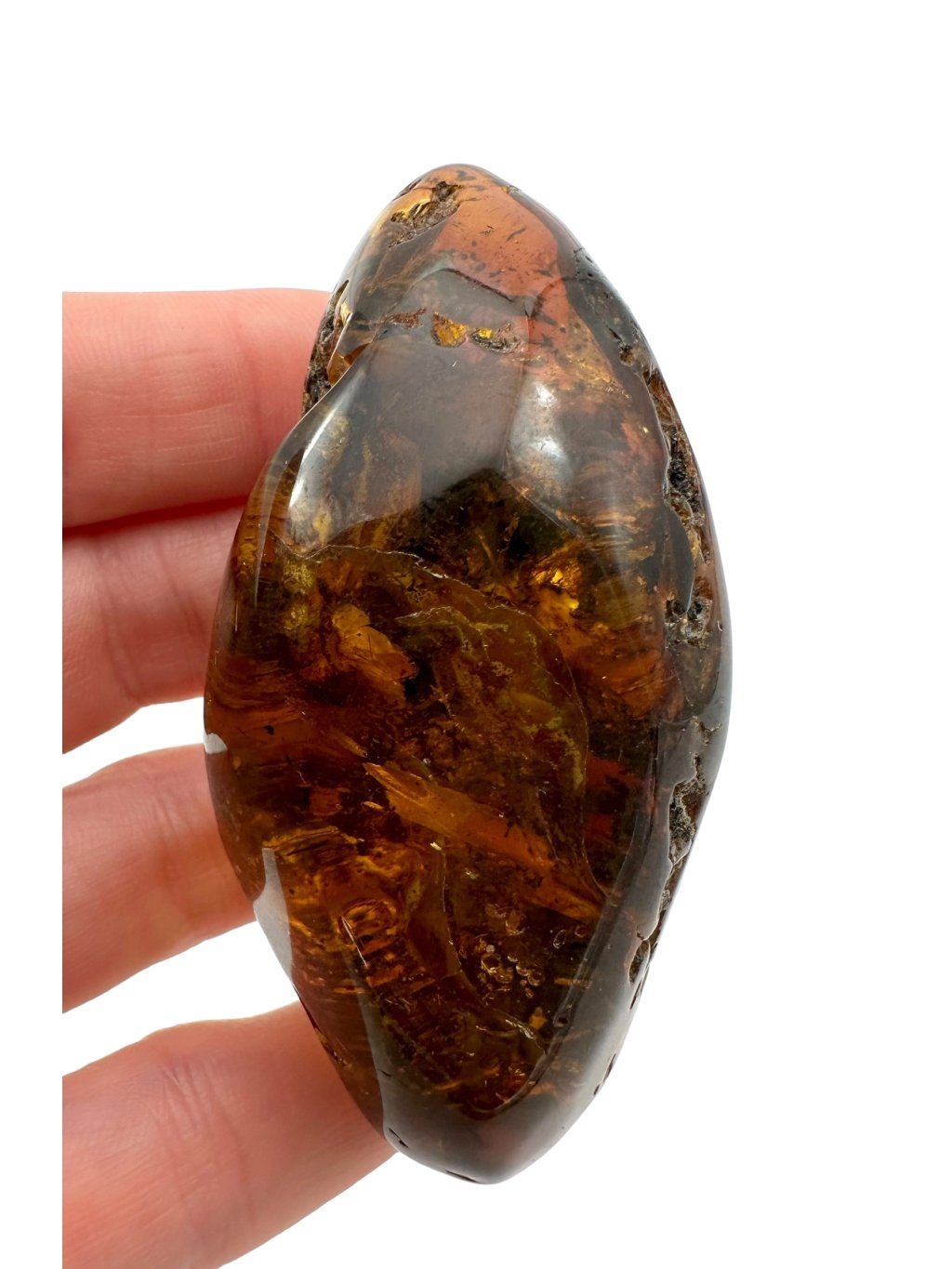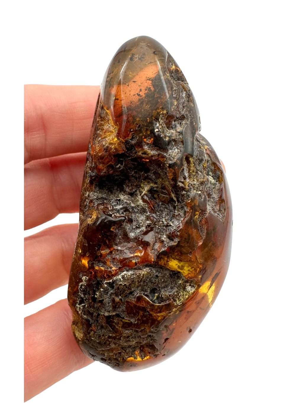 Lithuanian amber is known for its distinctive appearance, often ranging from light to dark yellow, with shades transitioning into warm honey or orange tones. There are also darker varieties—from brown to nearly black—and rarer ones that appear almost white or greenish. Due to its high content of succinic acid (up to around 8%), Baltic amber is considered higher quality compared to other types. It often contains natural inclusions such as air bubbles, plant fragments, or small insects, which significantly enhance its collector and aesthetic value.