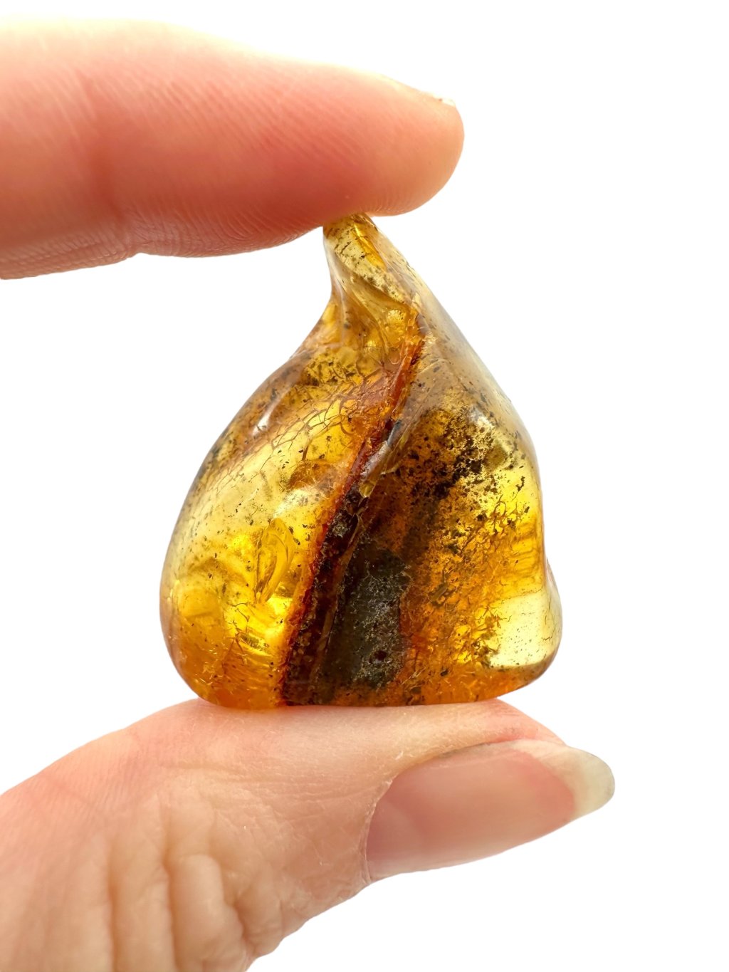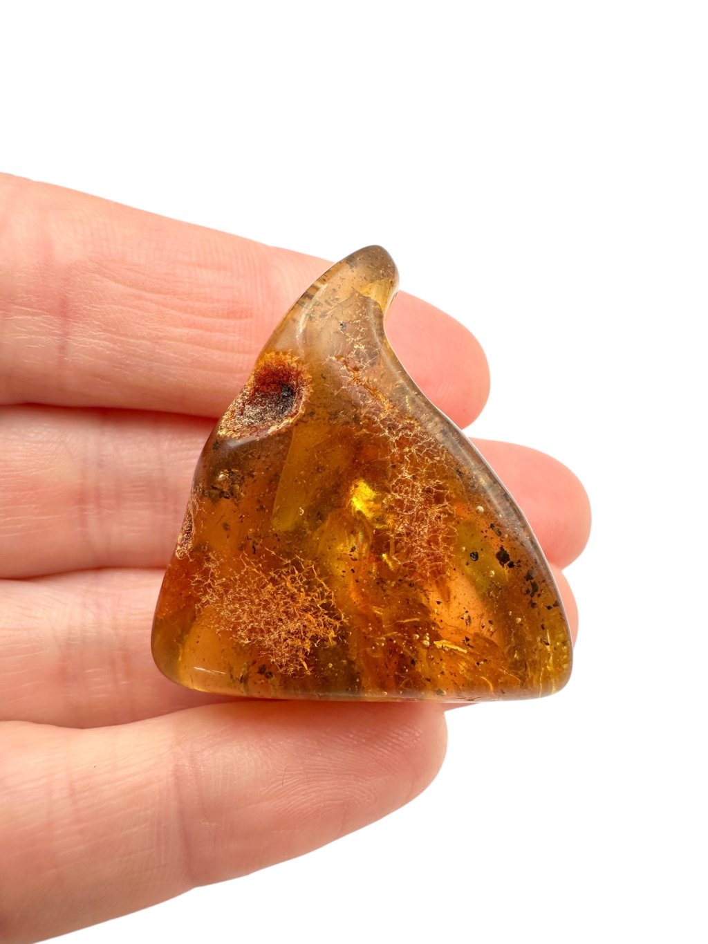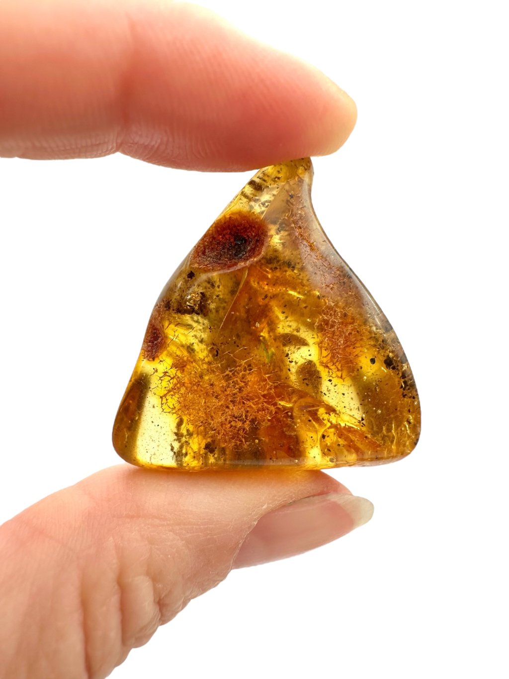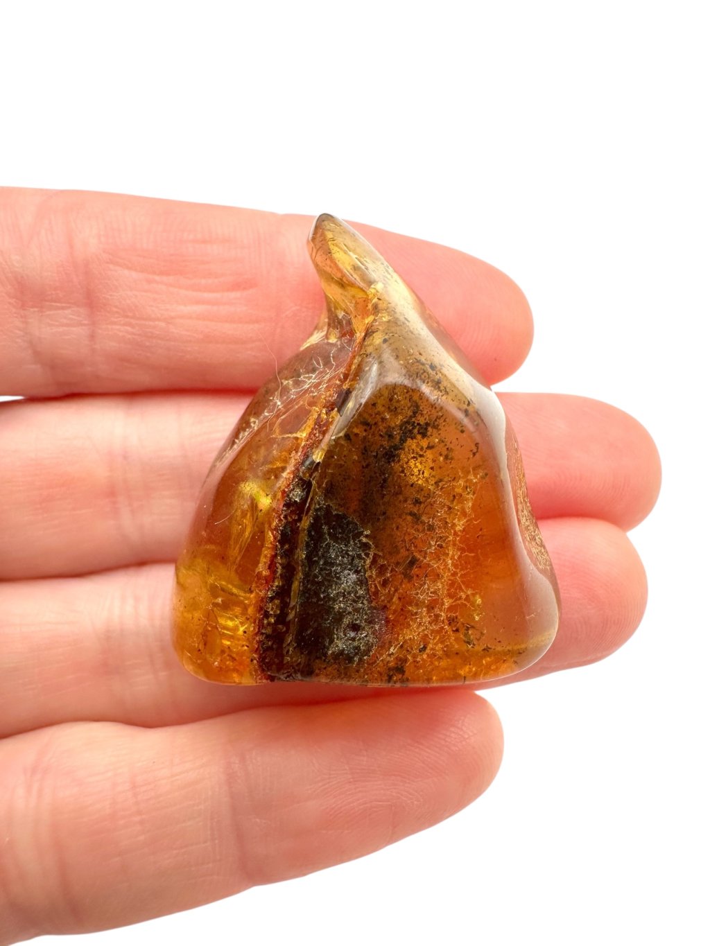 Lithuanian amber is known for its distinctive appearance, often ranging from light to dark yellow, with shades transitioning into warm honey or orange tones. There are also darker varieties—from brown to nearly black—and rarer ones that appear almost white or greenish. Due to its high content of succinic acid (up to around 8%), Baltic amber is considered higher quality compared to other types. It often contains natural inclusions such as air bubbles, plant fragments, or small insects, which significantly enhance its collector and aesthetic value.