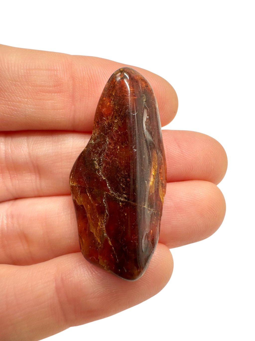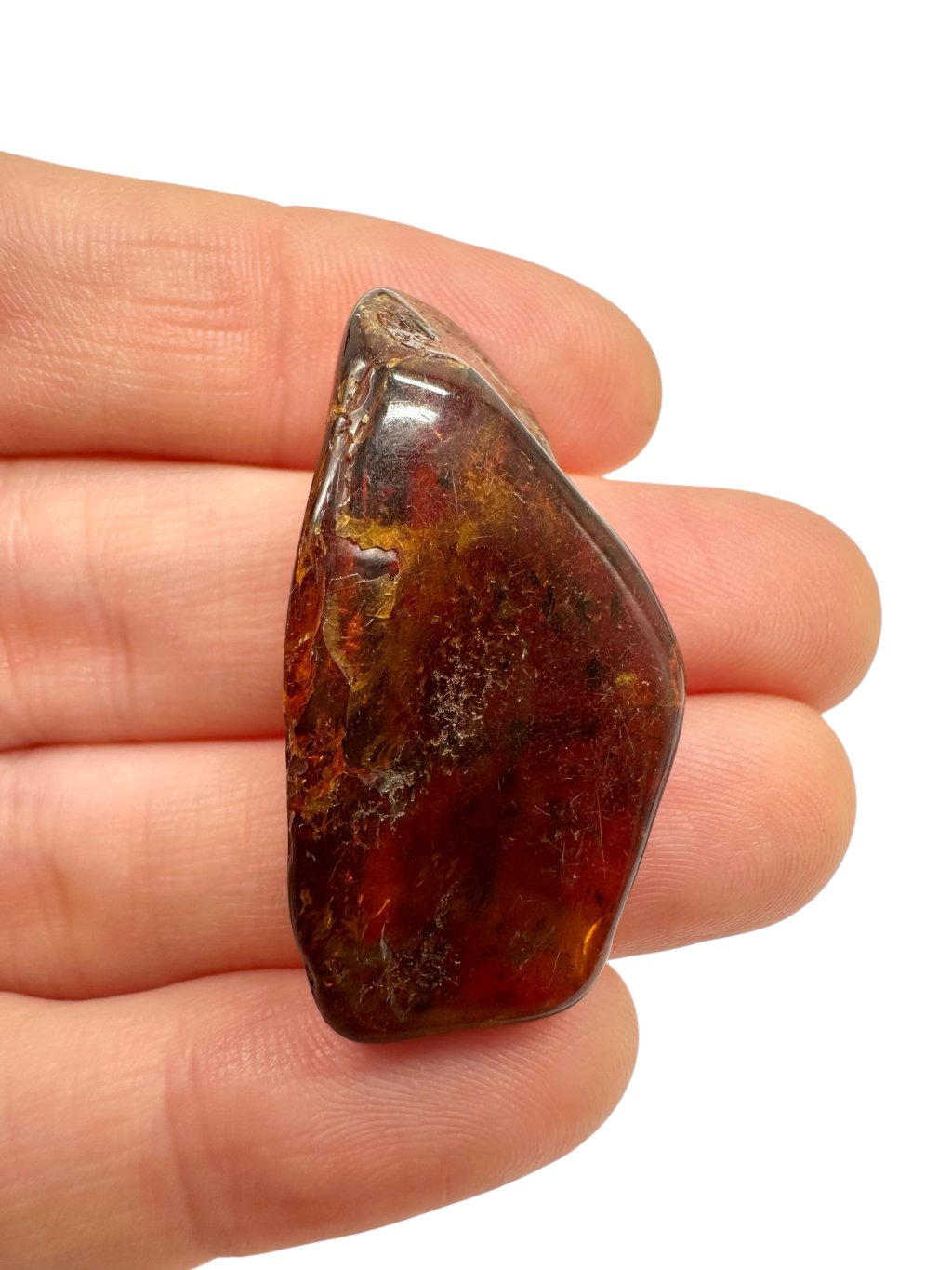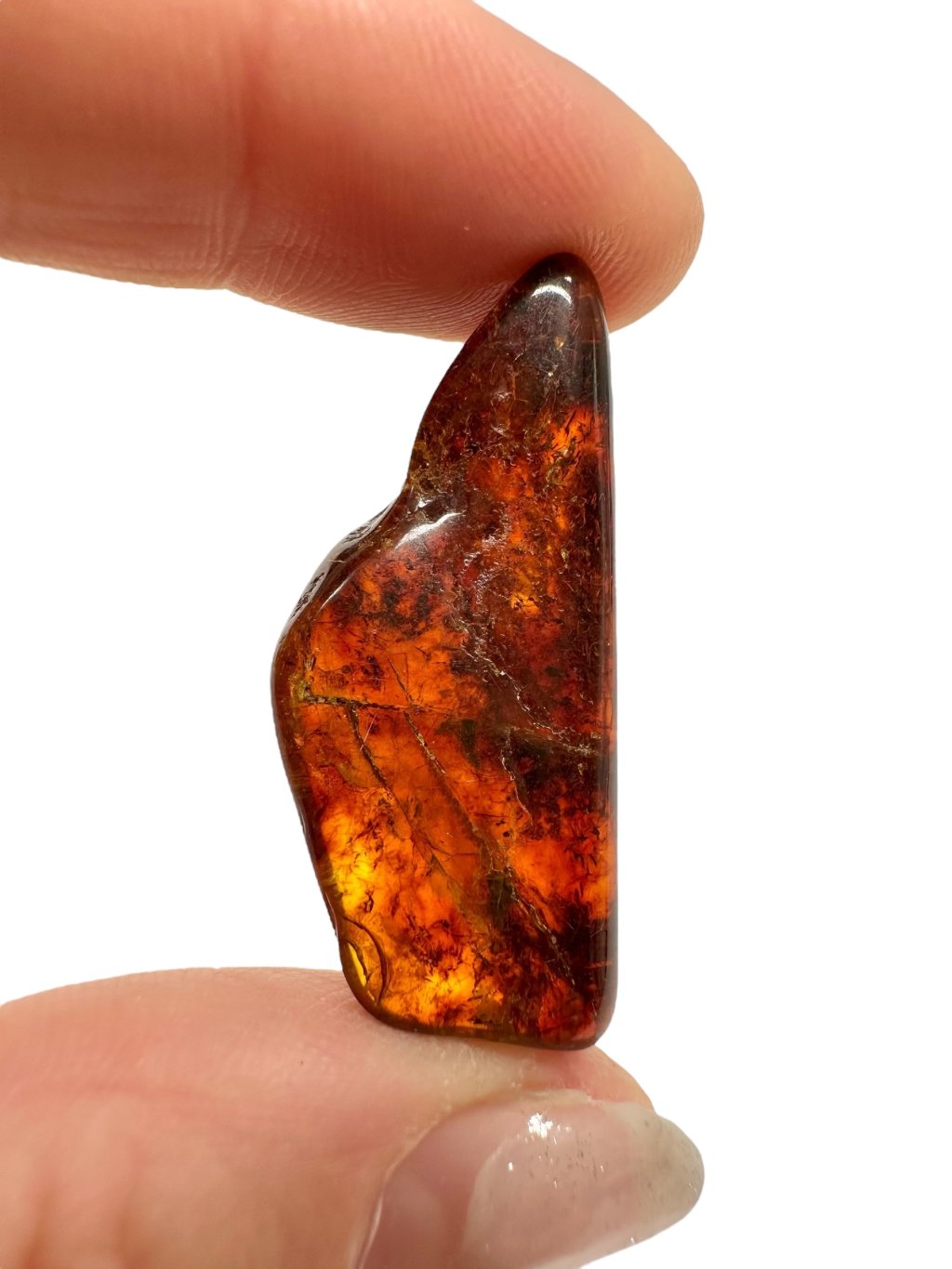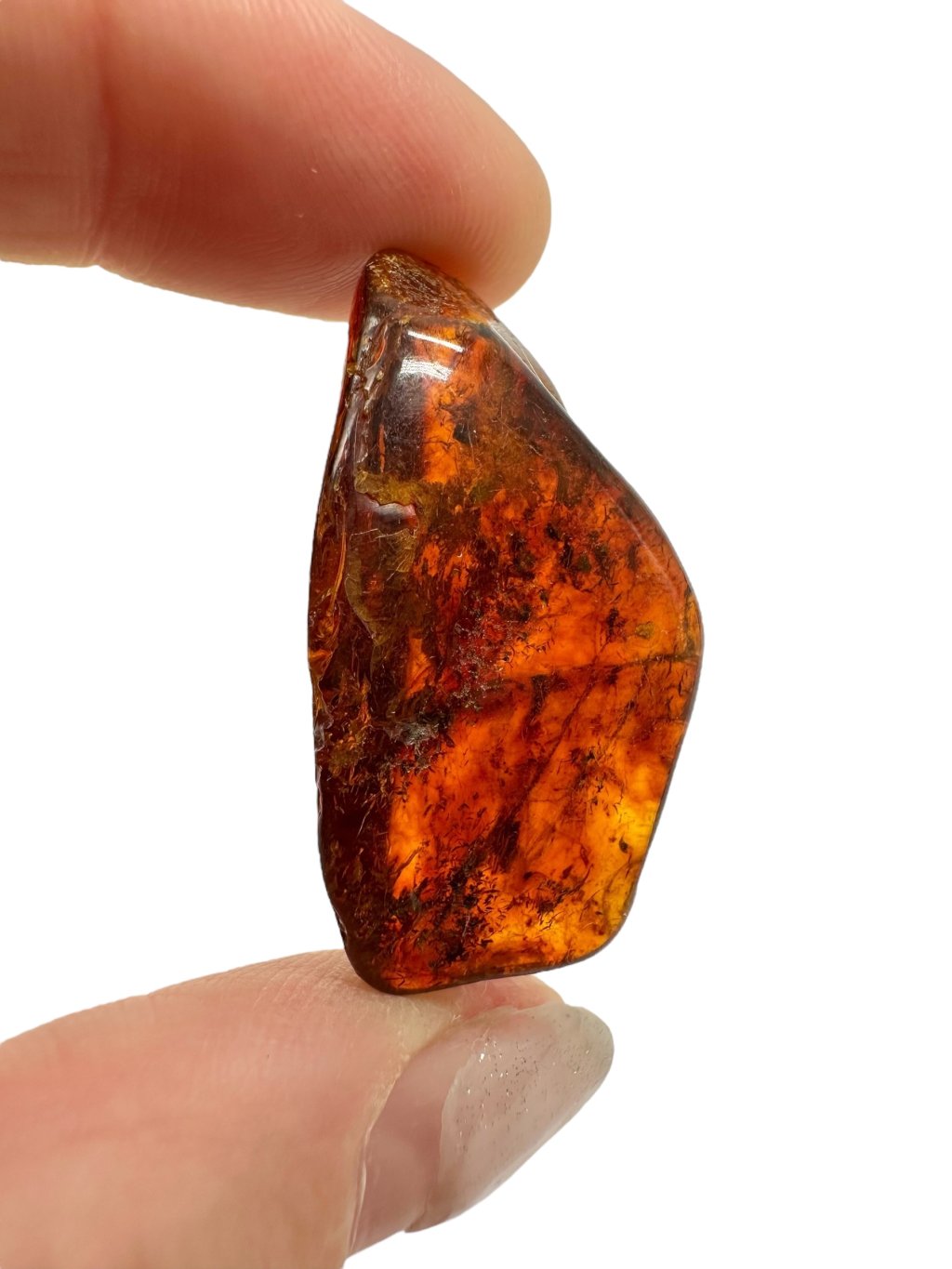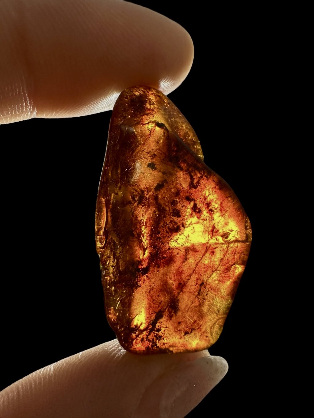 Note: The introductory photo was taken with the amber held between fingers, allowing light to pass through, making it appear lighter than when it is placed on a surface.