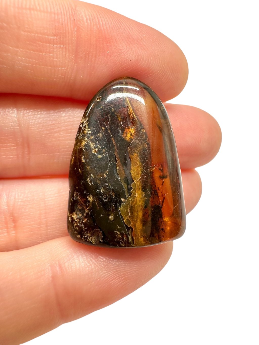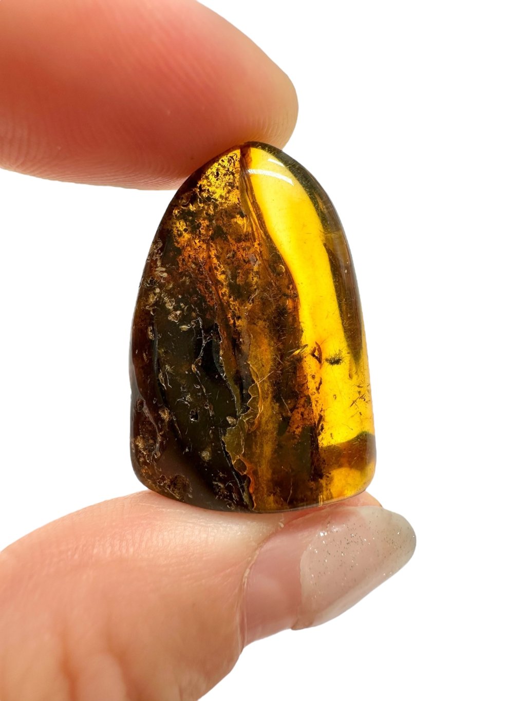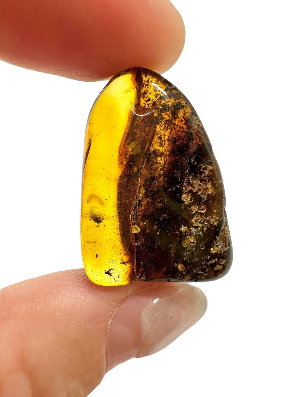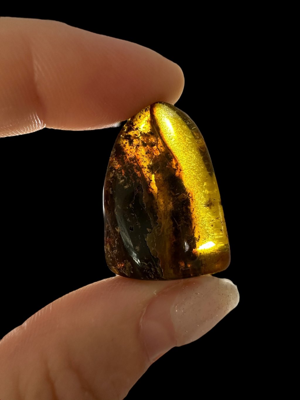 Note: The introductory photo was taken with the amber held between fingers, allowing light to pass through, making it appear lighter than when it is placed on a surface.