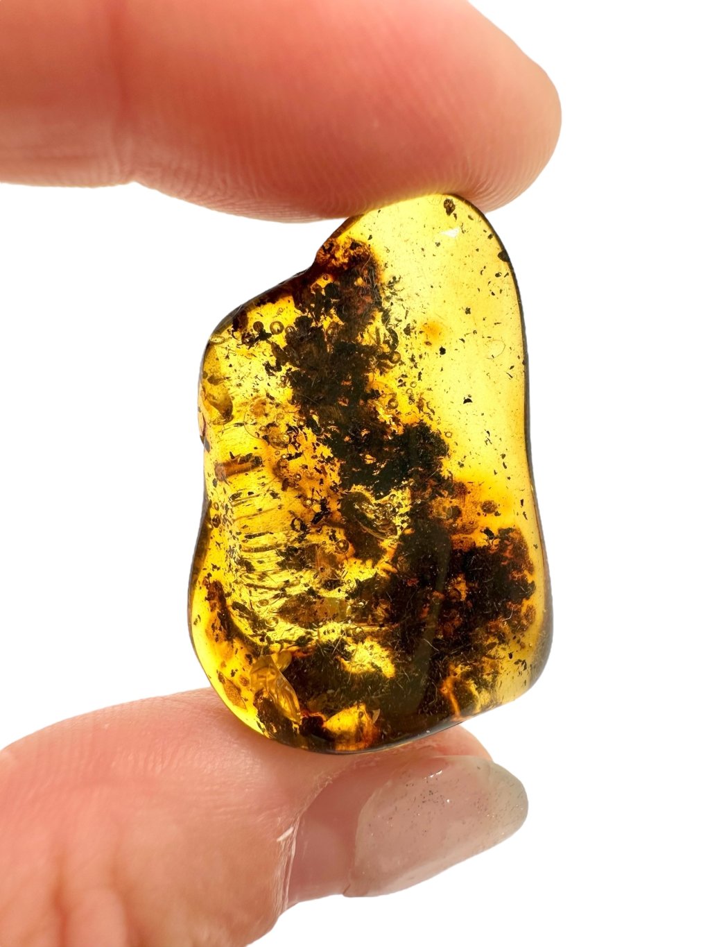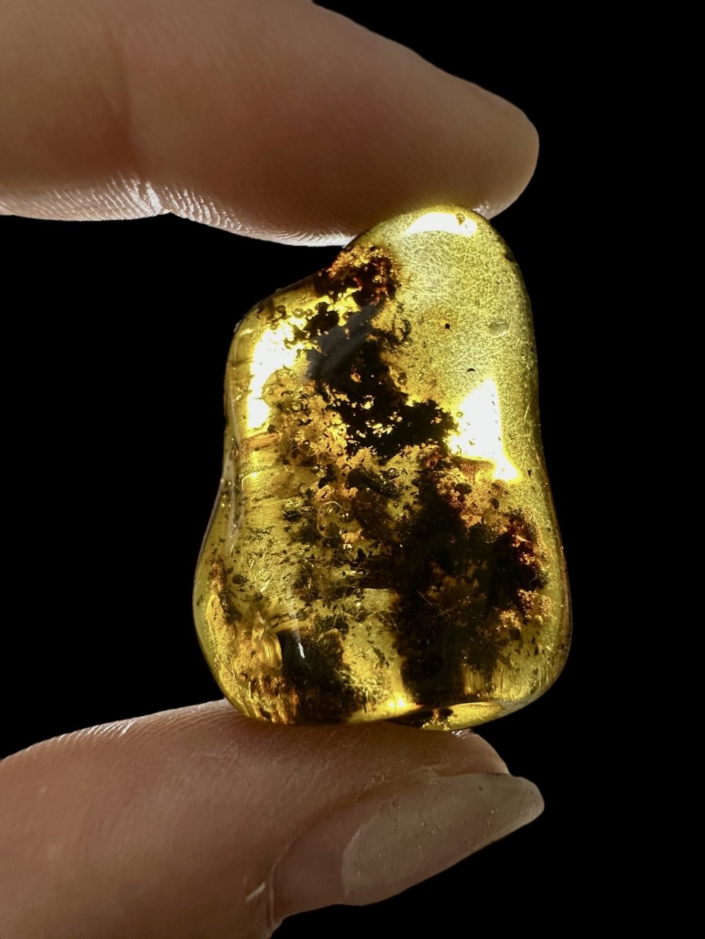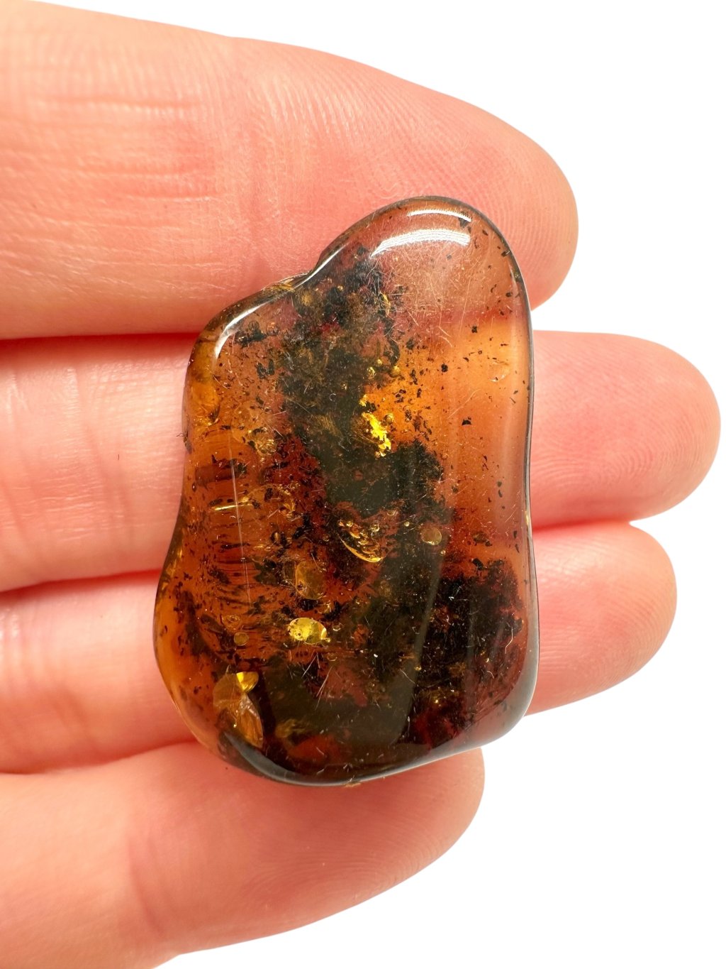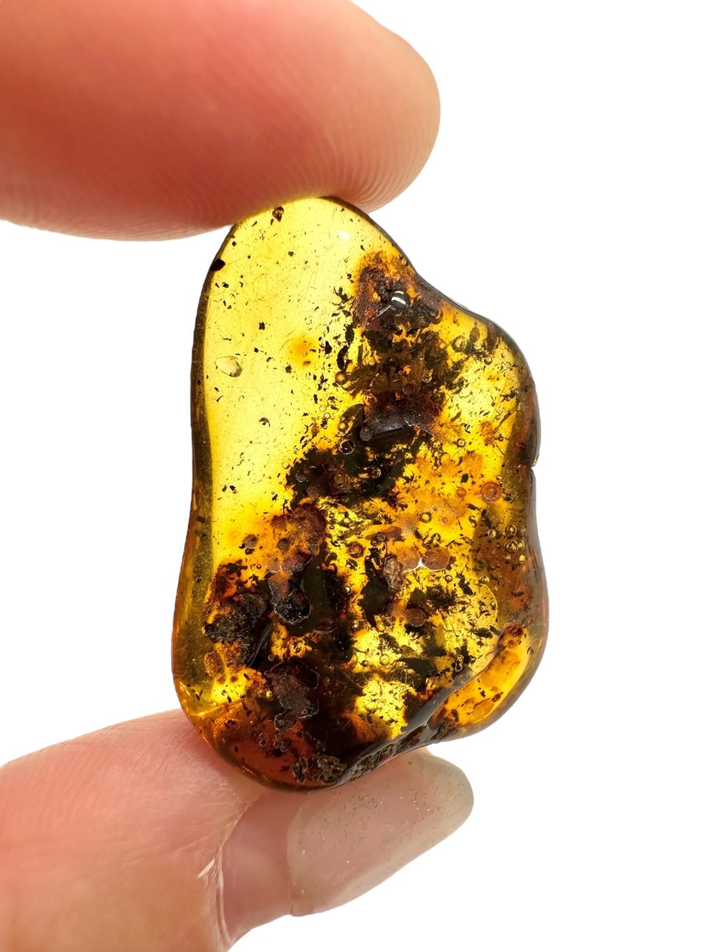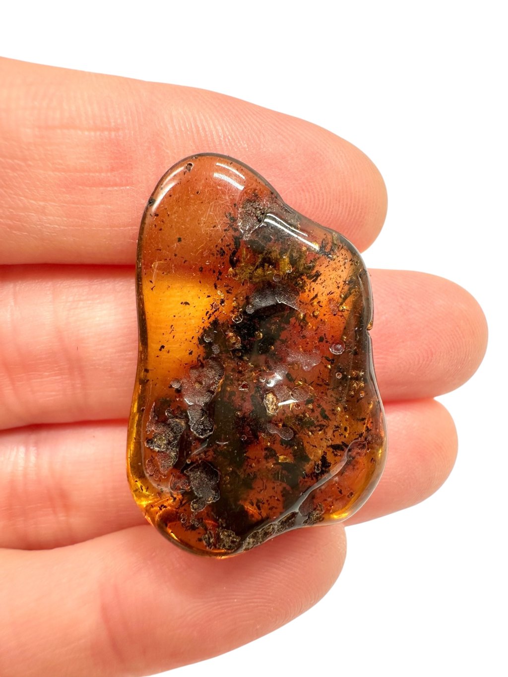 Note: The introductory photo was taken with the amber held between fingers, allowing light to pass through, making it appear lighter than when it is placed on a surface.