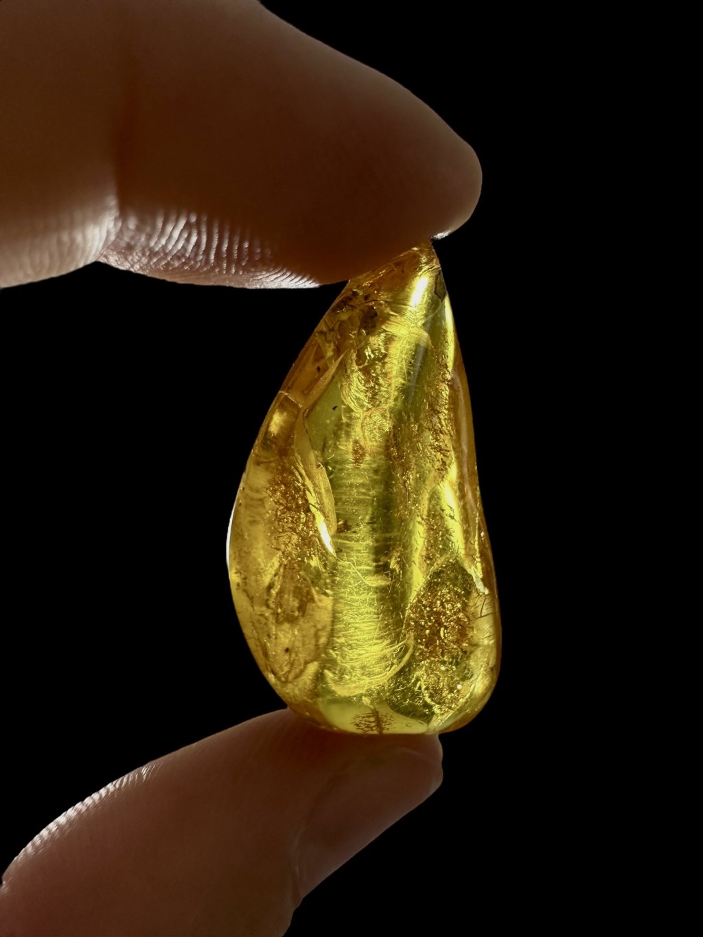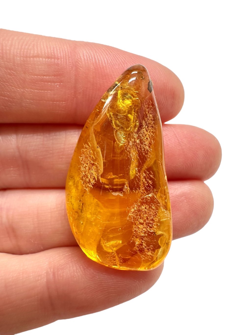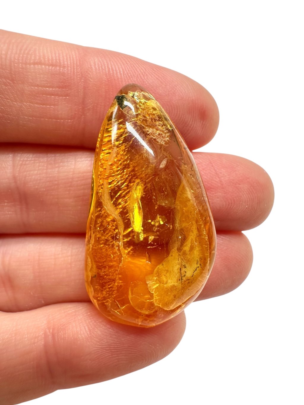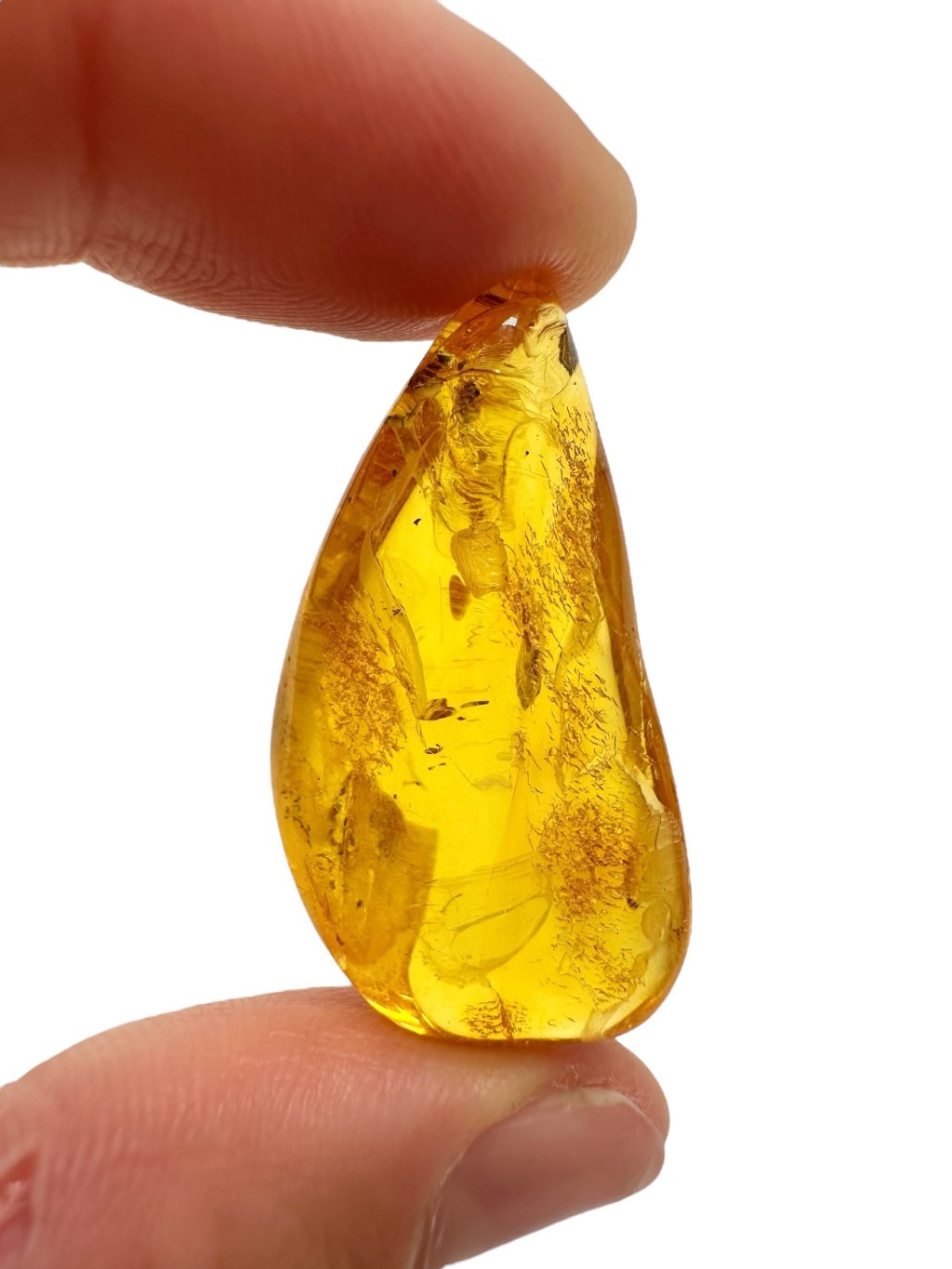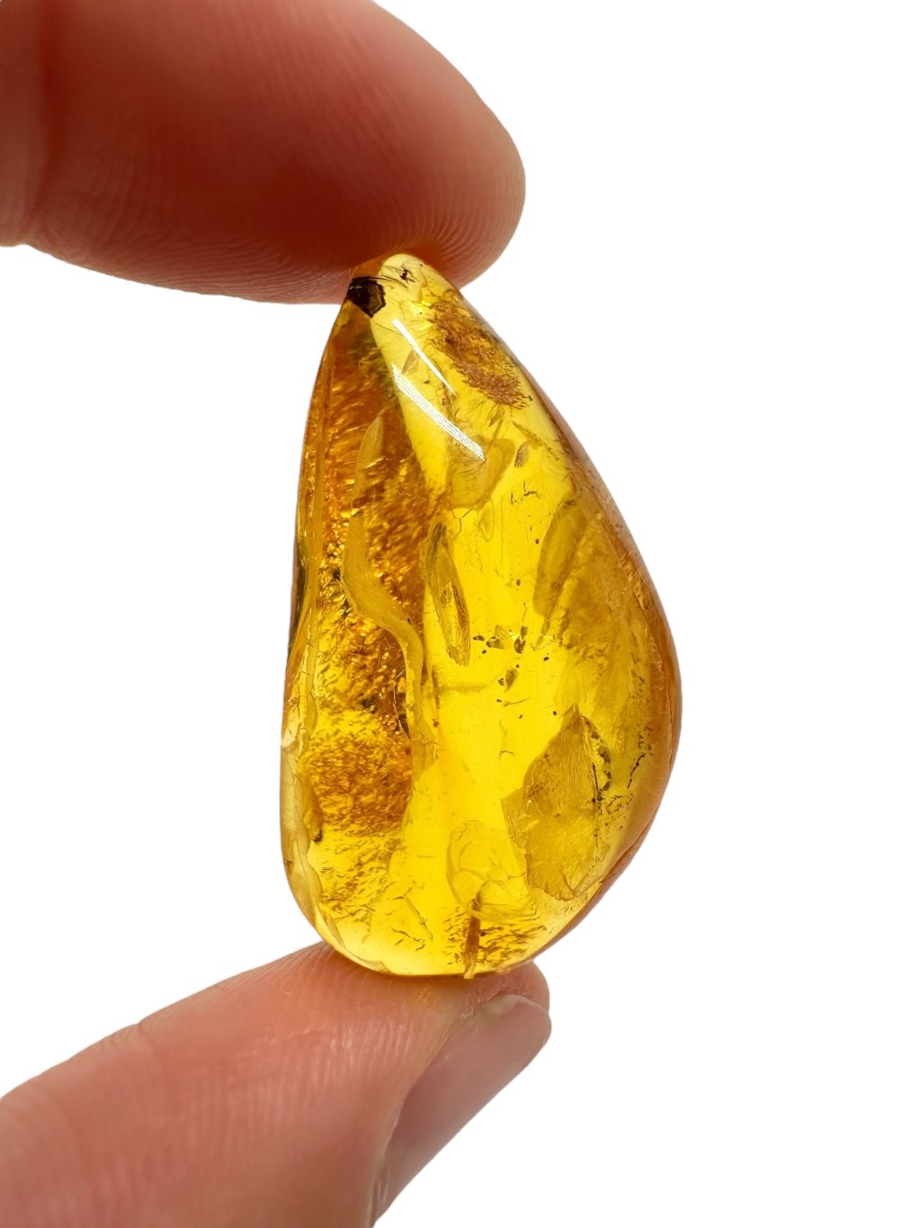 Lithuanian amber is known for its distinctive appearance, often ranging from light to dark yellow, with shades transitioning into warm honey or orange tones. There are also darker varieties—from brown to nearly black—and rarer ones that appear almost white or greenish. Due to its high content of succinic acid (up to around 8%), Baltic amber is considered higher quality compared to other types. It often contains natural inclusions such as air bubbles, plant fragments, or small insects, which significantly enhance its collector and aesthetic value.