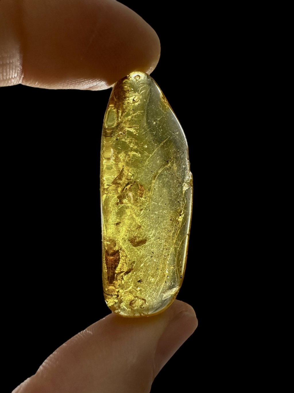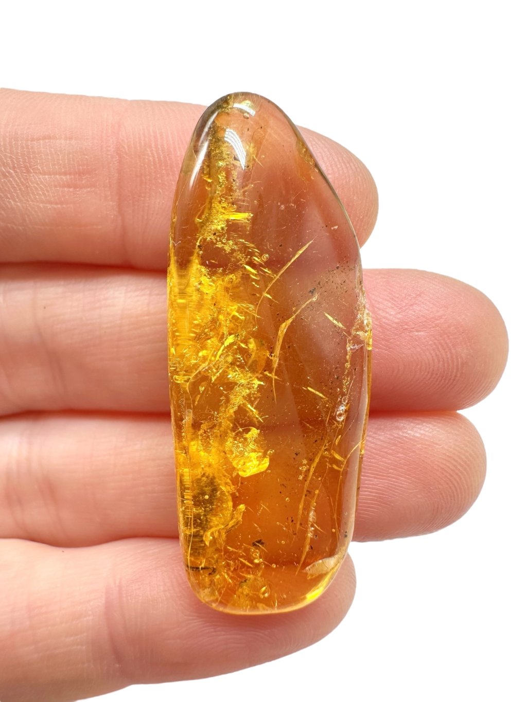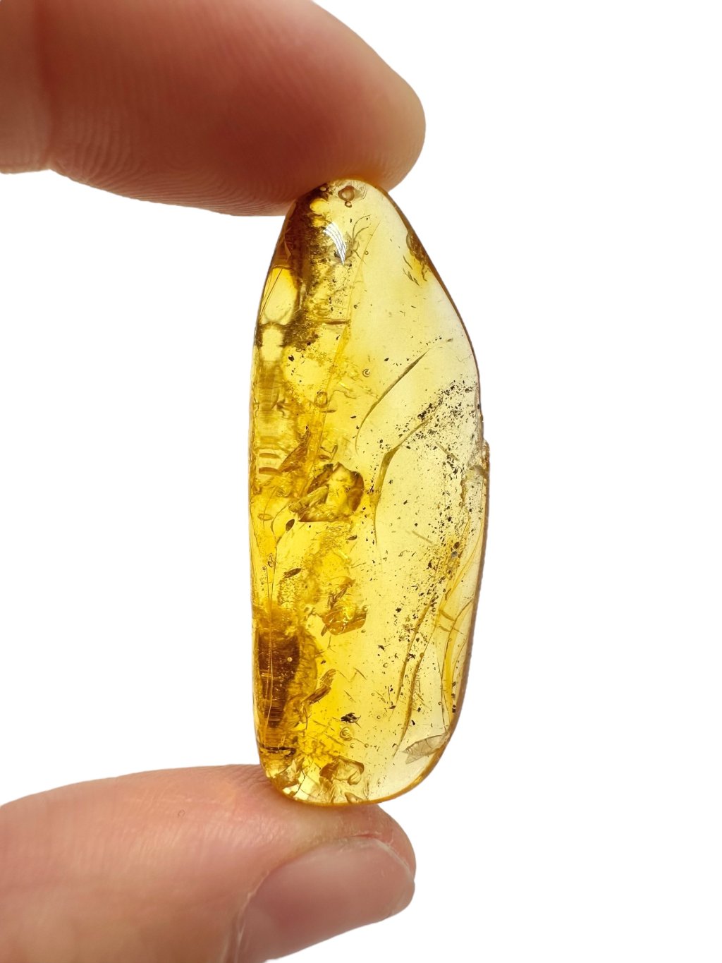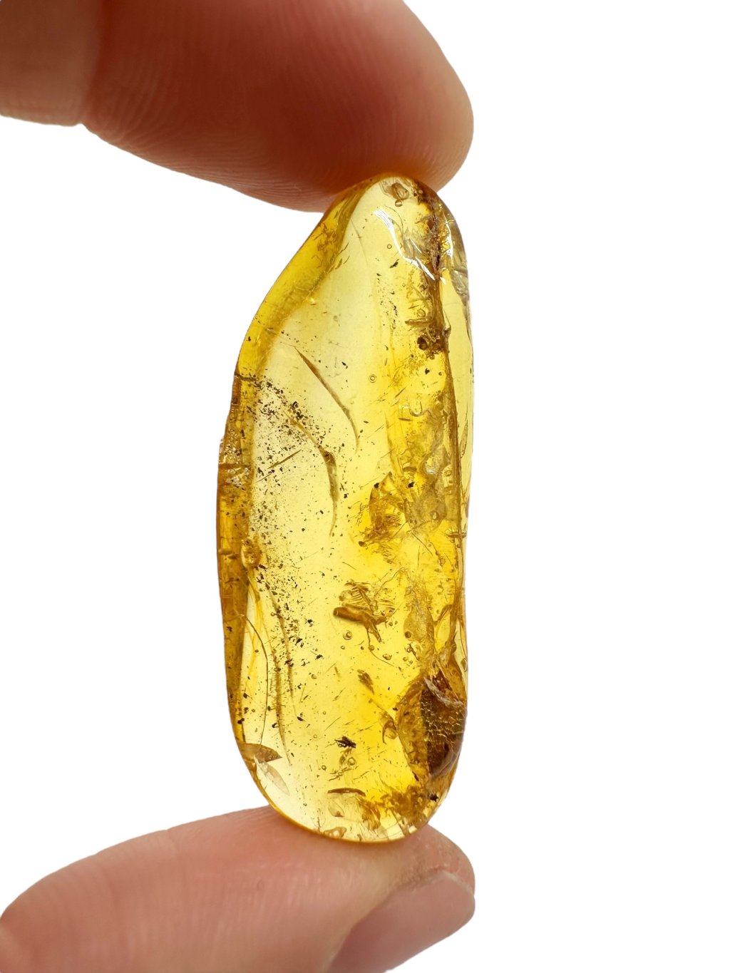 Lithuanian amber is known for its distinctive appearance, often ranging from light to dark yellow, with shades transitioning into warm honey or orange tones. There are also darker varieties—from brown to nearly black—and rarer ones that appear almost white or greenish. Due to its high content of succinic acid (up to around 8%), Baltic amber is considered higher quality compared to other types. It often contains natural inclusions such as air bubbles, plant fragments, or small insects, which significantly enhance its collector and aesthetic value.