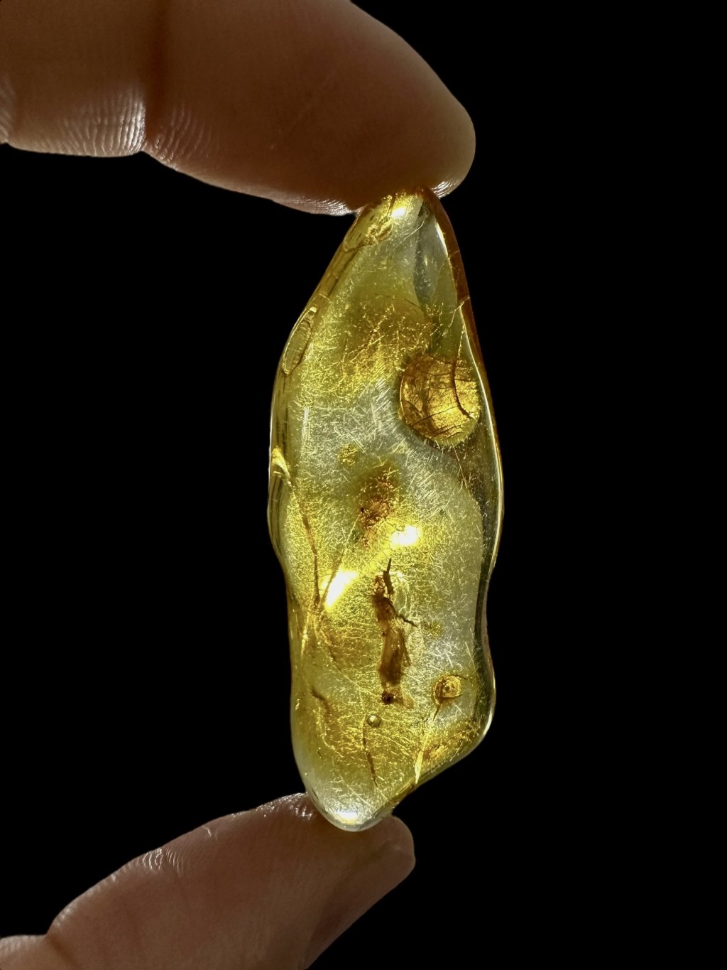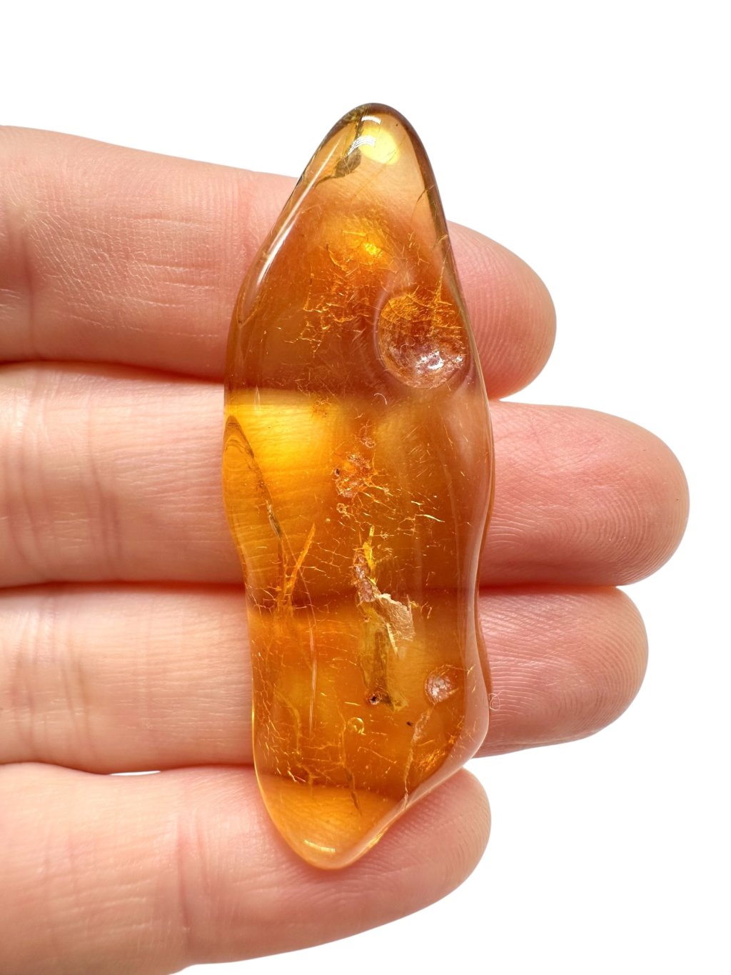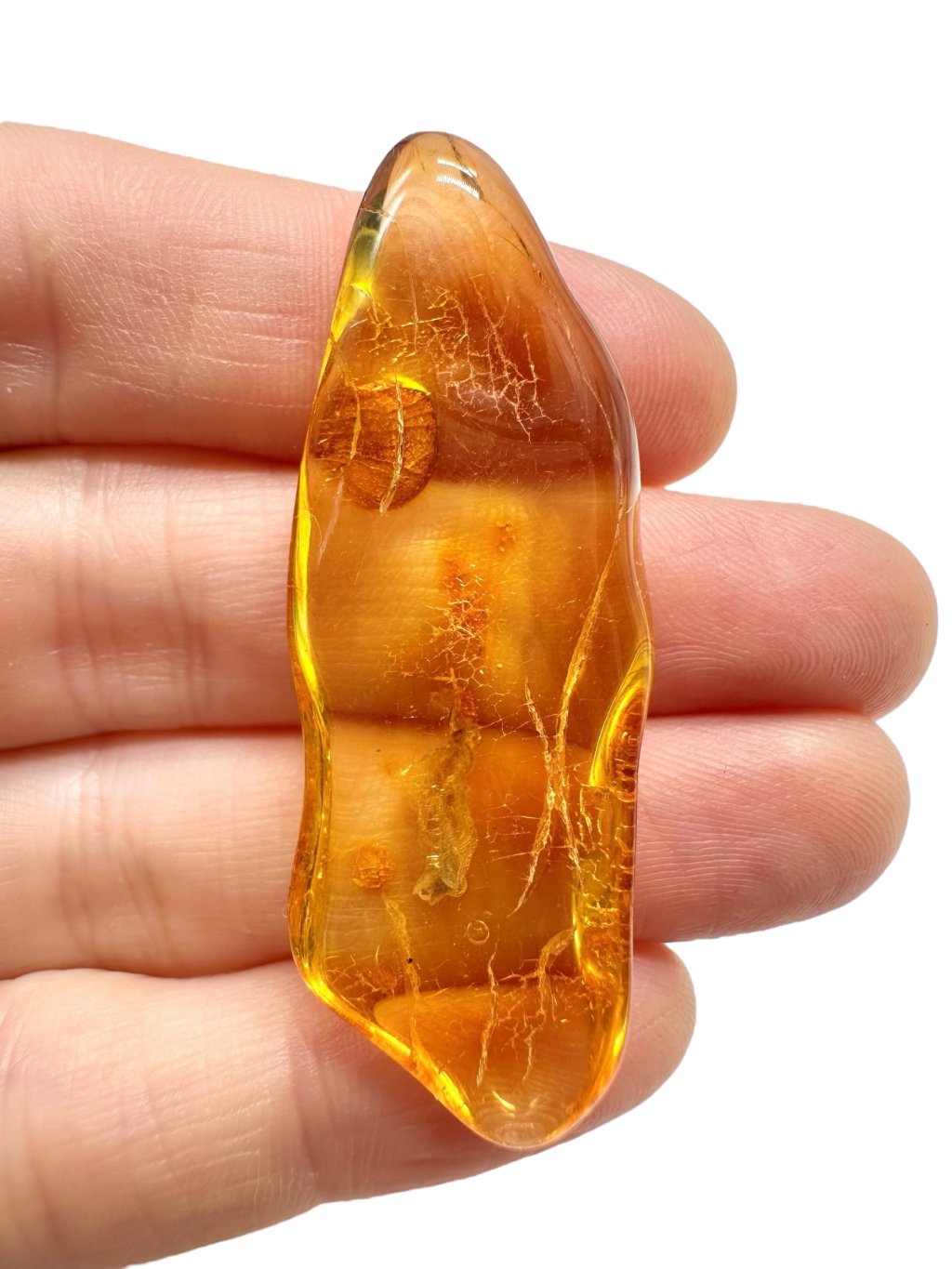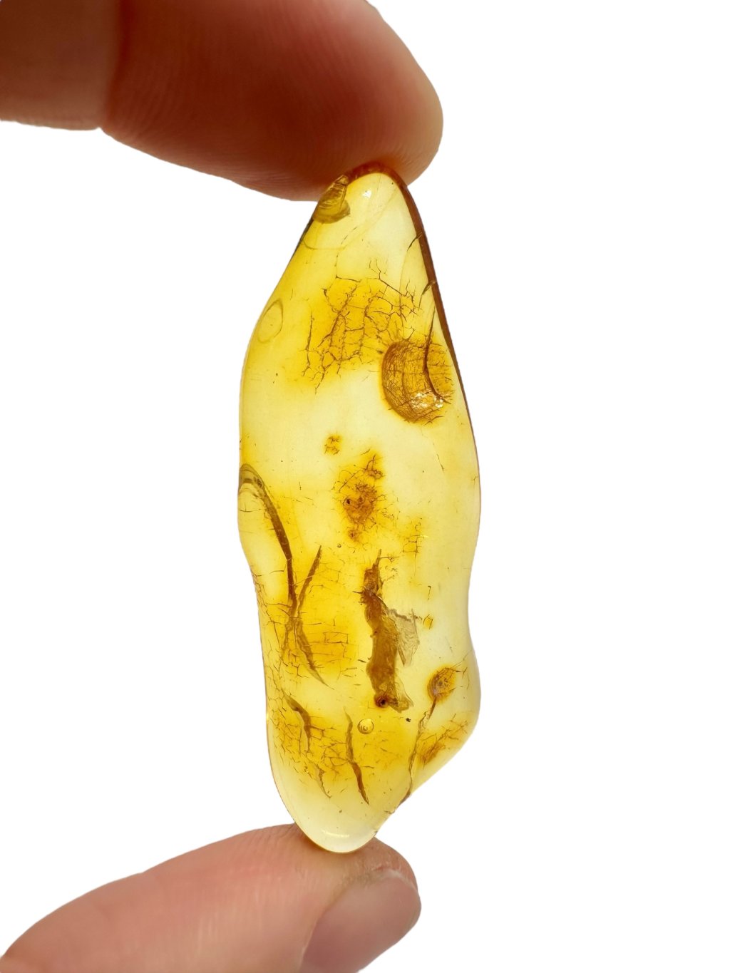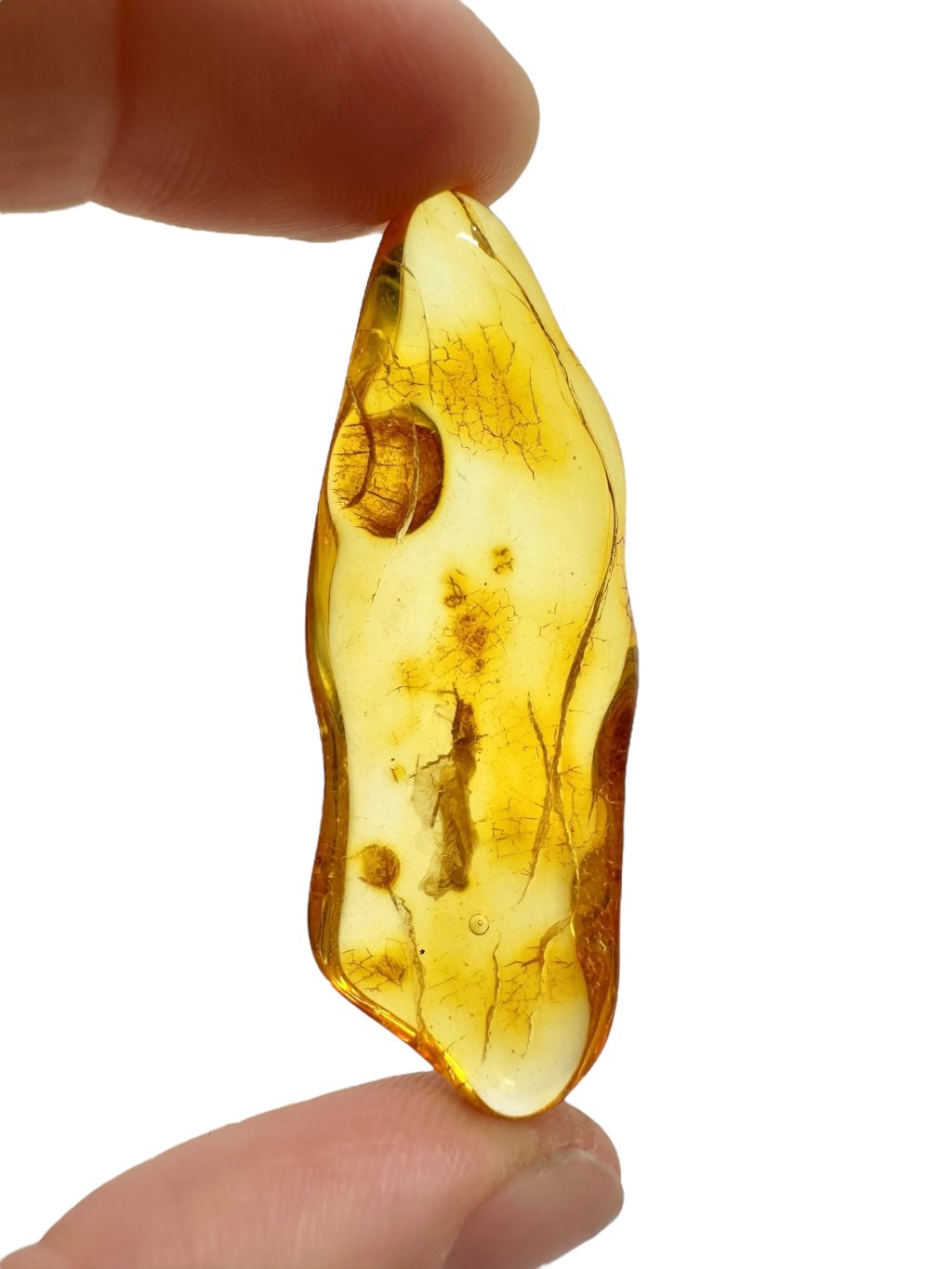 Lithuanian amber is known for its distinctive appearance, often ranging from light to dark yellow, with shades transitioning into warm honey or orange tones. There are also darker varieties—from brown to nearly black—and rarer ones that appear almost white or greenish. Due to its high content of succinic acid (up to around 8%), Baltic amber is considered higher quality compared to other types. It often contains natural inclusions such as air bubbles, plant fragments, or small insects, which significantly enhance its collector and aesthetic value.