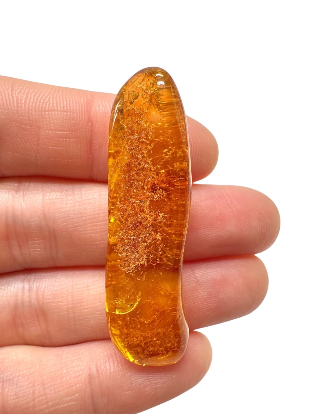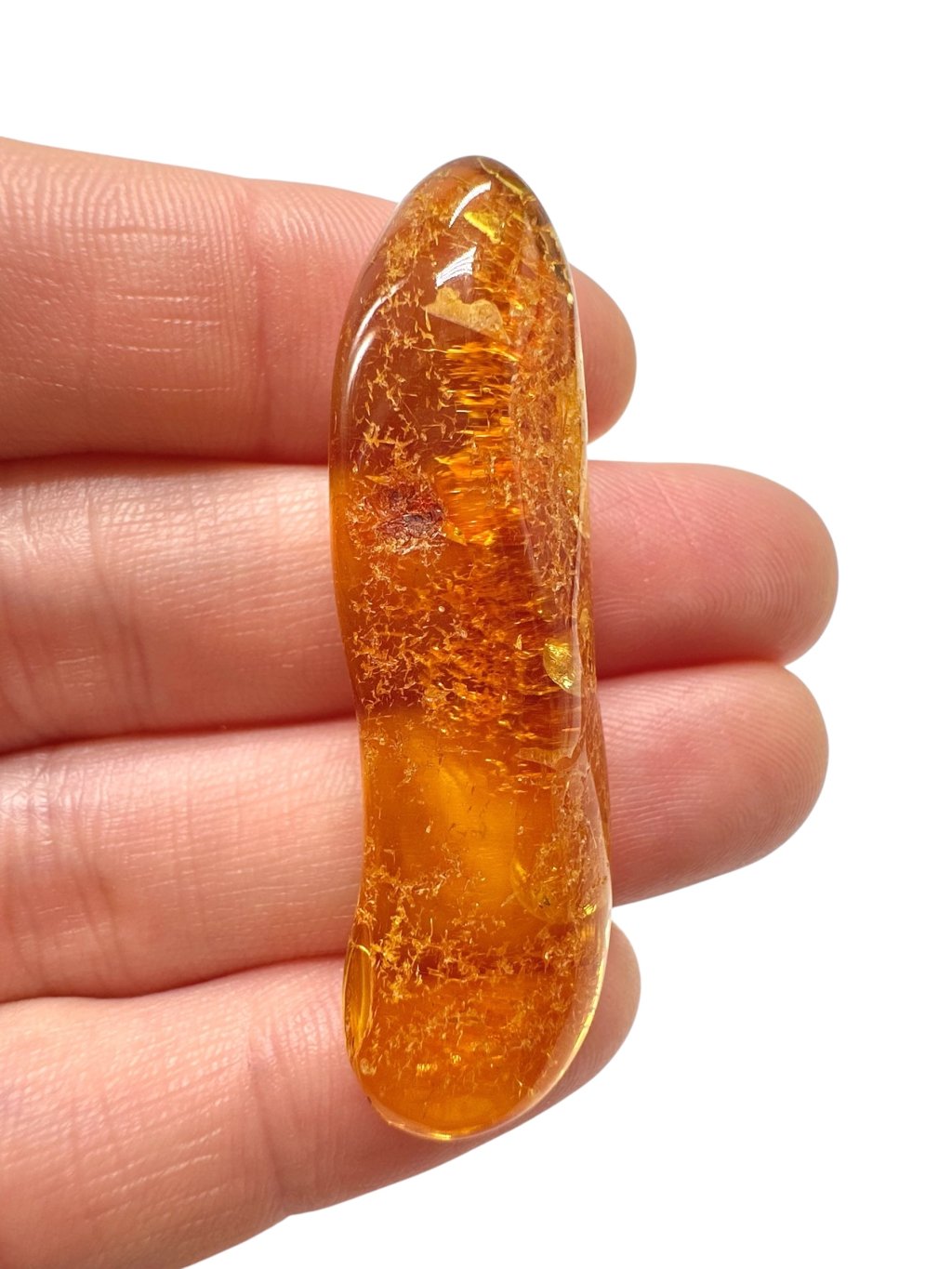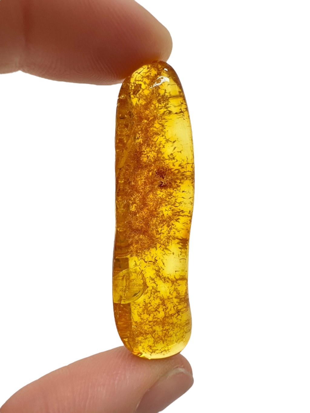 Lithuanian amber is known for its distinctive appearance, often ranging from light to dark yellow, with shades transitioning into warm honey or orange tones. There are also darker varieties—from brown to nearly black—and rarer ones that appear almost white or greenish. Due to its high content of succinic acid (up to around 8%), Baltic amber is considered higher quality compared to other types. It often contains natural inclusions such as air bubbles, plant fragments, or small insects, which significantly enhance its collector and aesthetic value.