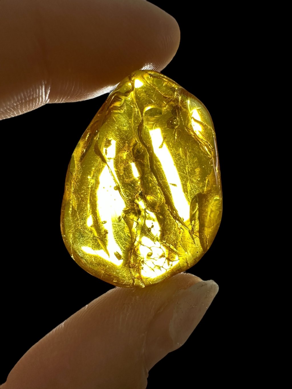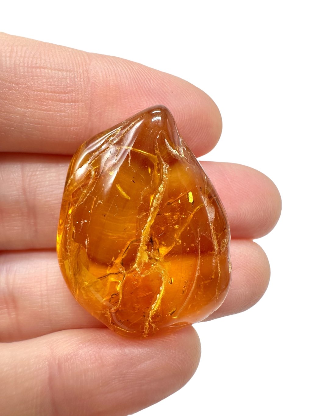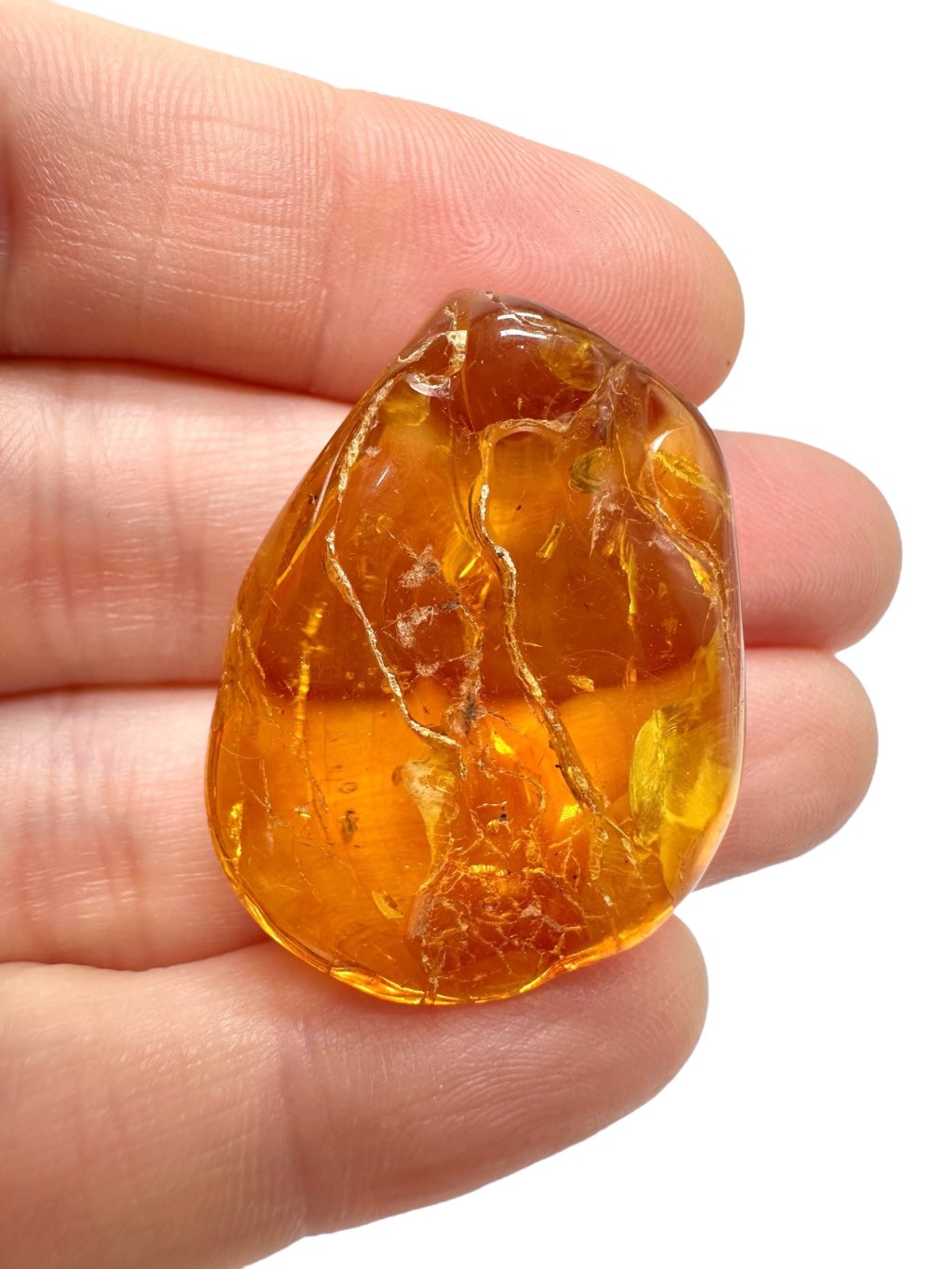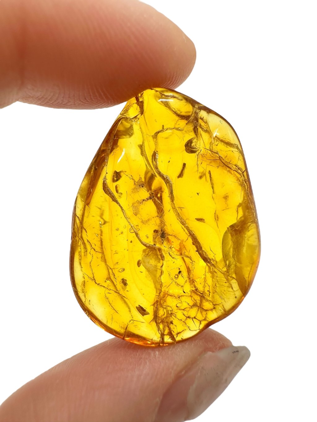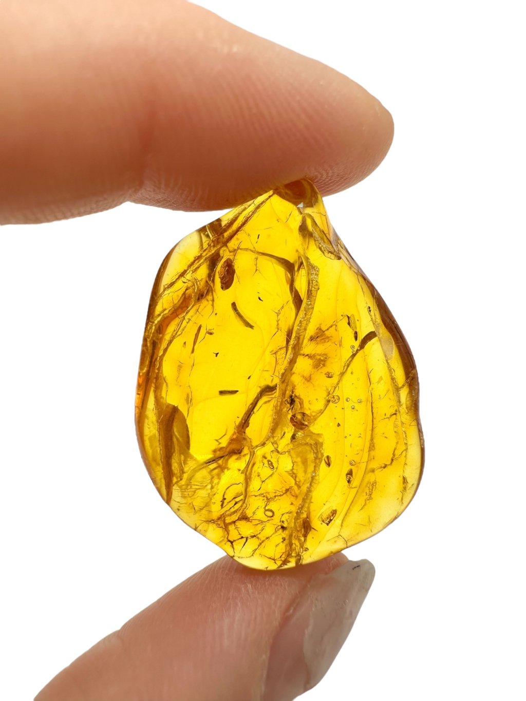 Lithuanian amber is known for its distinctive appearance, often ranging from light to dark yellow, with shades transitioning into warm honey or orange tones. There are also darker varieties—from brown to nearly black—and rarer ones that appear almost white or greenish. Due to its high content of succinic acid (up to around 8%), Baltic amber is considered higher quality compared to other types. It often contains natural inclusions such as air bubbles, plant fragments, or small insects, which significantly enhance its collector and aesthetic value.