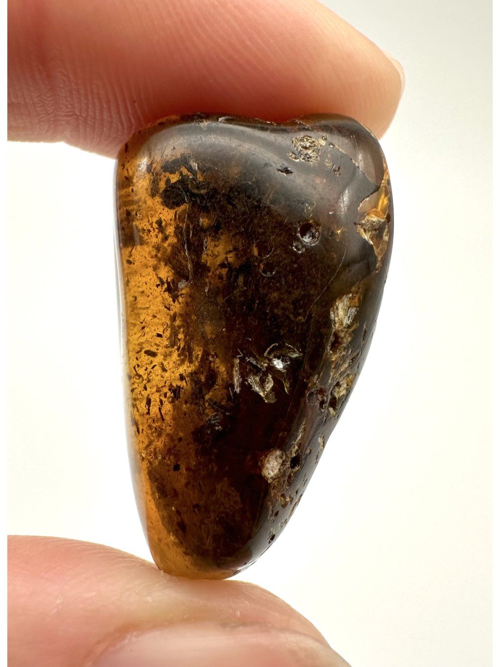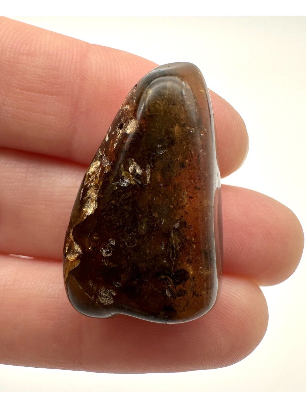 Polish amber is also renowned for its exceptionally well-preserved inclusions. The most common inclusions are small fossils of prehistoric insects – such as flies, mosquitoes, wasps, beetles, termites, or ants. These specimens often preserve fine details of the body and wings. Rare but fascinating are plant inclusions, including conifer needles, pollen grains, leaf fragments, moss, or lichen. These remains come from the prehistoric forests that once covered what is now Northern Europe. Also rarer but striking are inclusions of spiders, centipedes, mites, or larvae.