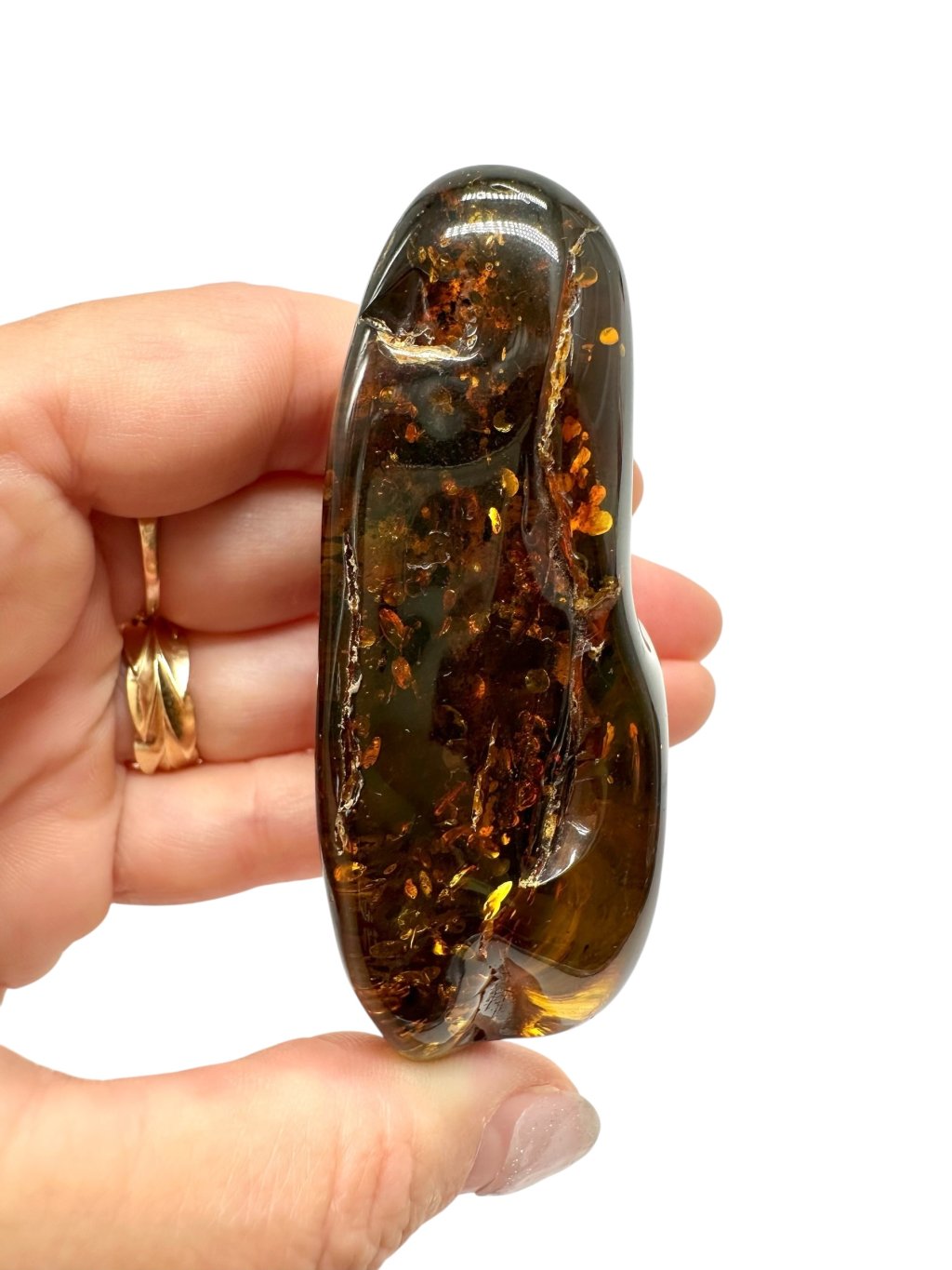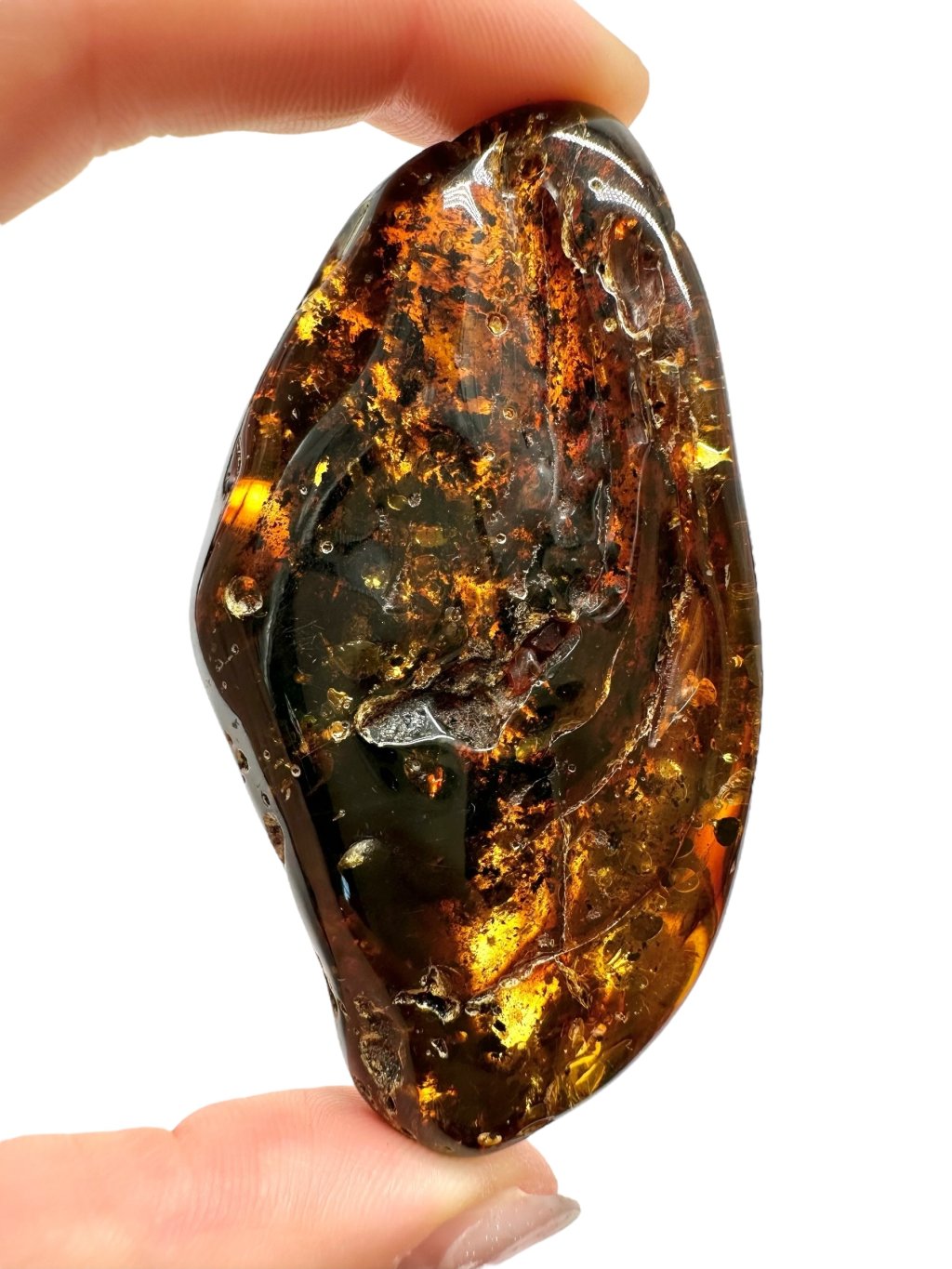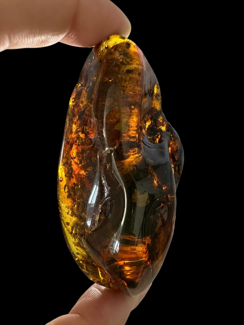 Note: The introductory photo was taken with the amber held between fingers, allowing light to pass through, making it appear lighter than when it is placed on a surface.
