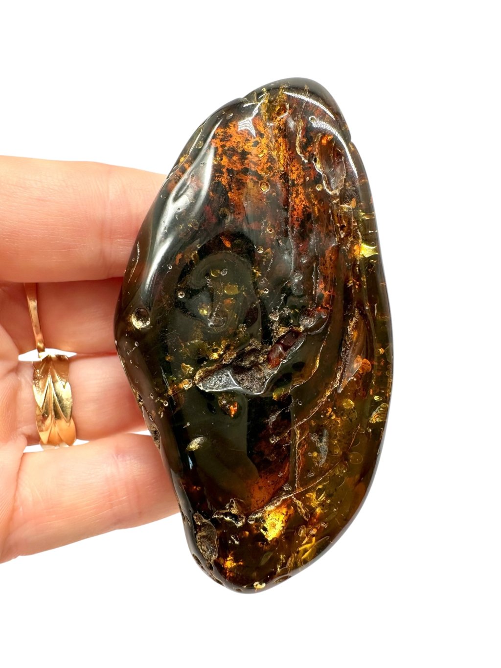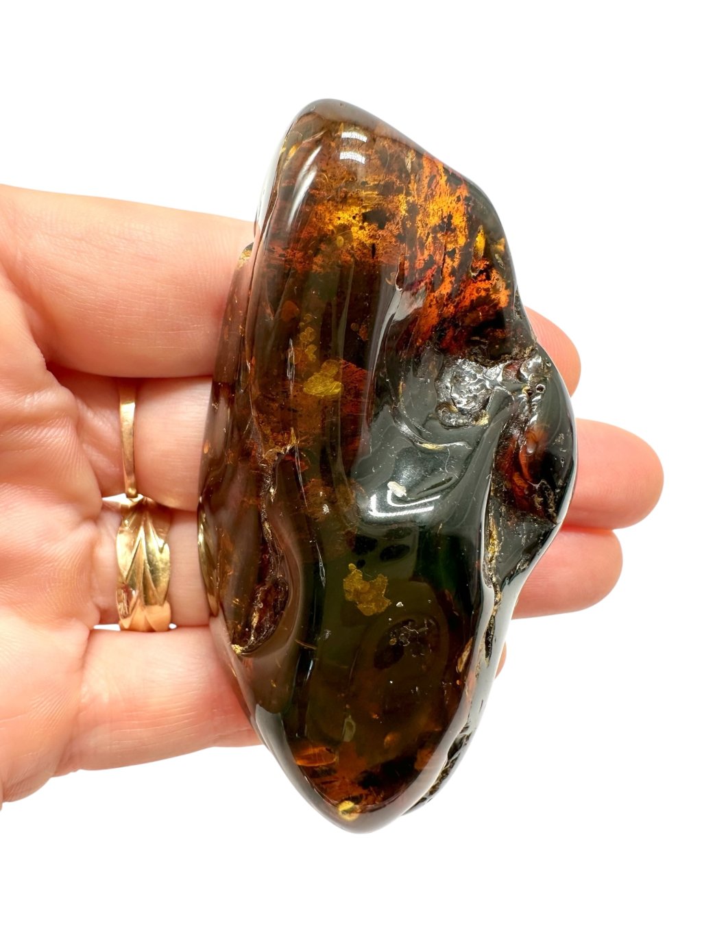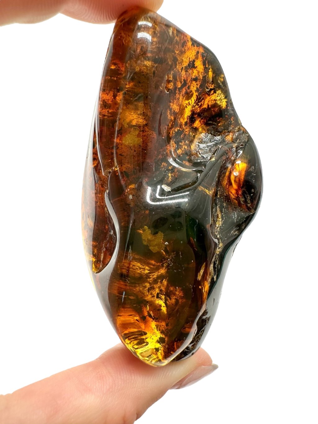 Note: The introductory photo was taken with the amber held between fingers, allowing light to pass through, making it appear lighter than when it is placed on a surface.