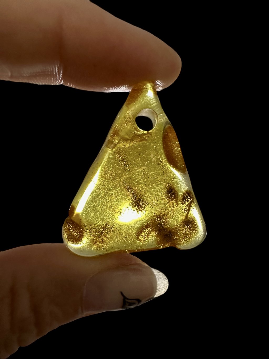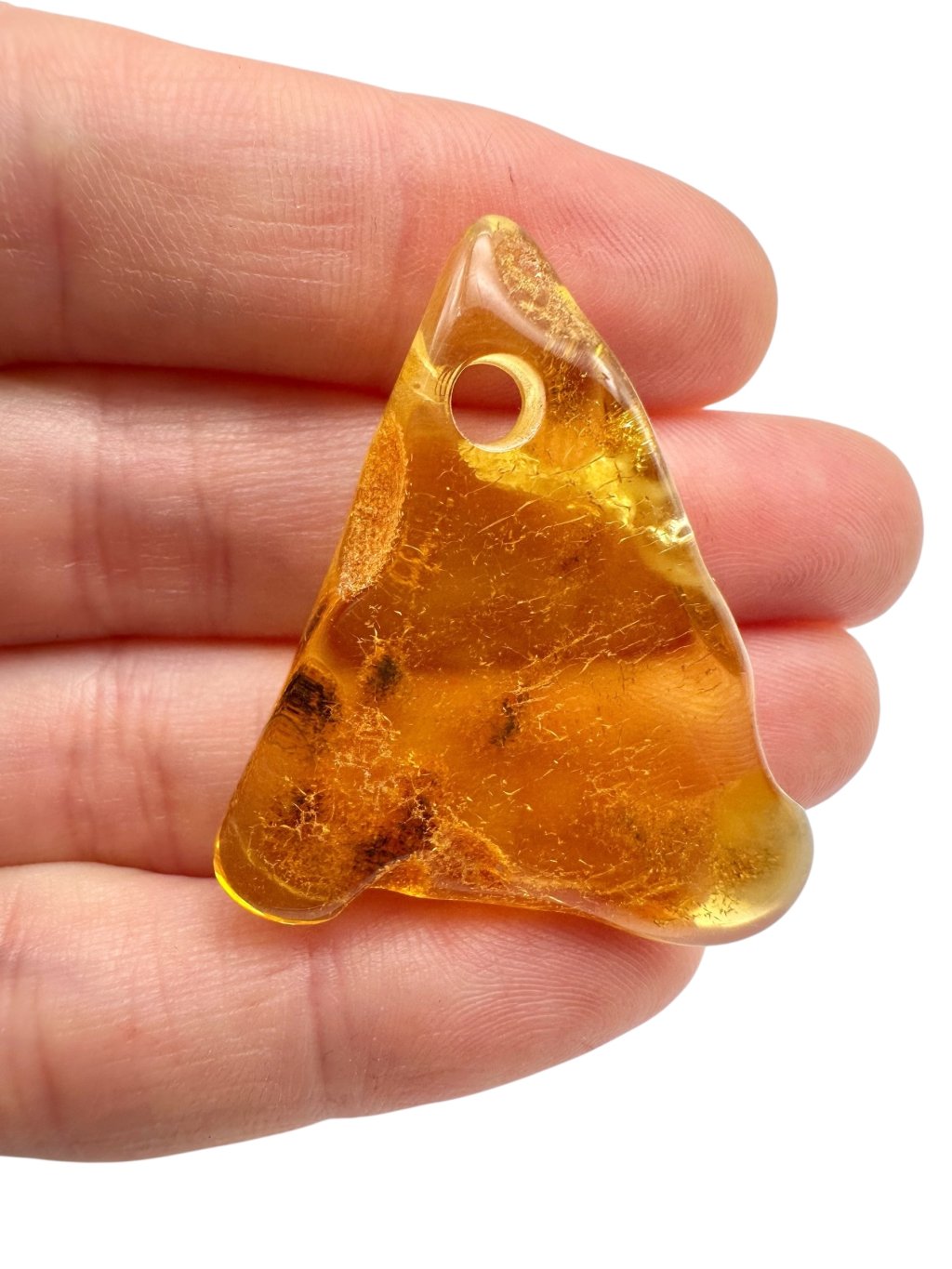 Lithuanian amber is known for its distinctive appearance, often ranging from light to dark yellow, with shades transitioning into warm honey or orange tones. There are also darker varieties—from brown to nearly black—and rarer ones that appear almost white or greenish. Due to its high content of succinic acid (up to around 8%), Baltic amber is considered higher quality compared to other types. It often contains natural inclusions such as air bubbles, plant fragments, or small insects, which significantly enhance its collector and aesthetic value.