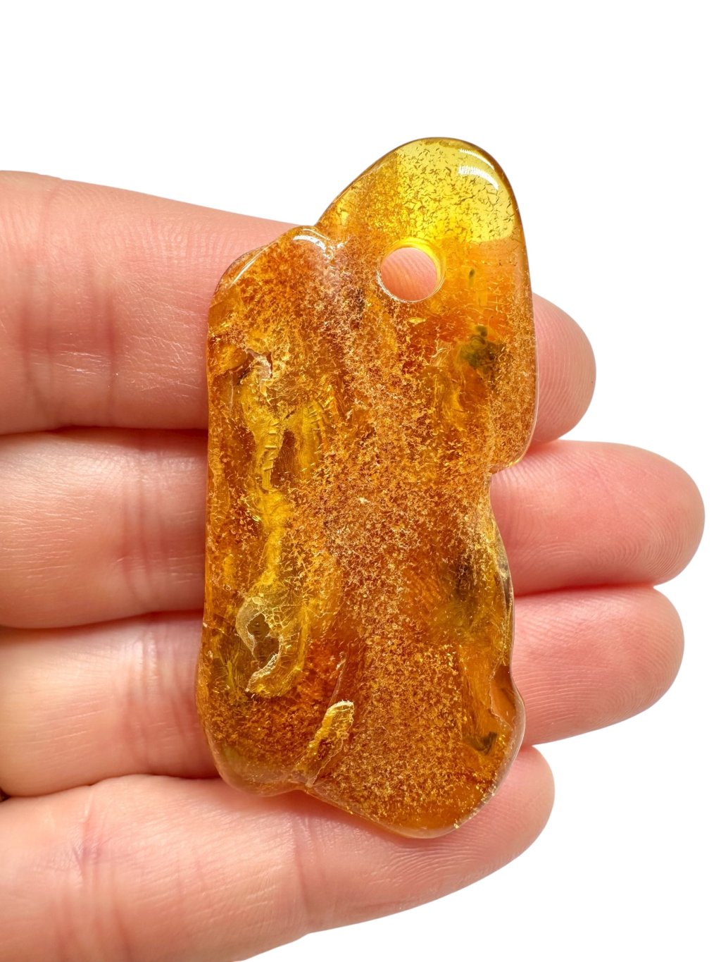 Lithuanian amber is known for its distinctive appearance, often ranging from light to dark yellow, with shades transitioning into warm honey or orange tones. There are also darker varieties—from brown to nearly black—and rarer ones that appear almost white or greenish. Due to its high content of succinic acid (up to around 8%), Baltic amber is considered higher quality compared to other types. It often contains natural inclusions such as air bubbles, plant fragments, or small insects, which significantly enhance its collector and aesthetic value.