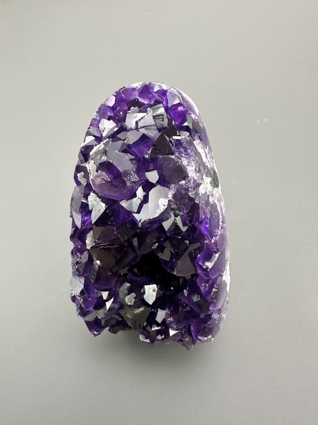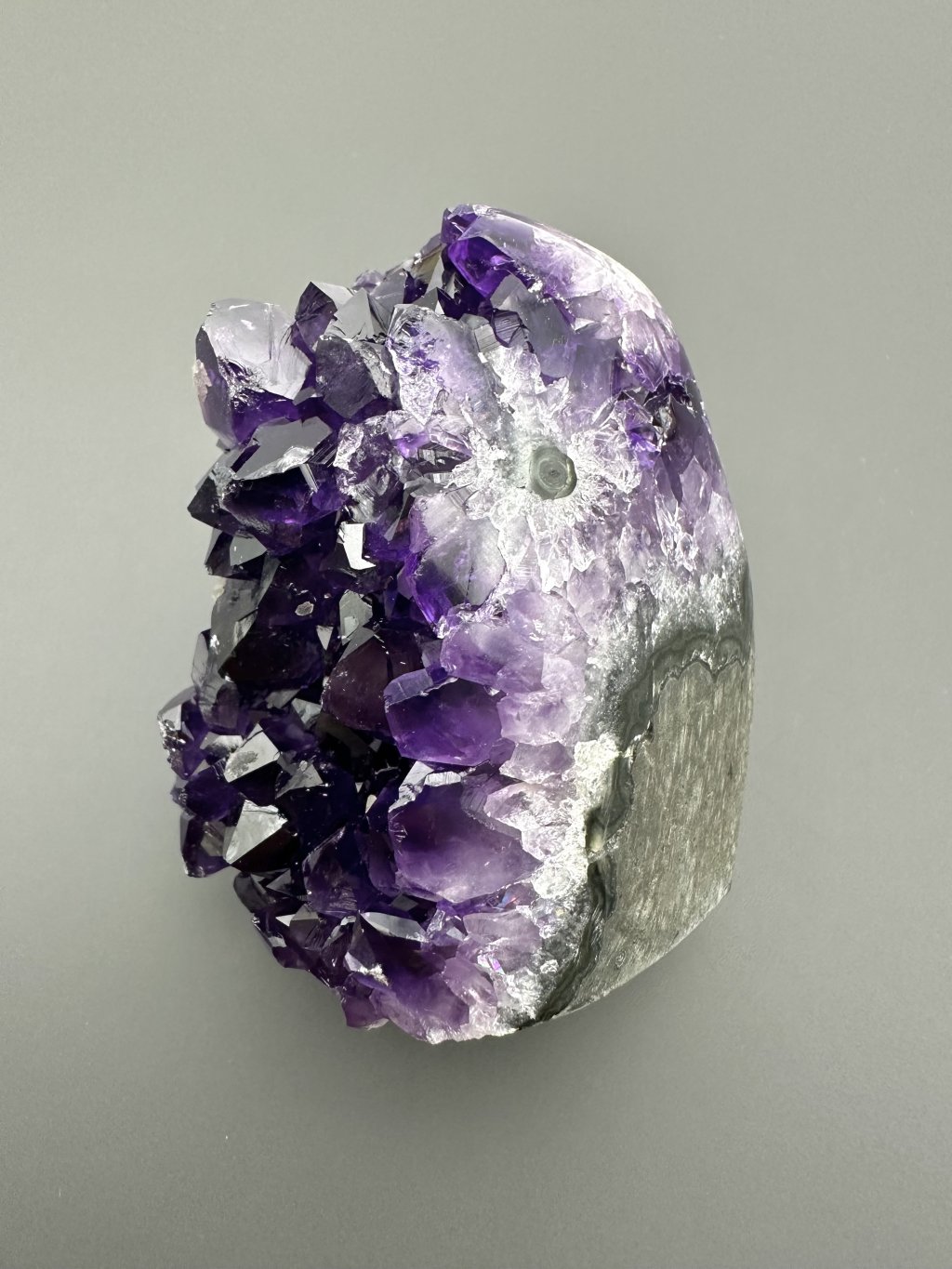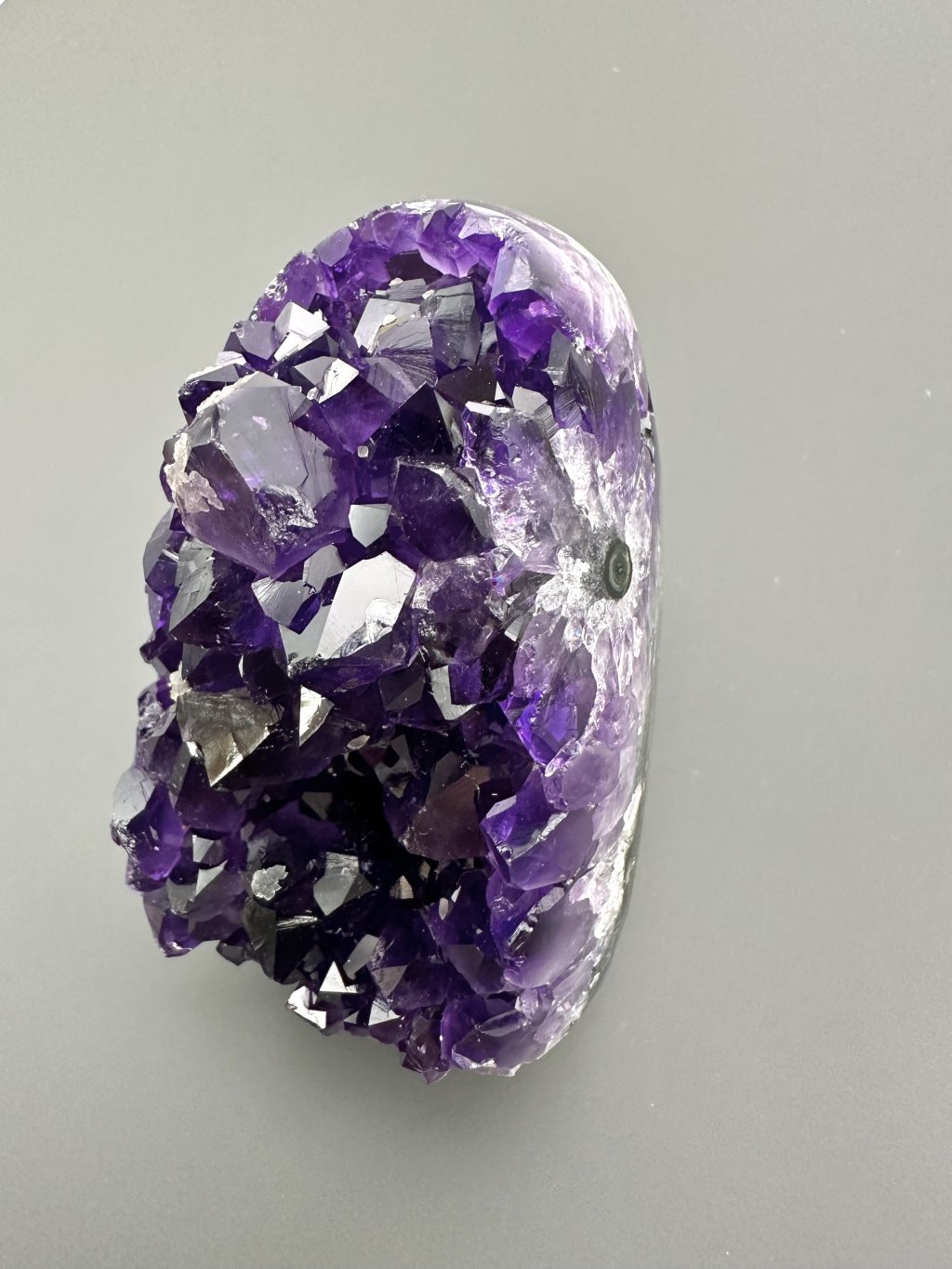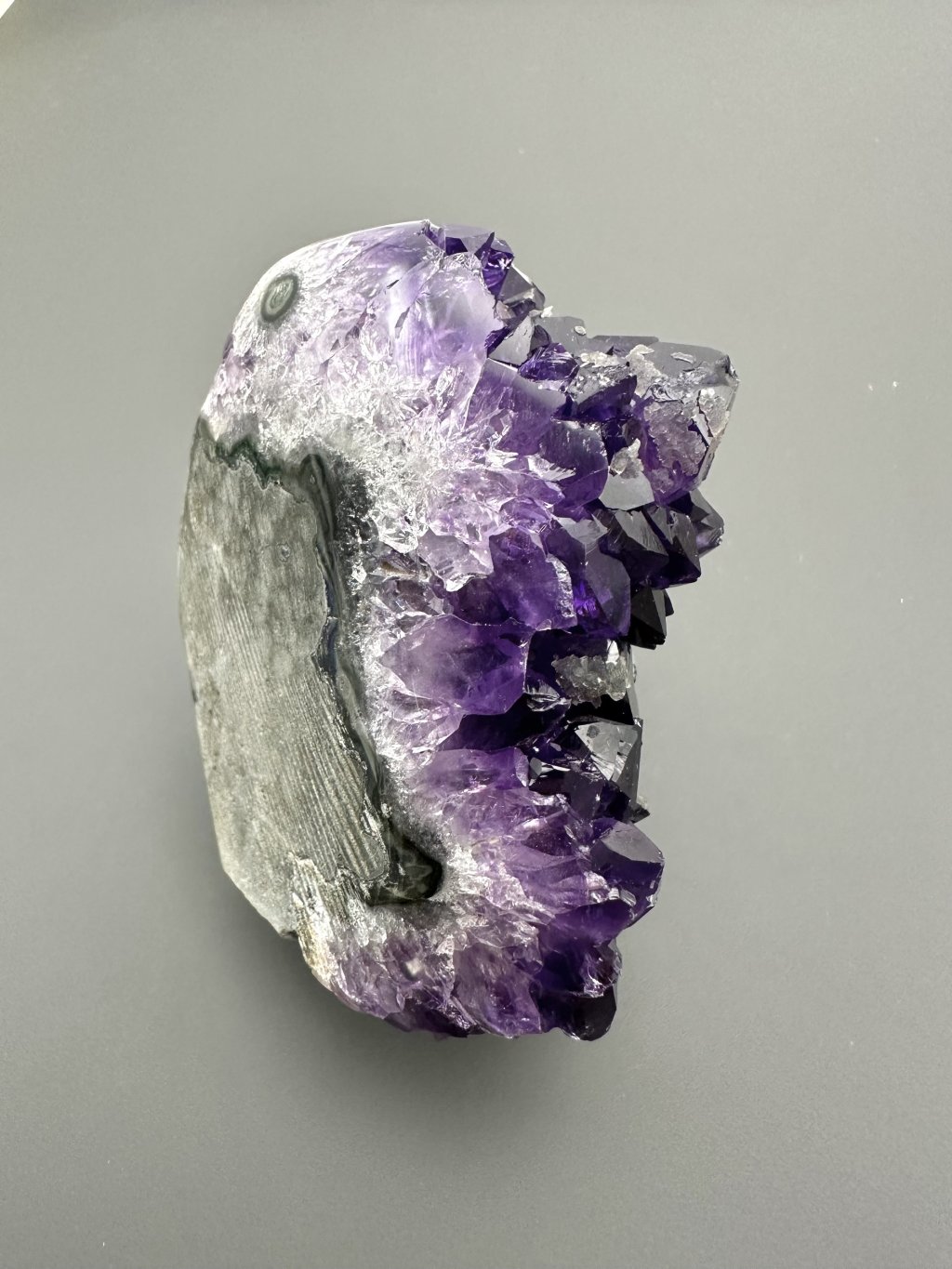 Amethyst geodes usually boast a deep purple colour. Amethyst crystals can be small and densely clustered, or larger and more spatially distinctive, which only adds to their aesthetic appeal. Each geode is unique and you will often see elongated, semi-circular or so-called "cathedral" shapes that are tall and columnar, but there are other interesting and less common variations.