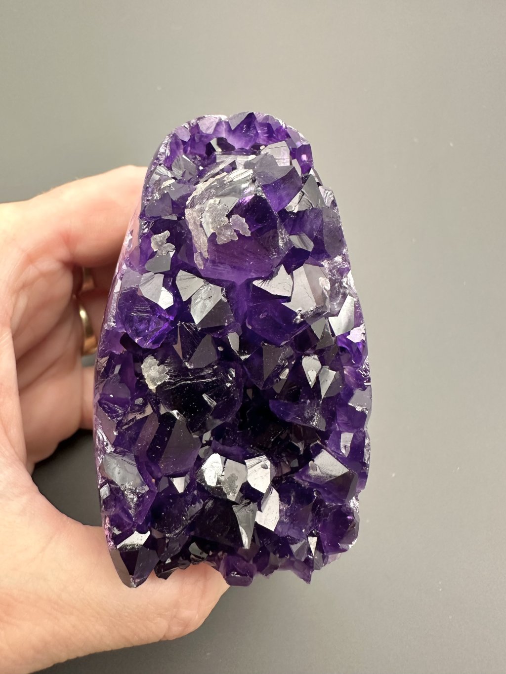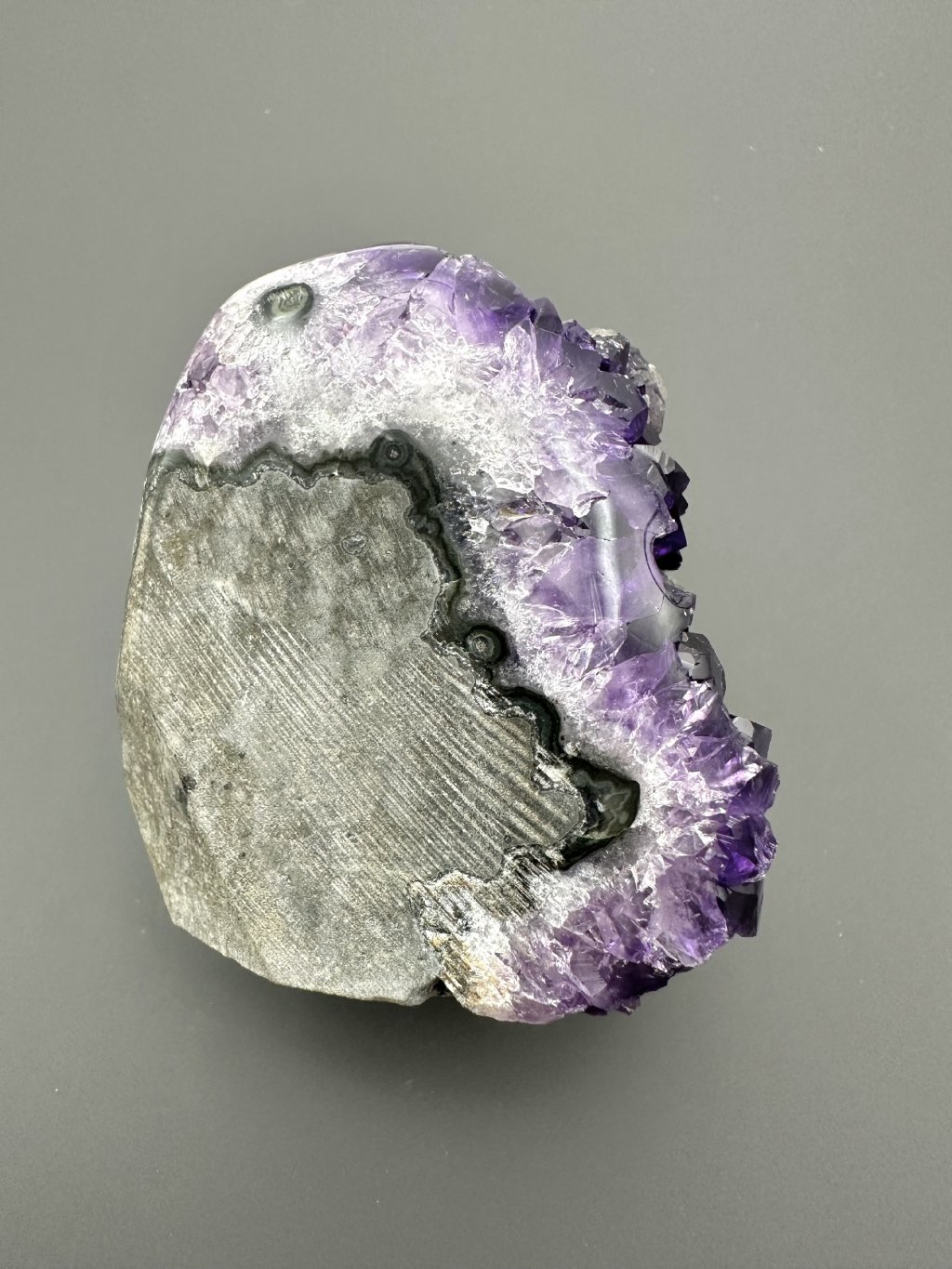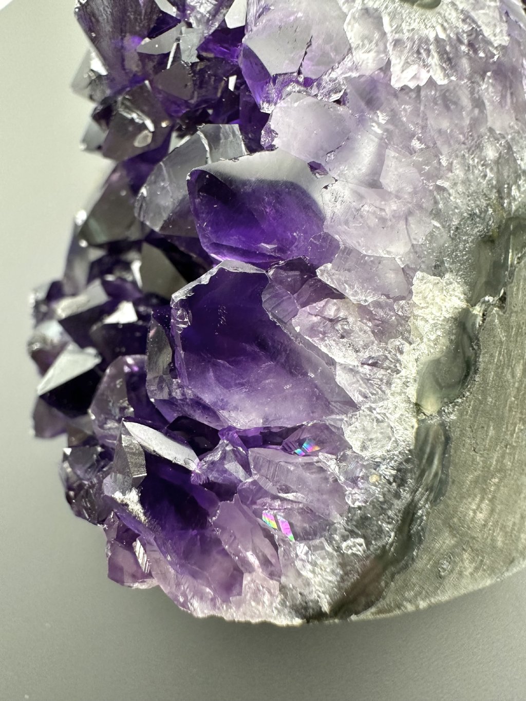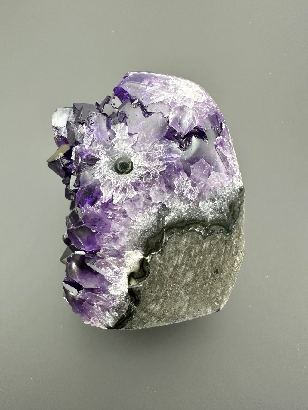 Amethyst geodes usually boast a deep purple colour. Amethyst crystals can be small and densely clustered, or larger and more spatially distinctive, which only adds to their aesthetic appeal. Each geode is unique and you will often see elongated, semi-circular or so-called "cathedral" shapes that are tall and columnar, but there are other interesting and less common variations.