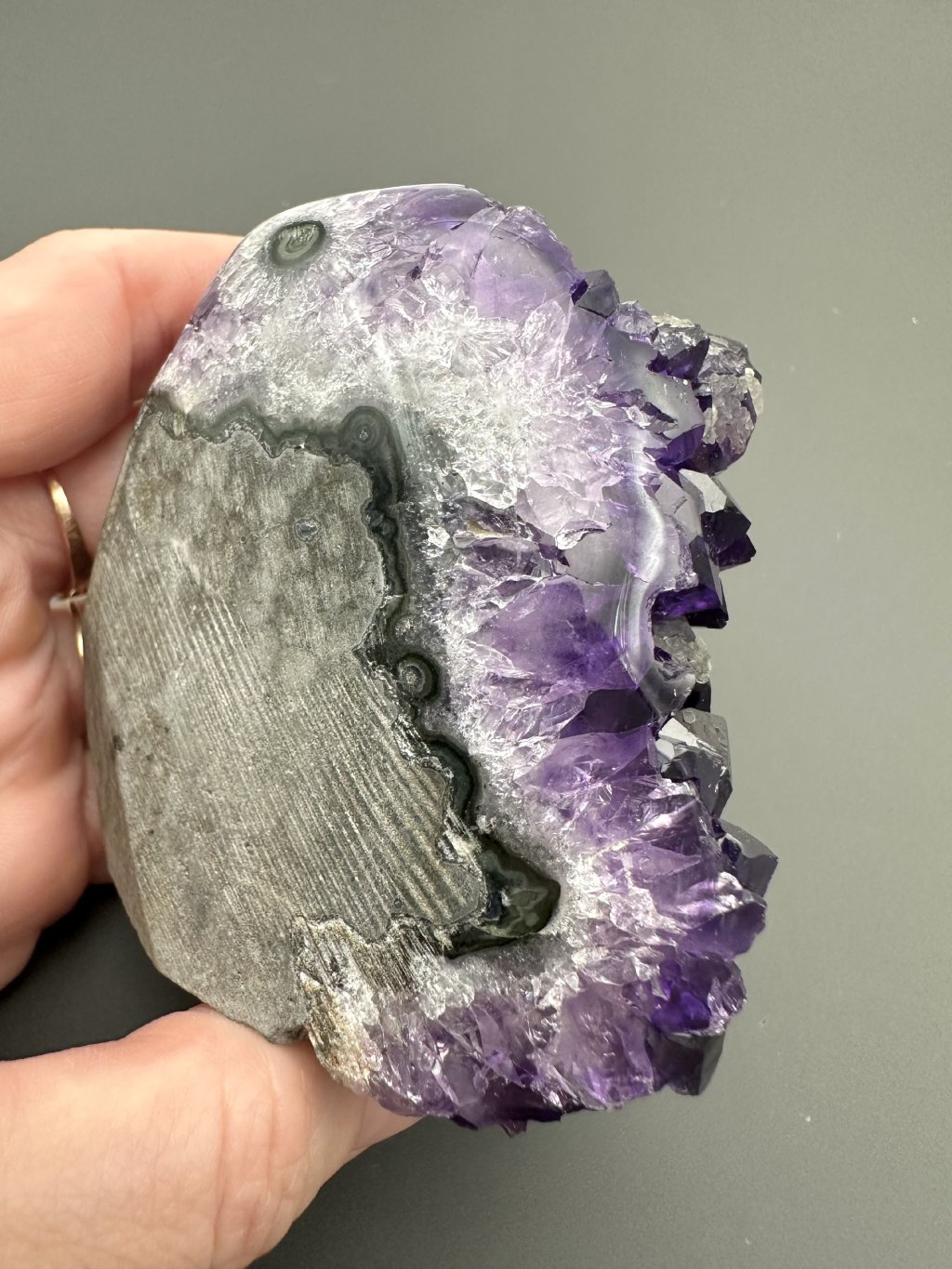 Amethyst geodes are among the most popular and impressive gemstones. They form inside cavities in volcanic rocks that gradually fill with mineral solutions rich in silica and other elements. During long geological processes, crystals of amethyst - a purple variety of quartz - form in these cavities. Amethysts from Uruguay are sought after worldwide for their extraordinary richness and depth of purple colour. Their crystals are often smaller and densely arranged, emphasizing the intensity of the hue and the distinctive brilliance.
