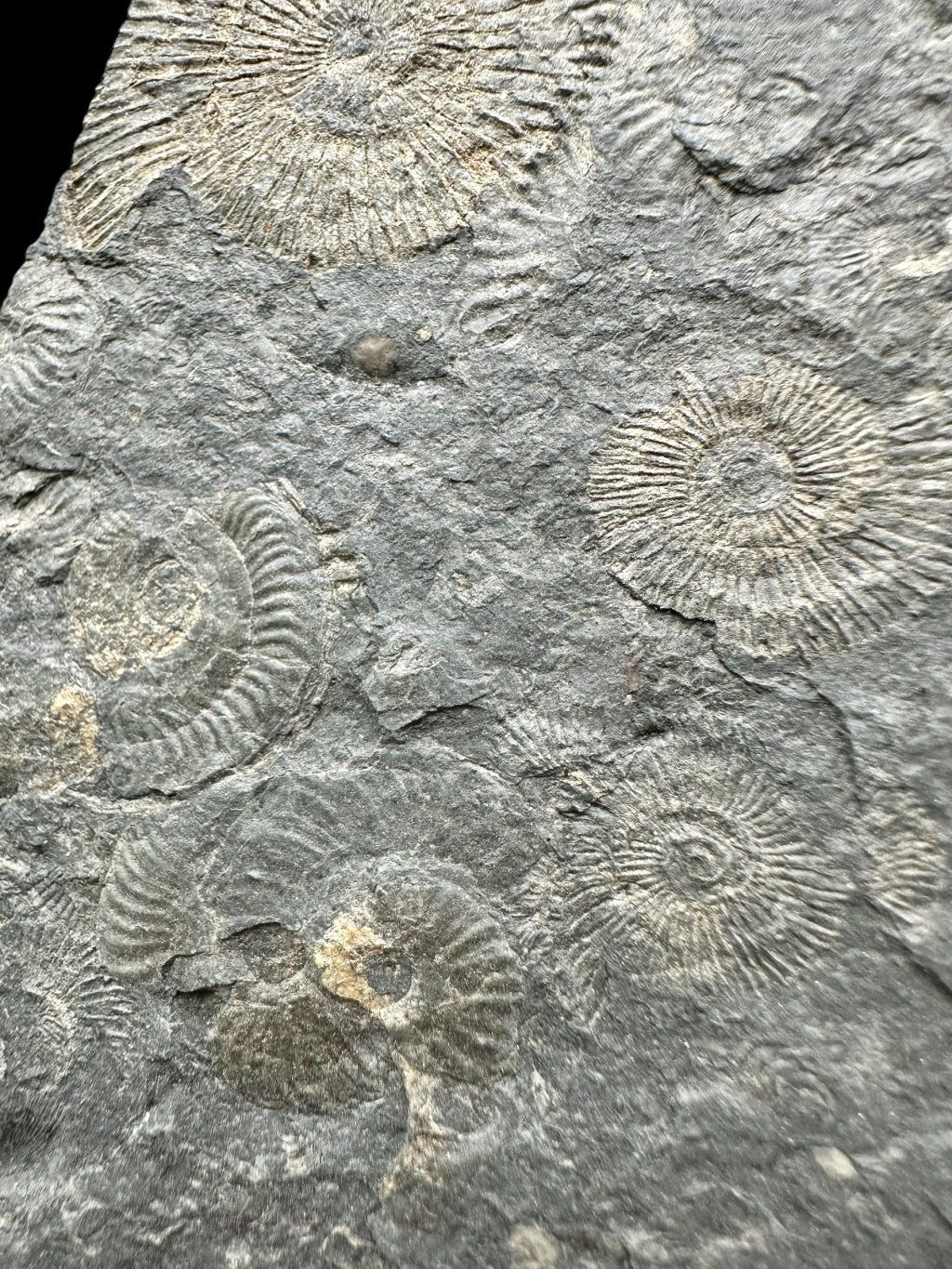 Fossils from the Holzmaden locality are valued for their exceptional state of preservation. The dark shales formed in an environment with very low oxygen levels on the sea floor, which significantly slowed the decomposition of dead organisms. As a result, ammonite shells are often preserved in very good condition and sometimes even with fine details. Some specimens may also be mineralized with pyrite, giving them a striking metallic golden appearance.