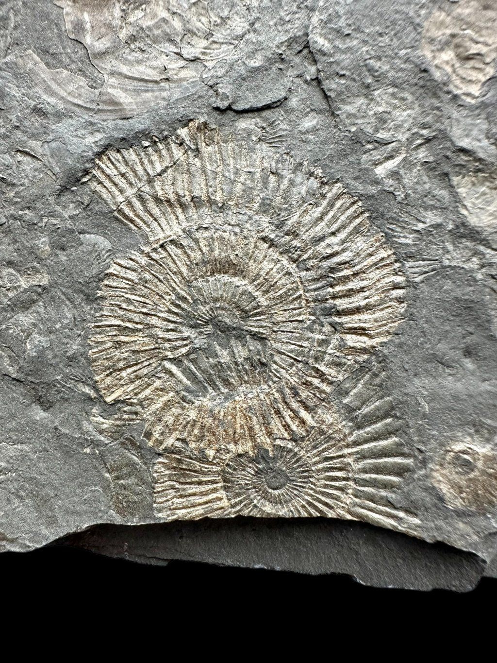 The ammonite Dactylioceras is typical for its spirally coiled shell, which usually has a flat disc-shaped form. The surface of the shell is decorated with pronounced radial ribbing, with individual ribs often branching toward the outer edge. This feature is highly characteristic of the genus Dactylioceras and allows relatively easy identification. The shell size is usually several centimetres, most commonly between three and ten centimetres.