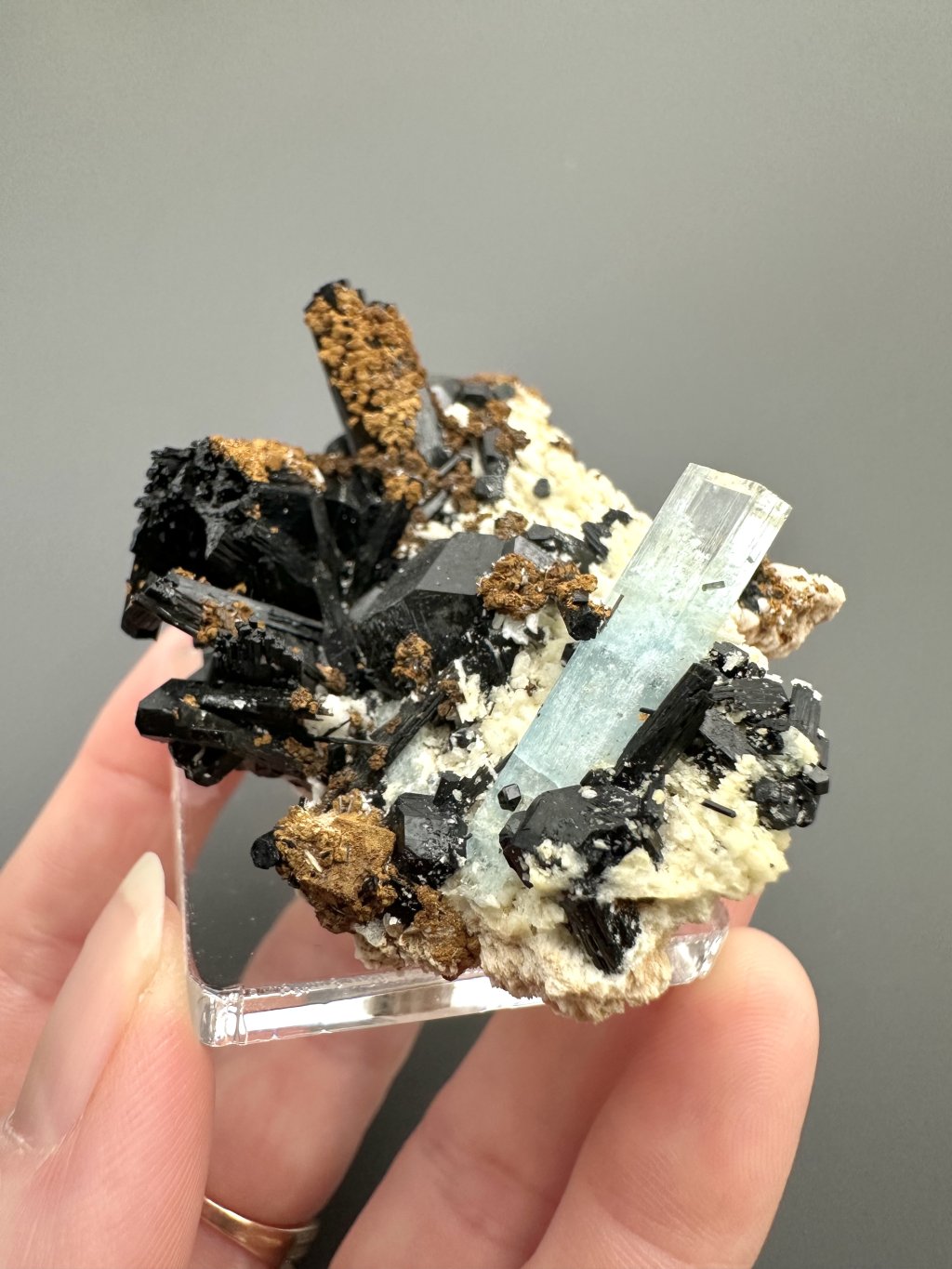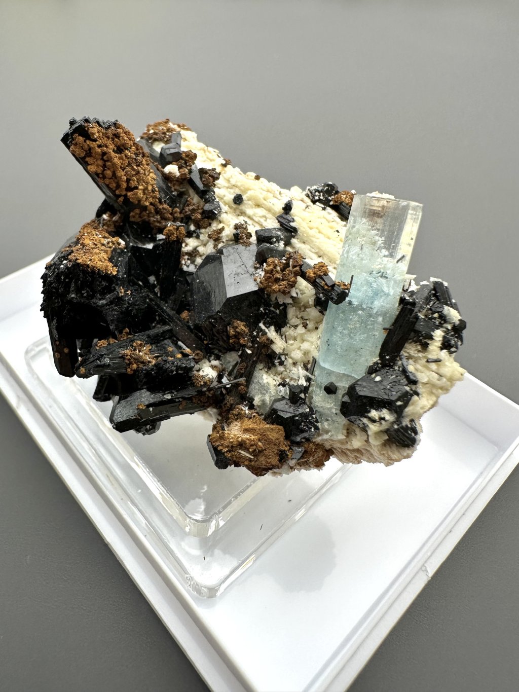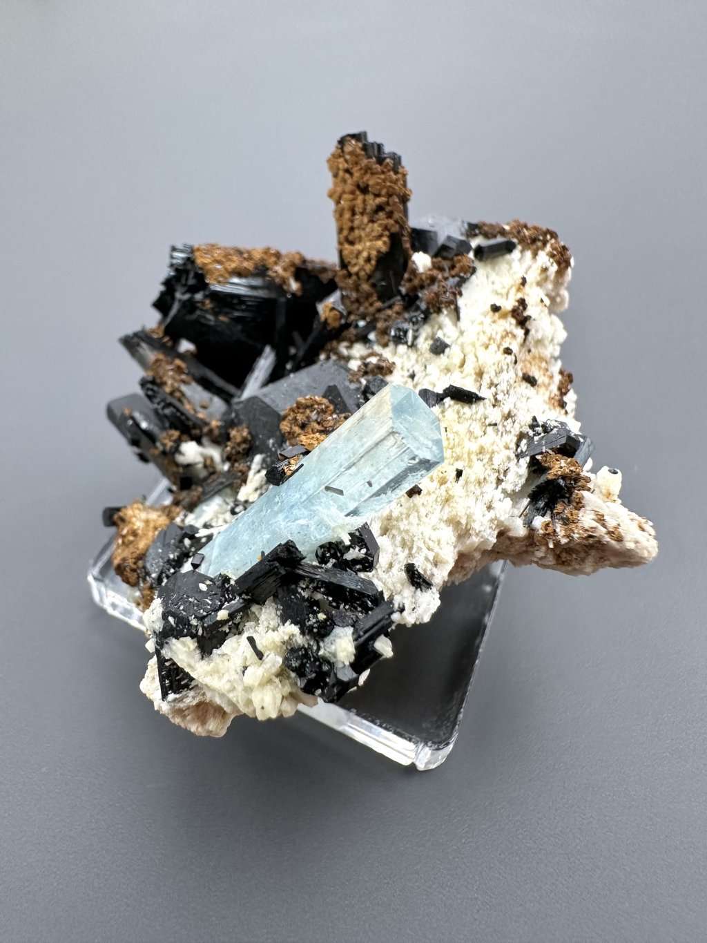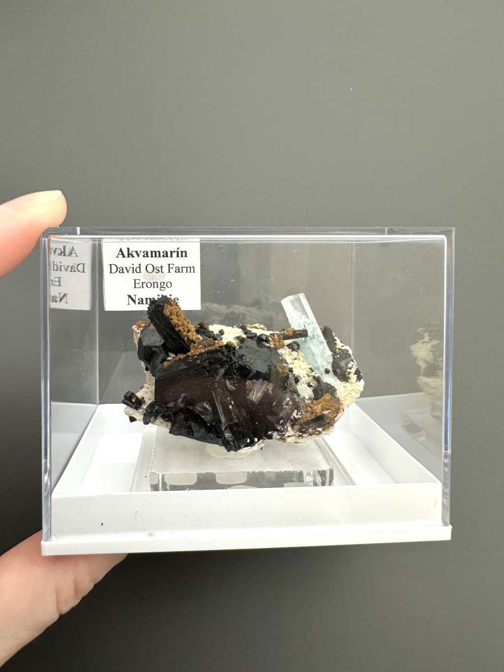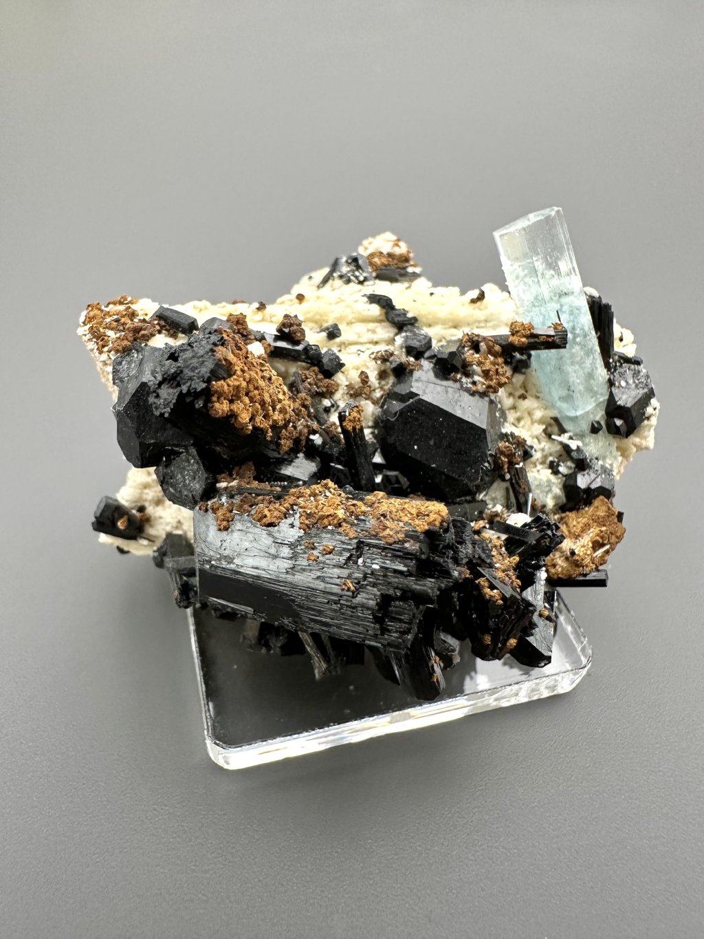 - Black tourmaline (scoria): In the Erongo area, aquamarines are often found together with black tourmaline. Crystals of tourmaline and aquamarine can develop side by side in the pegmatites, creating an attractive contrast between the clear blue of the aquamarine and the darker shades of tourmaline.