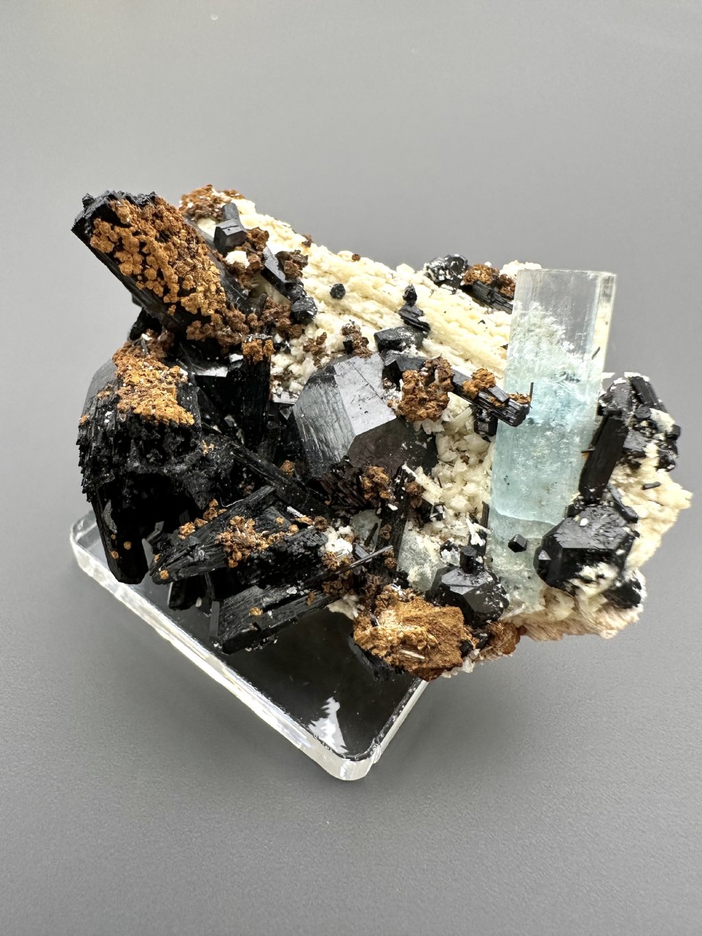 Aquamarine from the Erongo area of Namibia often forms compositions with other minerals commonly found in the pegmatites of the area. The most common combinations include: