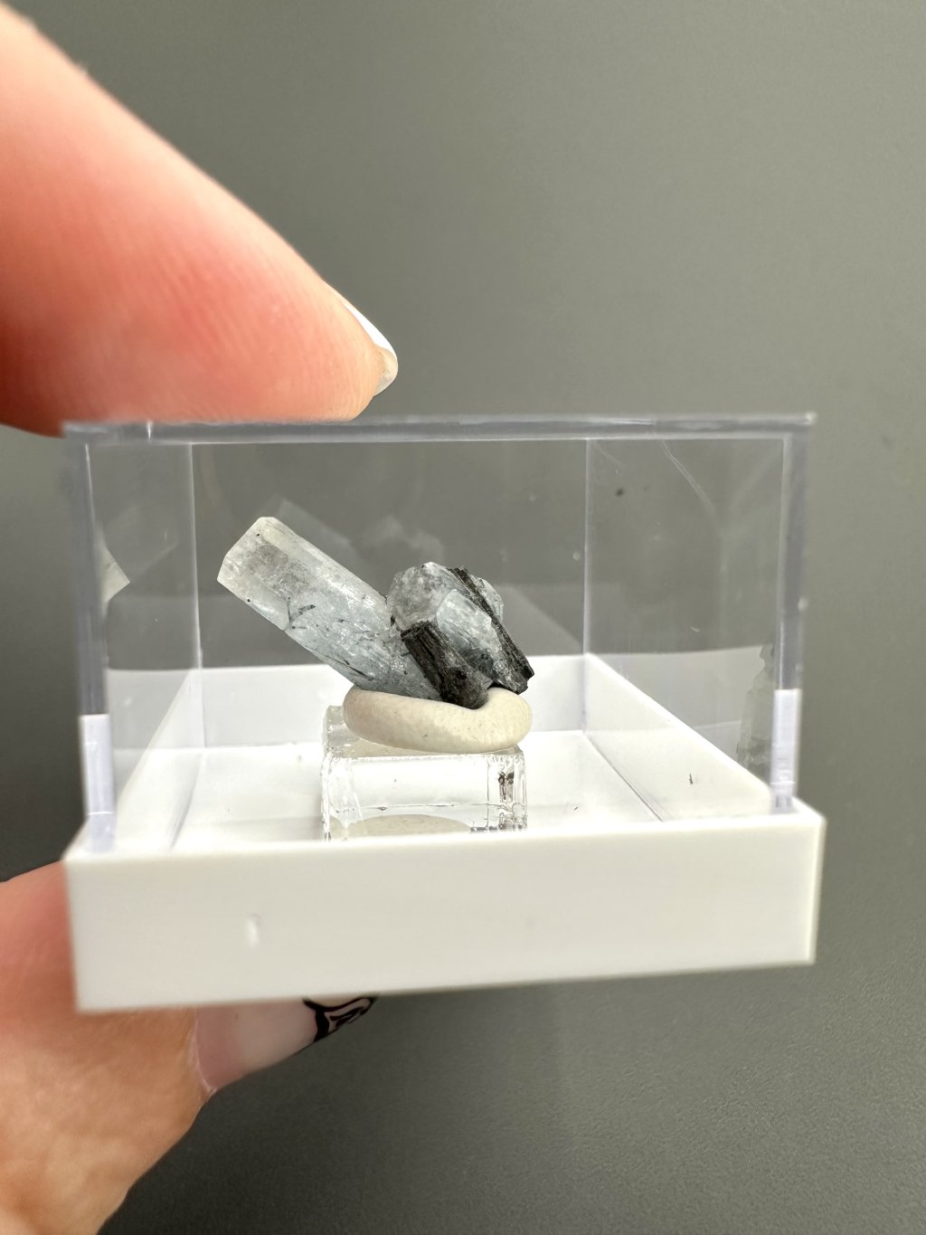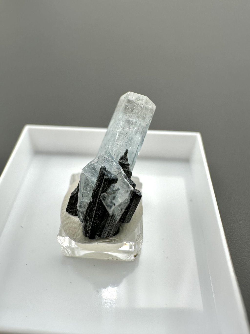 - Black tourmaline (scoria): In the Erongo area, aquamarines are often found together with black tourmaline. Crystals of tourmaline and aquamarine can develop side by side in the pegmatites, creating an attractive contrast between the clear blue of the aquamarine and the darker shades of tourmaline.