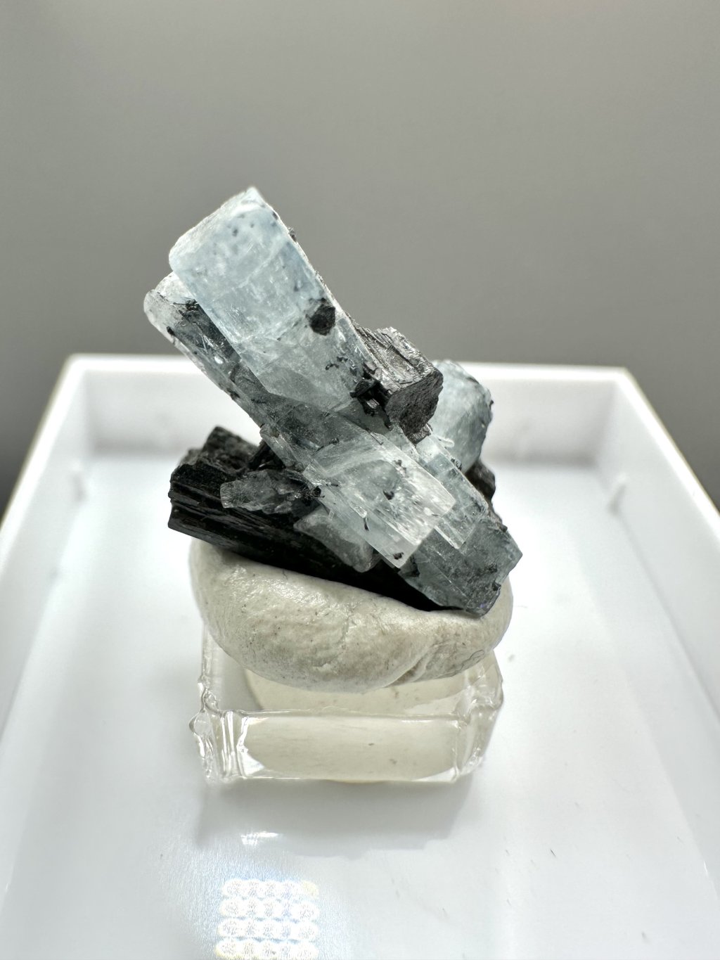 - Black tourmaline (scoria): In the Erongo area, aquamarines are often found together with black tourmaline. Crystals of tourmaline and aquamarine can develop side by side in the pegmatites, creating an attractive contrast between the clear blue of the aquamarine and the darker shades of tourmaline.